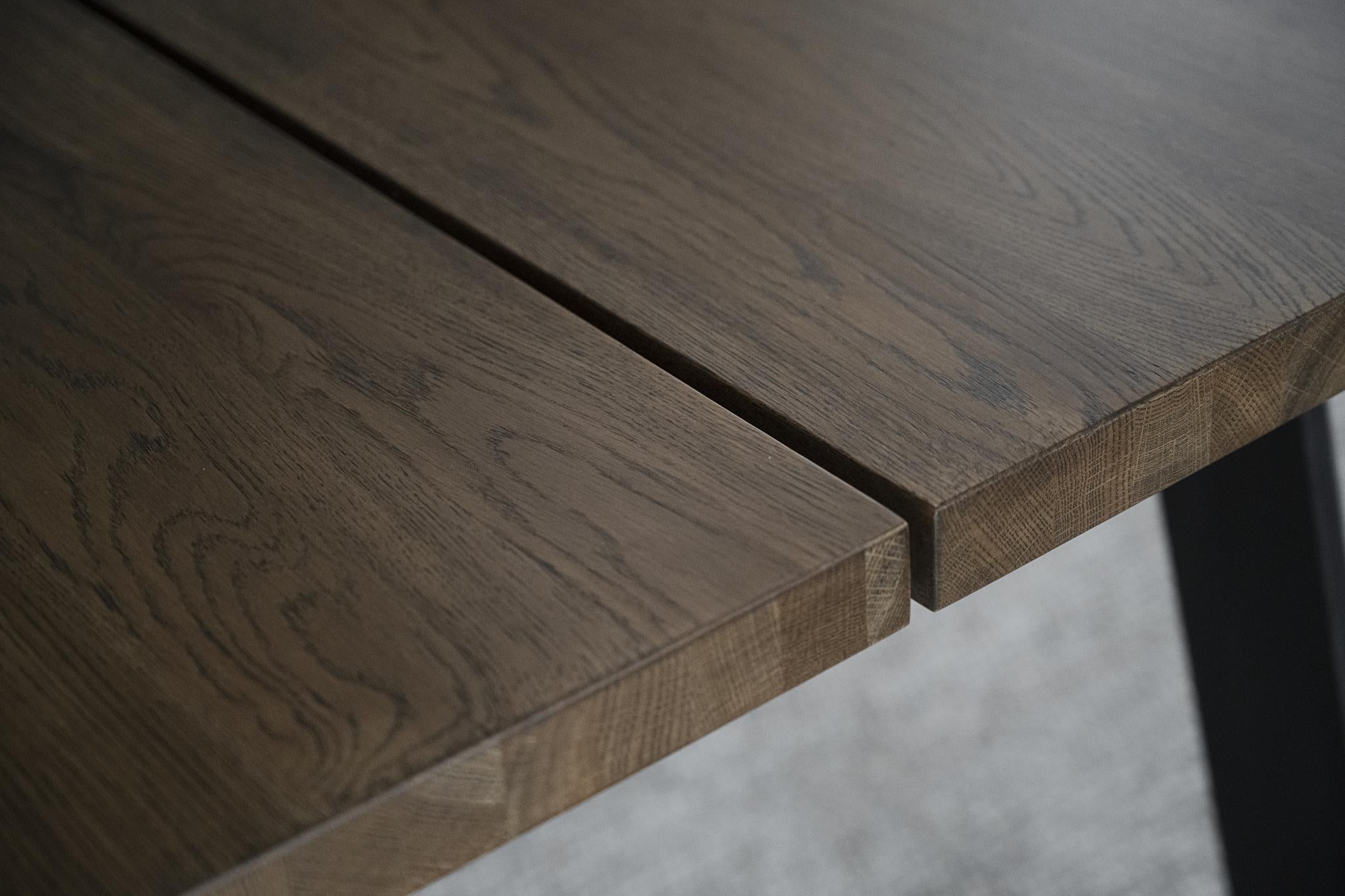 • Närbildsdetalj av bordsplatta i ek med svarta metallben, visar trästruktur och hantverk