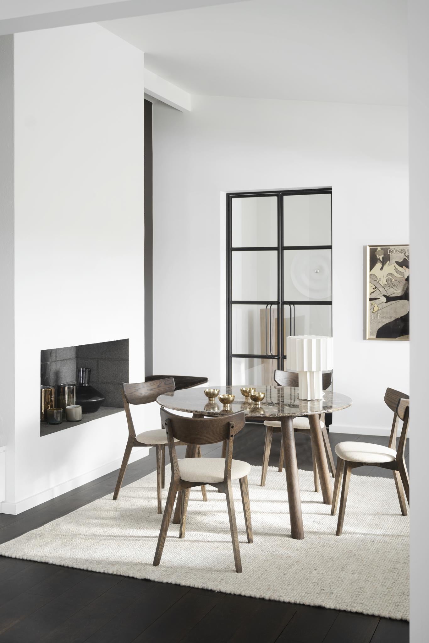 • Rund matbord i trä med stolar i modern matsal med vit matta och svarta detaljer
