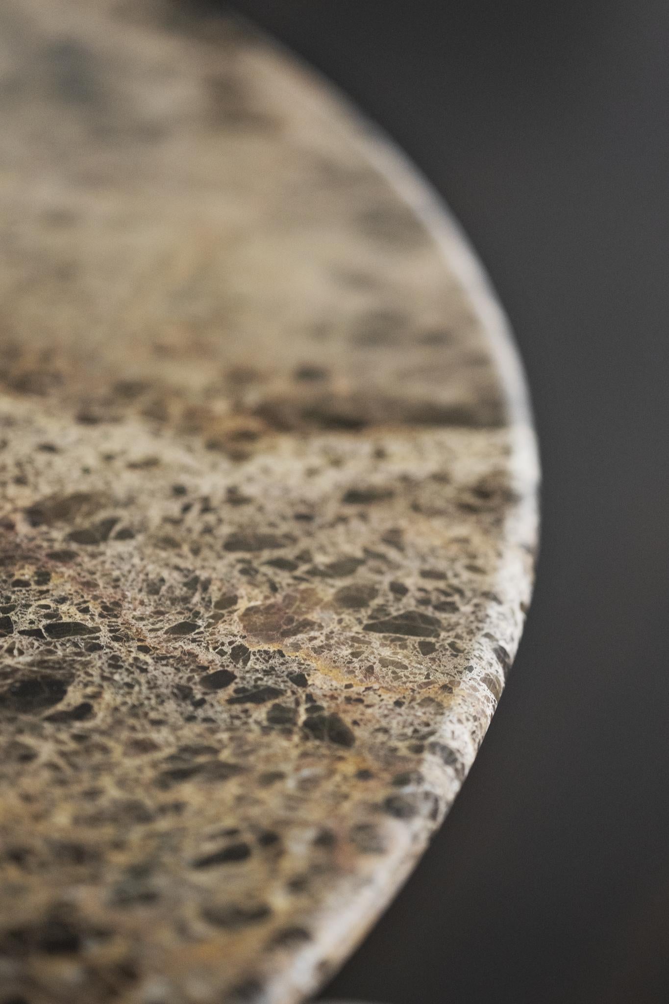 • Rund bänkskiva i terrazzo med spräcklig beige och brun yta mot mörk bakgrund