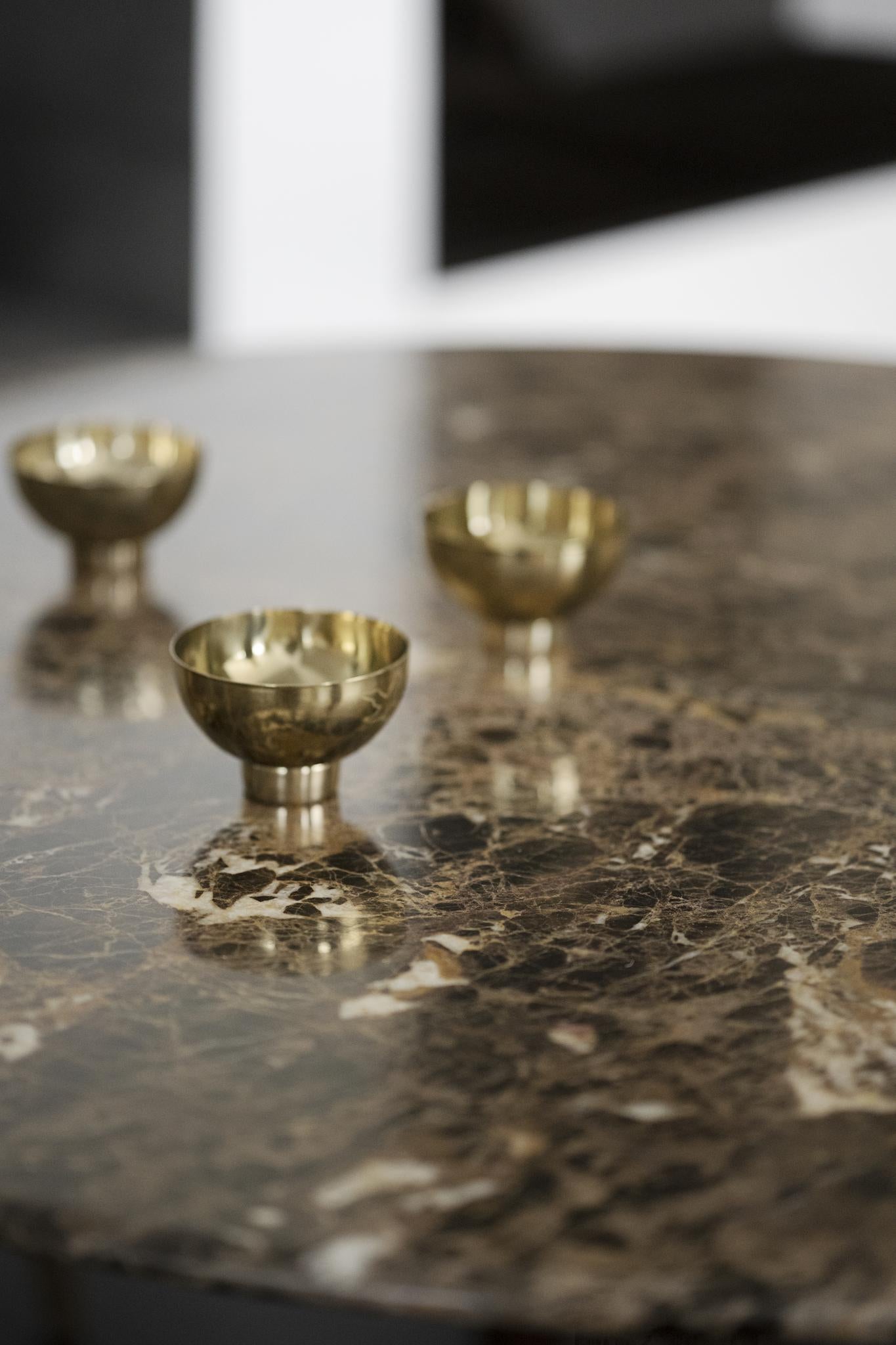 • Gyllene ljusstakar i mässing på marmorbord med modern inredning i bakgrunden