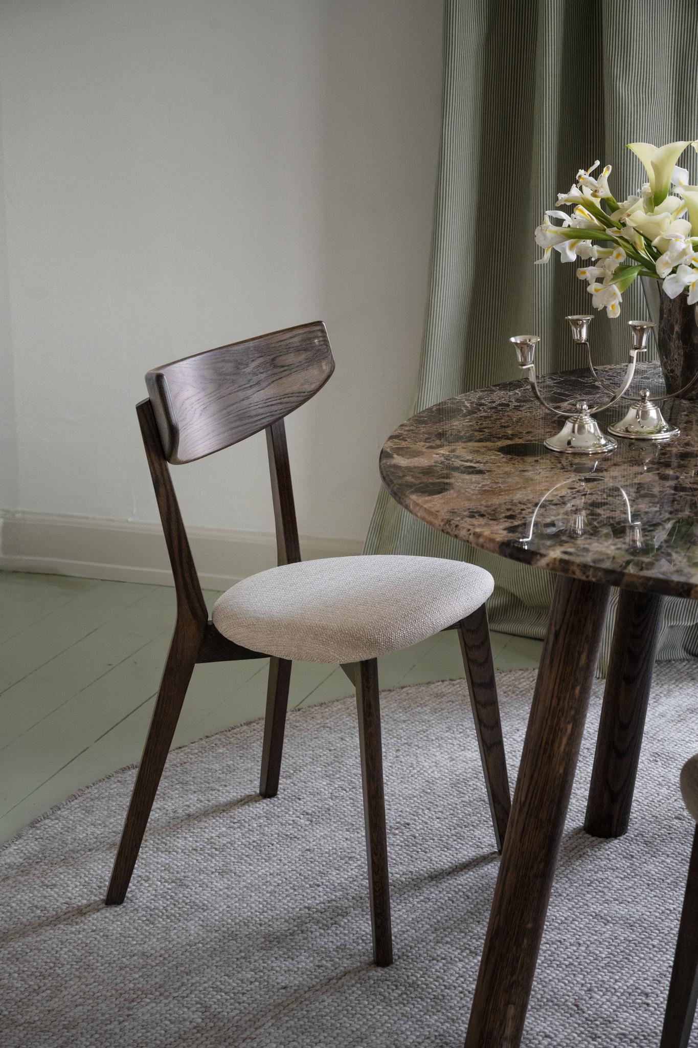 • Matstol i mörkbetsad ek med stoppad sits i ljust tyg vid runt marmorbord med blommor