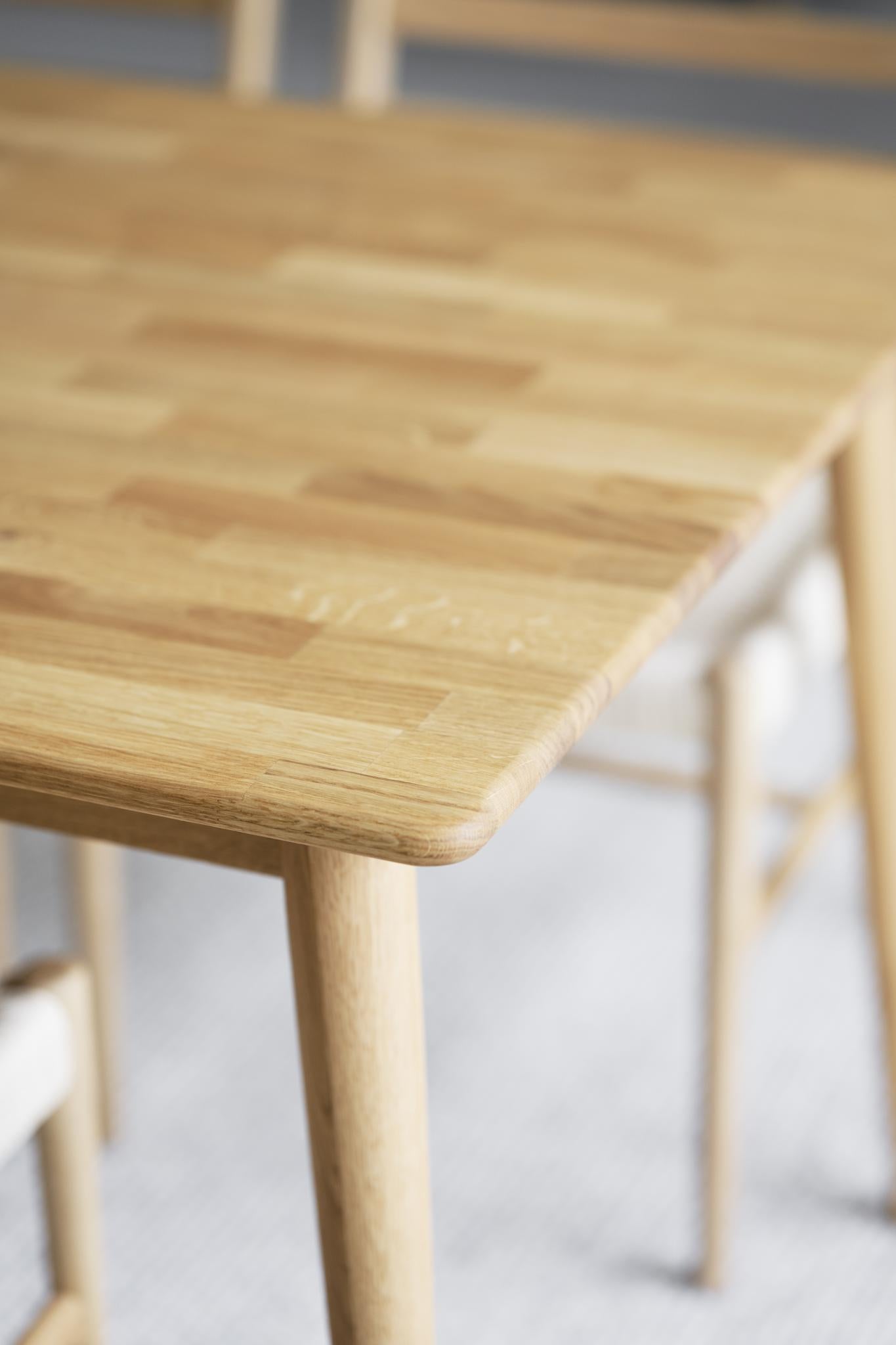 • Massivt ek matbord med rundade hörn och naturlig trästruktur, närbild av bordsskiva och ben