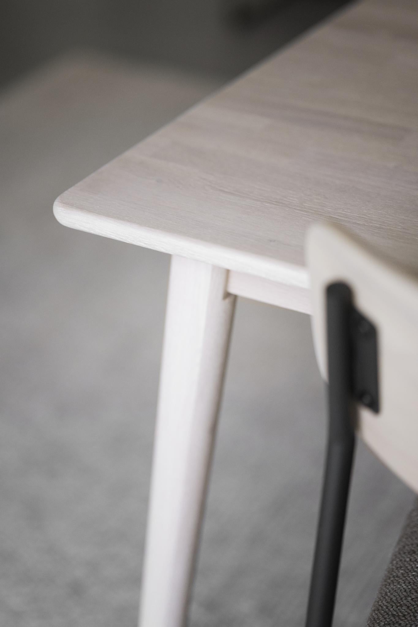 • Ljust trämöbel med rundad bordskant och konisk ben i vitlaserad ek, närbild av hörn och konstruktion