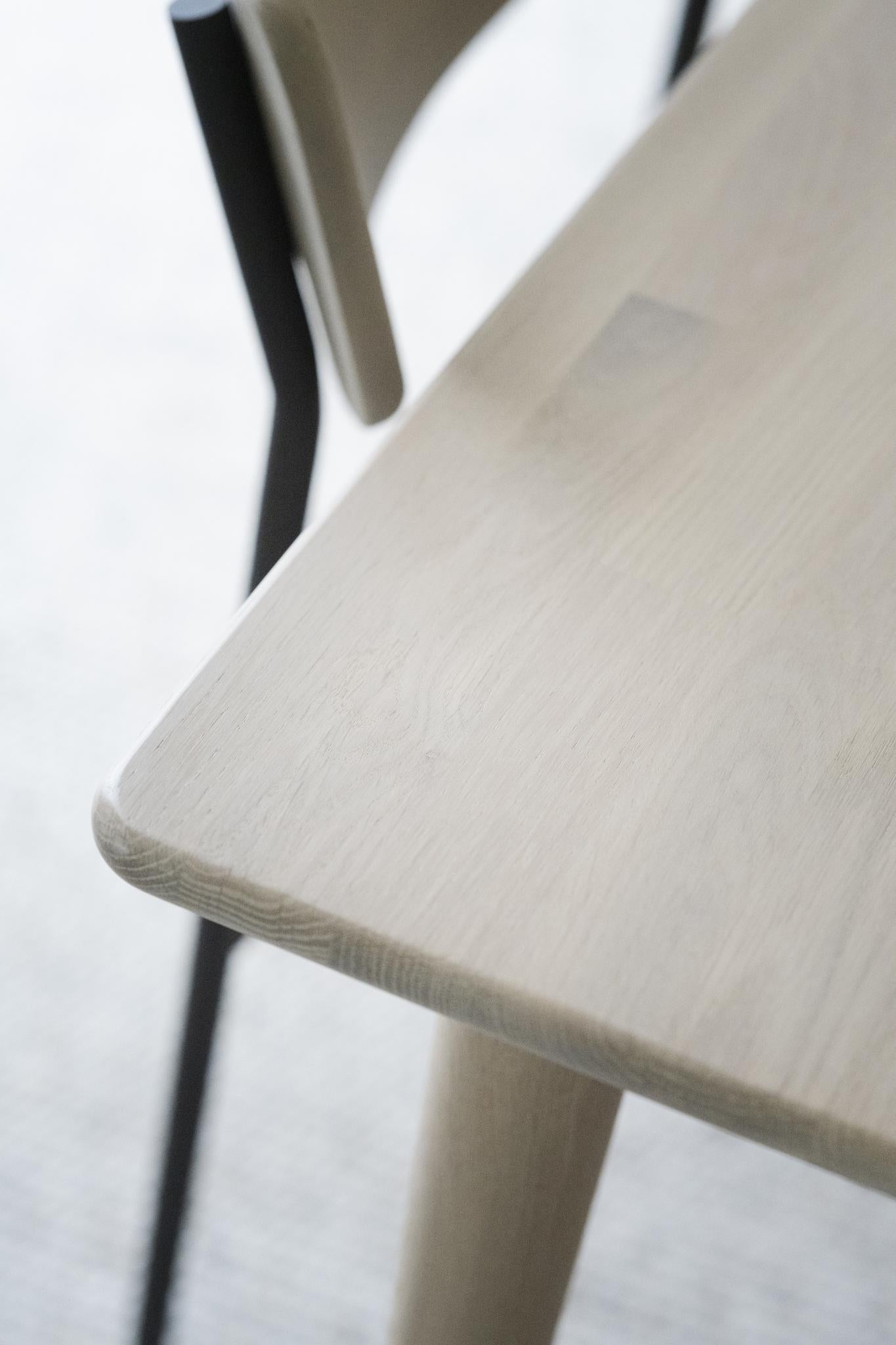 • Närbild på ljus träsits med synlig trästruktur och svarta metallben på stol