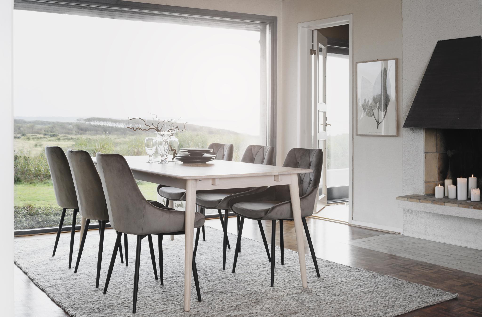 • Matgrupp med ljust bord och grå sammetsstolar i modern matsal med utsikt över natur