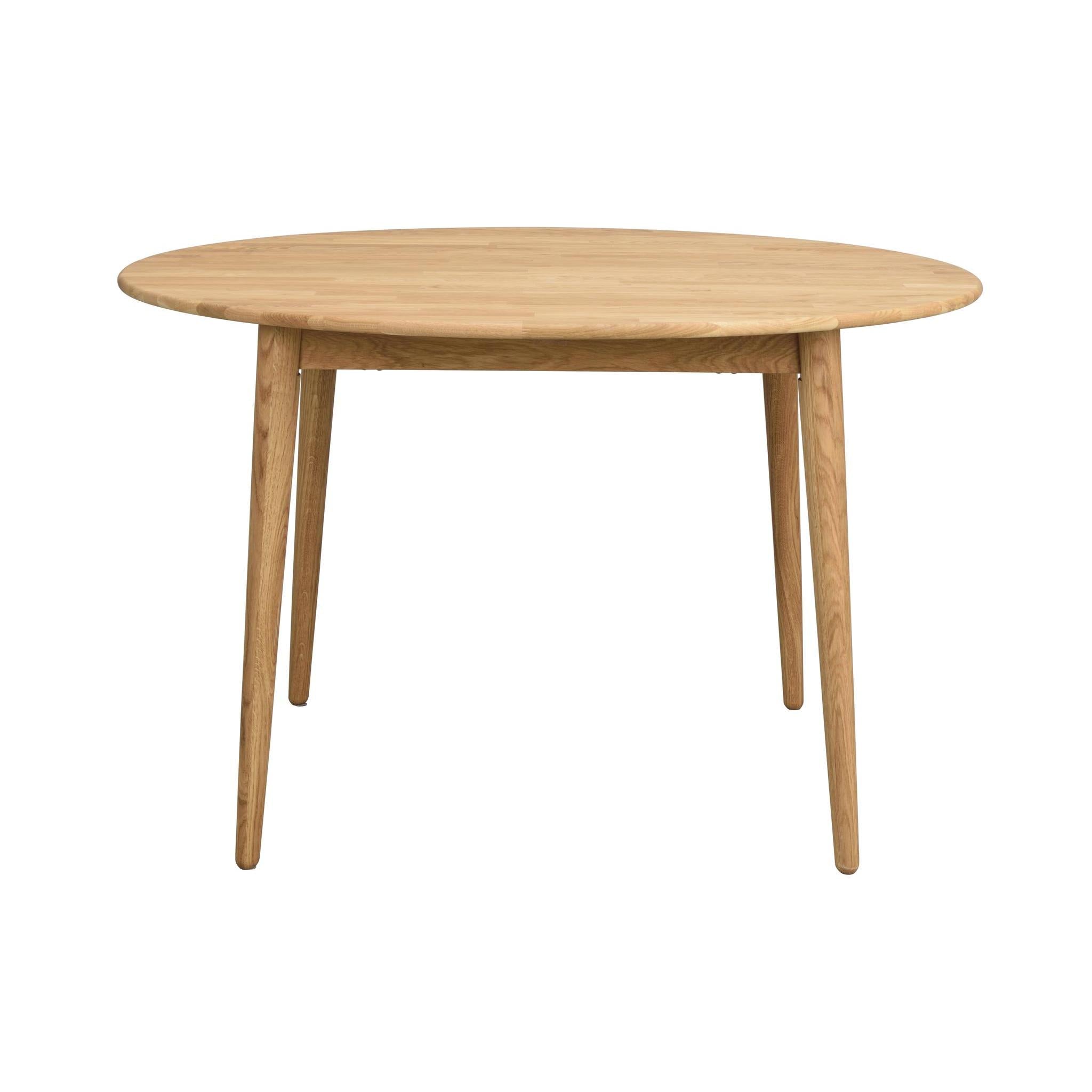 • Runt matbord i ljust ekträ med fyra snedställda ben i skandinavisk design