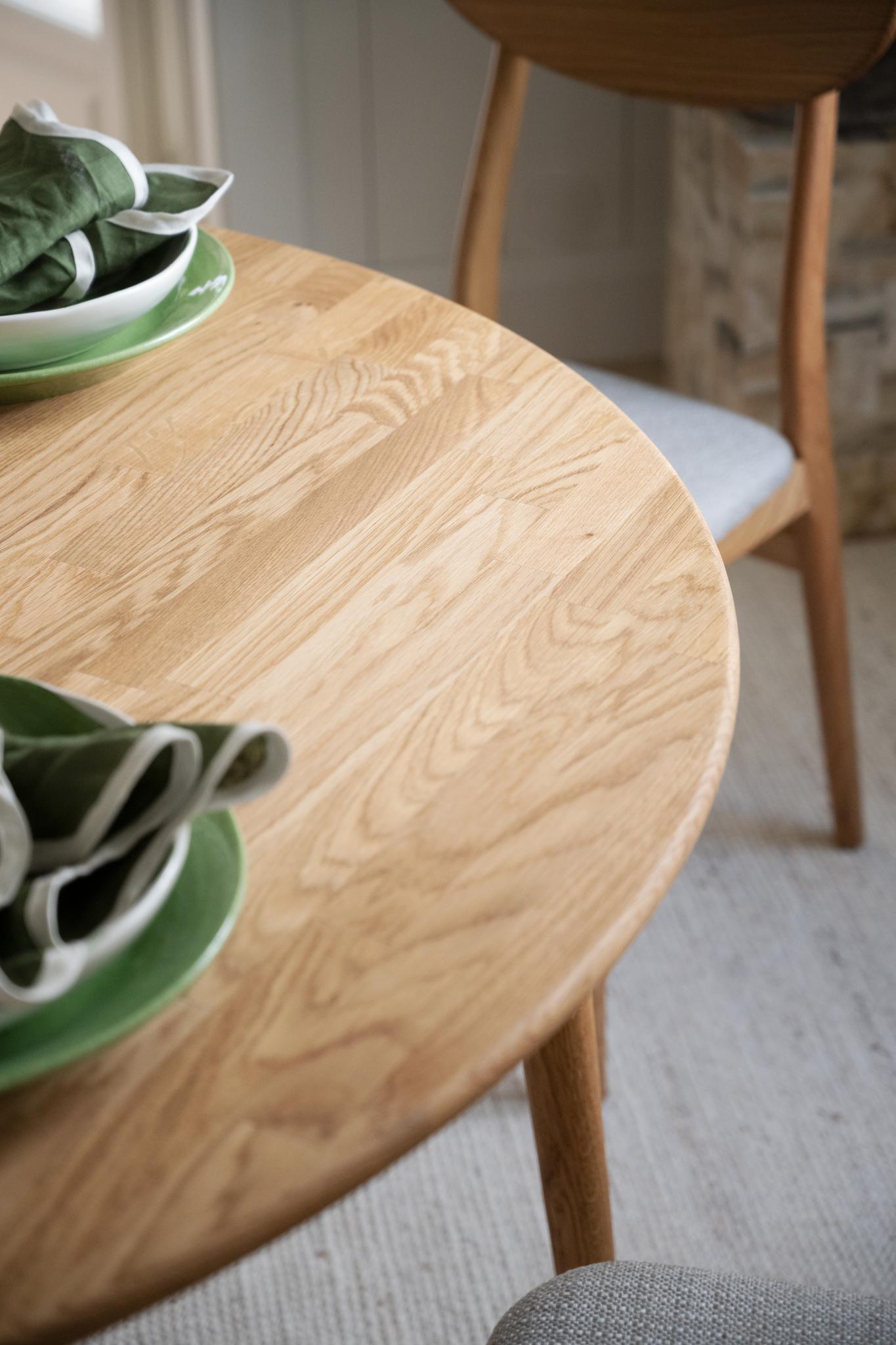 • Runt matbord i ljust trä med synlig ådringsmönster, uppdukat med gröna tallrikar och servetter