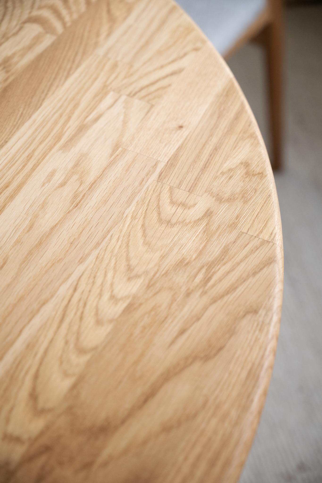 • Runt matbord i ljus ek med fyra ben och utdragsfunktion, skandinavisk design