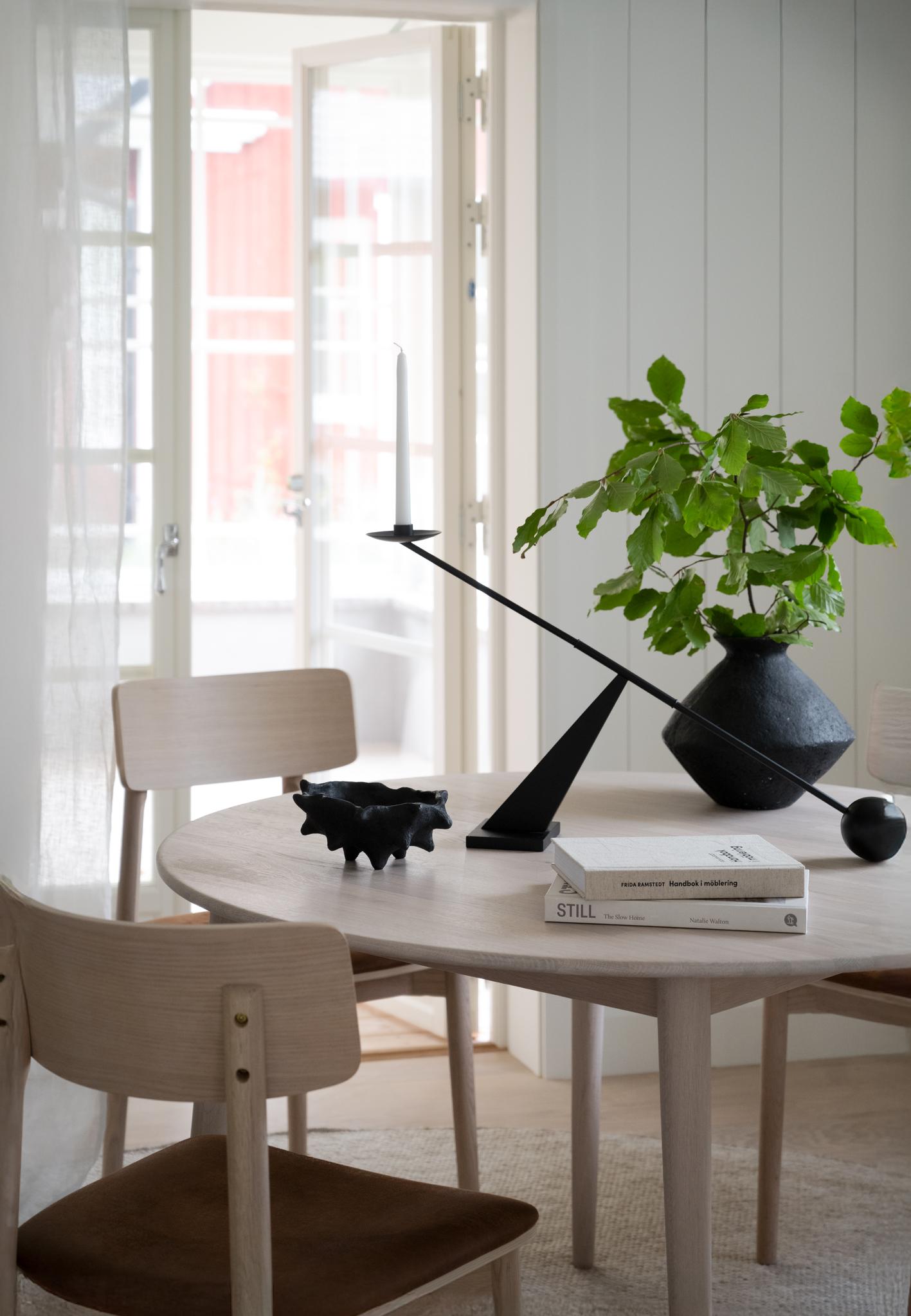 • Ljust matbord i trä med ljusstake, böcker och vas med gröna kvistar i modern skandinavisk inredning
