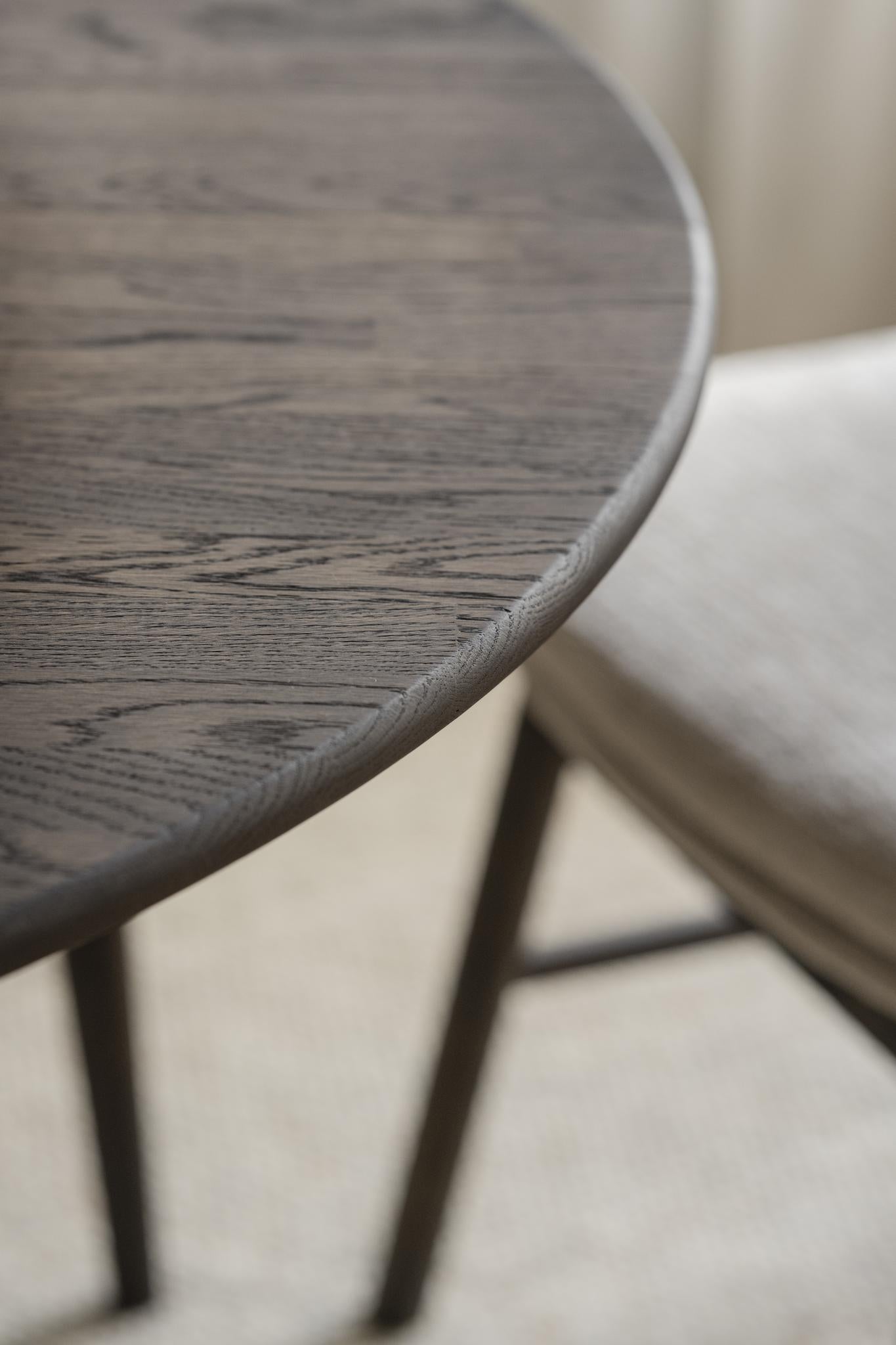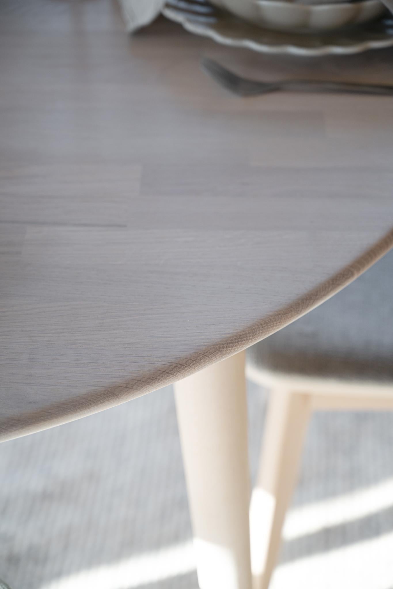 • Runt matbord i oljad ek med tre slanka ben på ljus matta, skandinavisk design