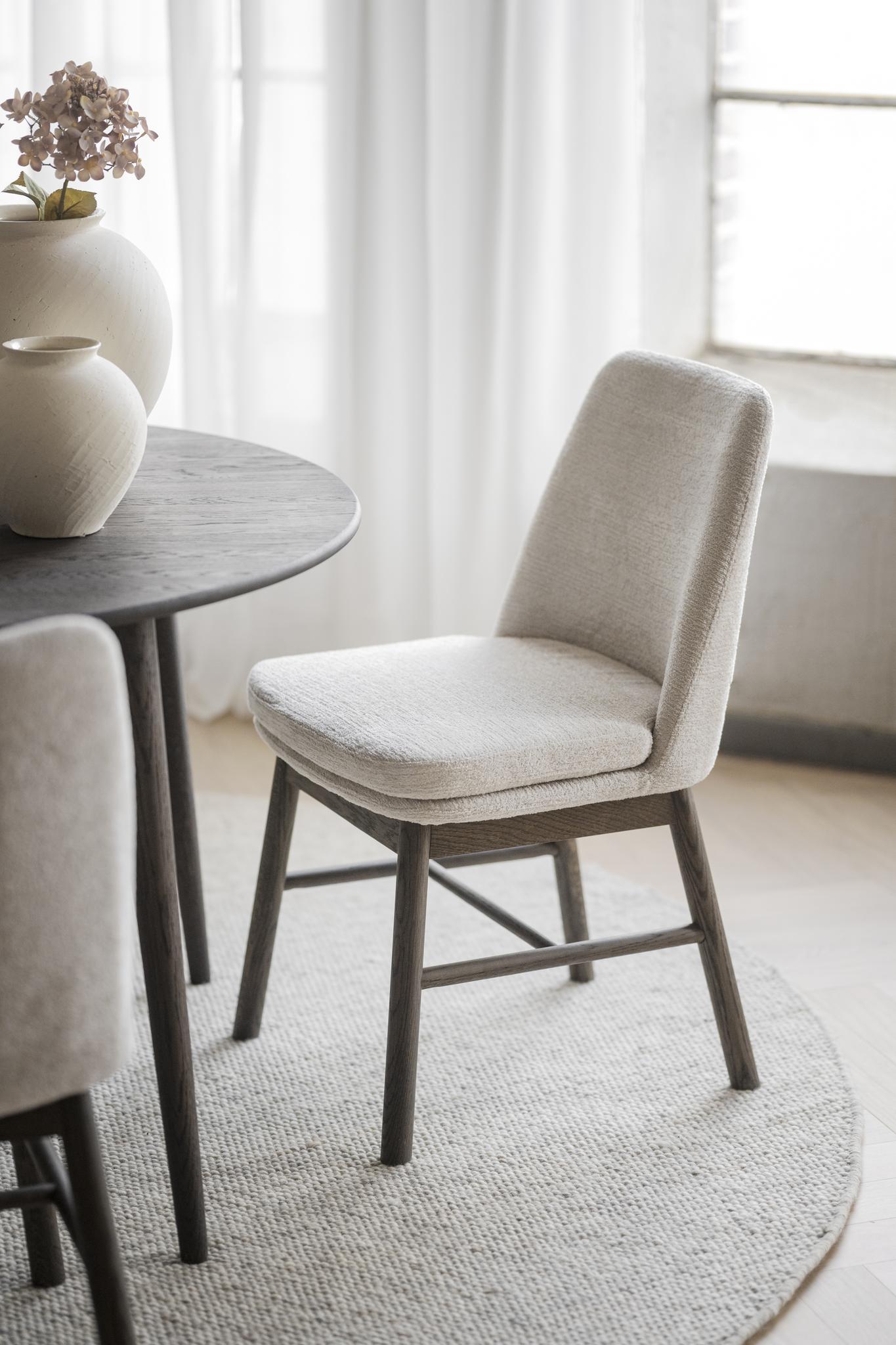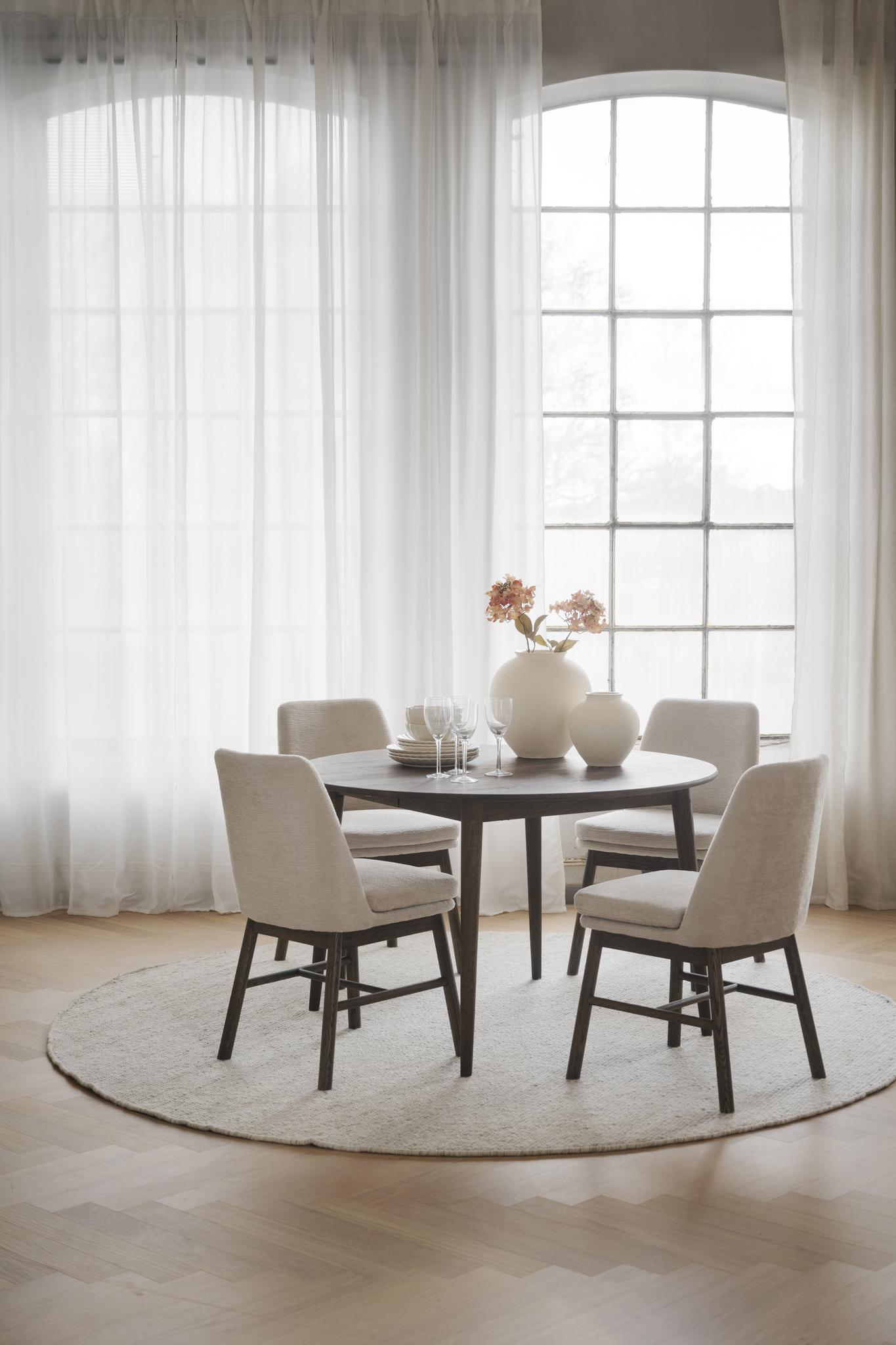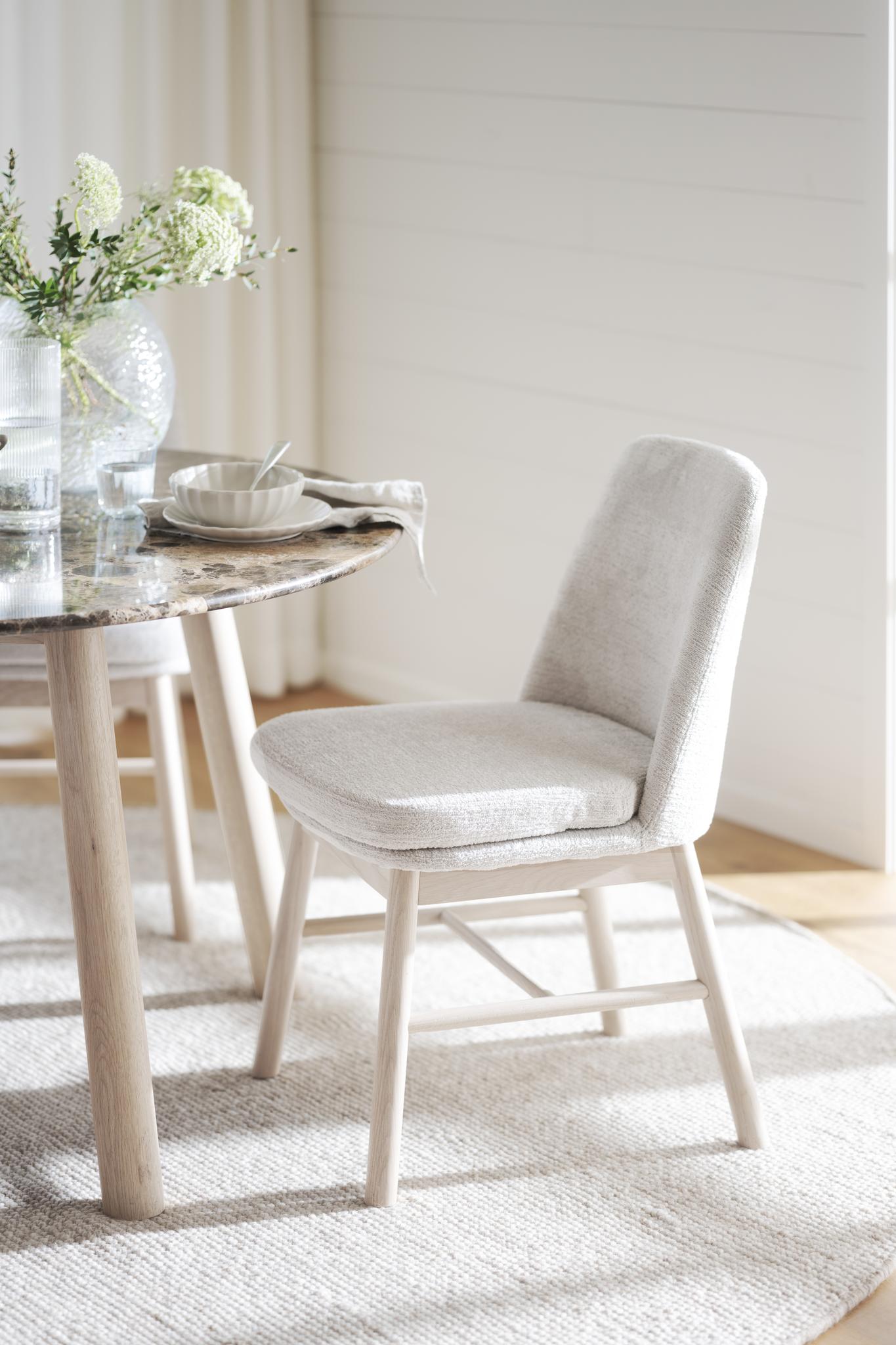 Amesbury stol med svarvade massiva träben i brunlackad ek ger en naturlig elegans till ditt hem. Stolen är klädd med ljusbeige tyg som har fin struktur och är otroligt mjukt, samtidigt som det är väldigt slitstarkt. Tack vare den tjocka dynan, som dessutom är löstagbar, kan du sitta bekvämt under långa middagar och njuta av varje ögonblick. Finns även med träben i vitpigmenterad ek samt lackad ek.