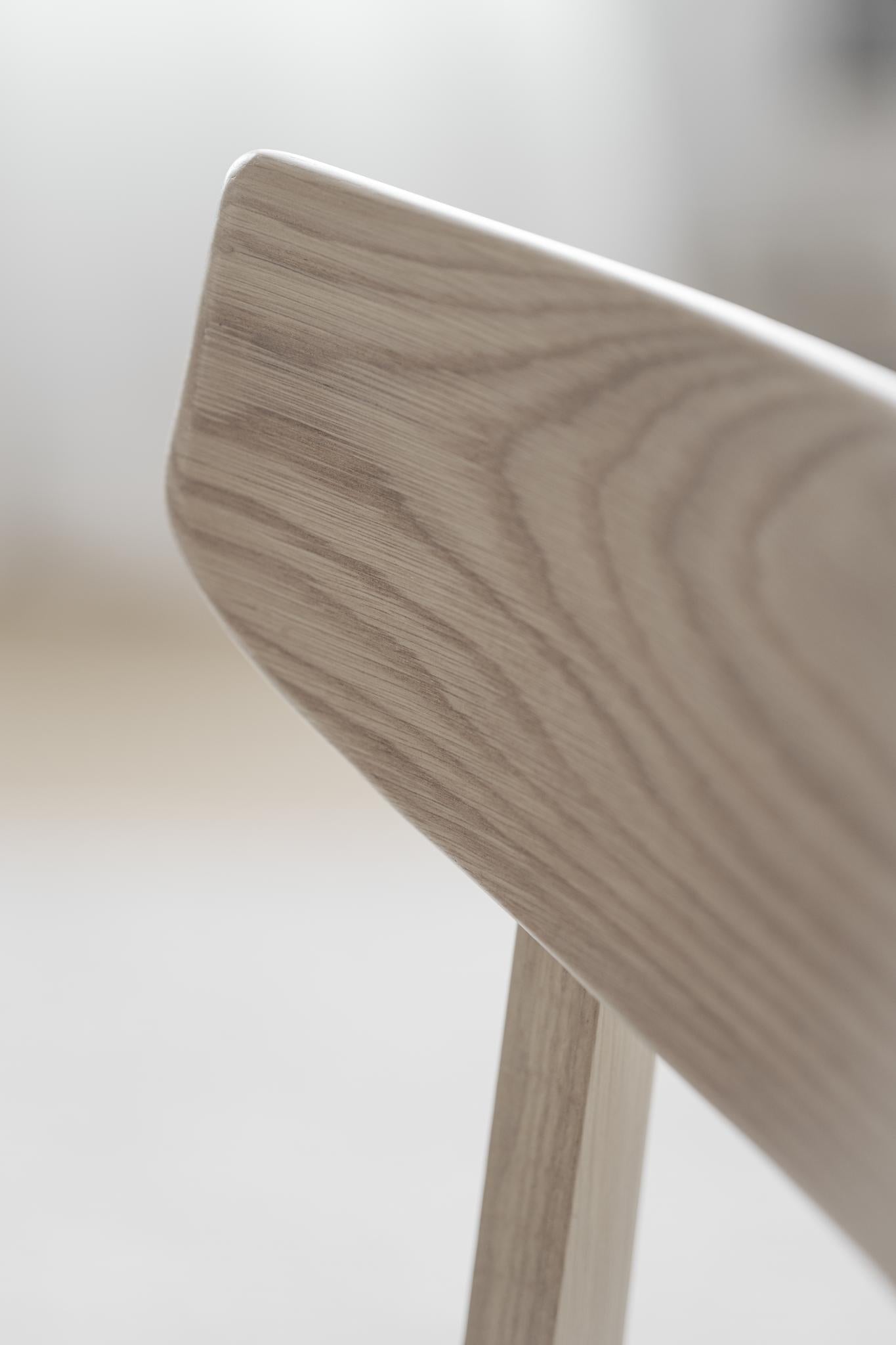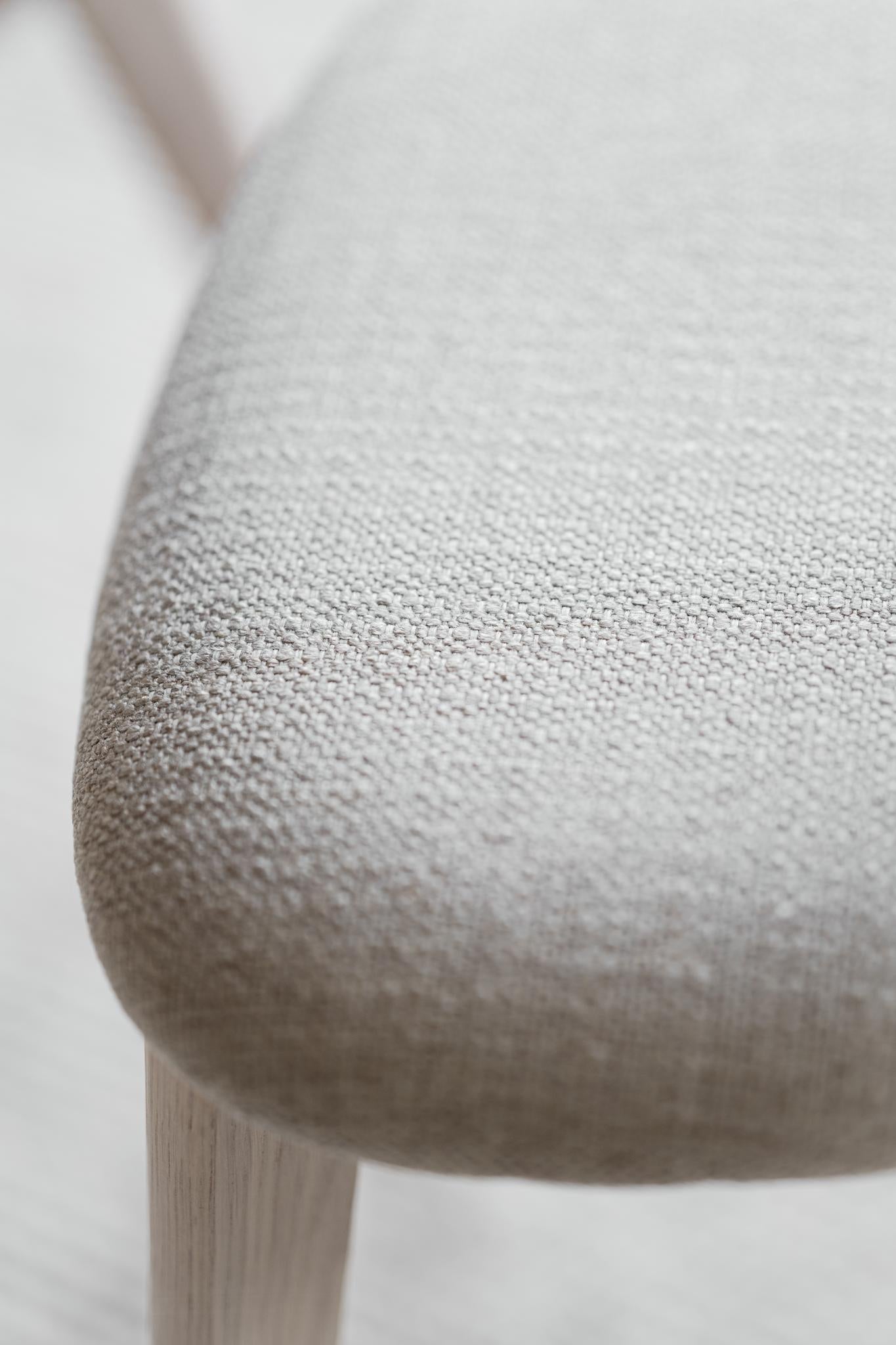 Stolstomme i massiv lackad vitpigmenterad ek med sits i beige-grått tyg.