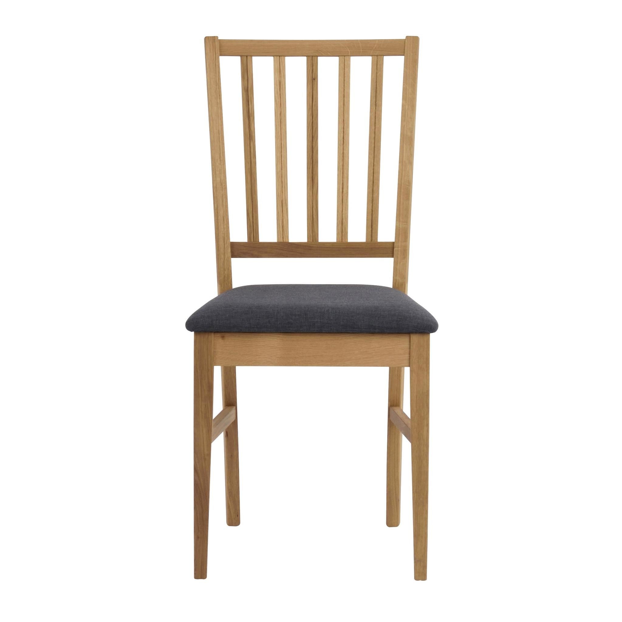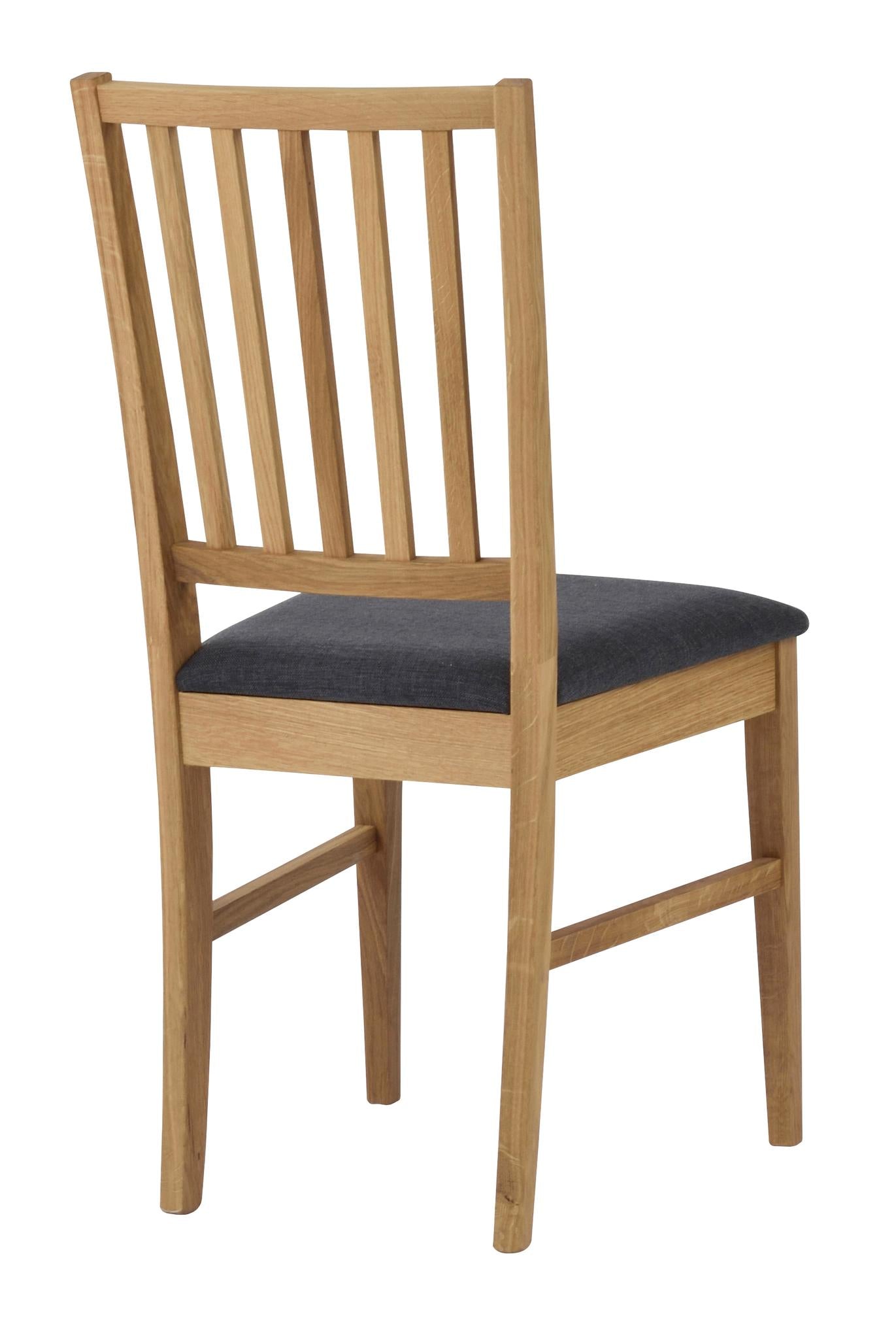 • Matstol i ek med vertikala spjälor i ryggstödet och grå stoppad sits