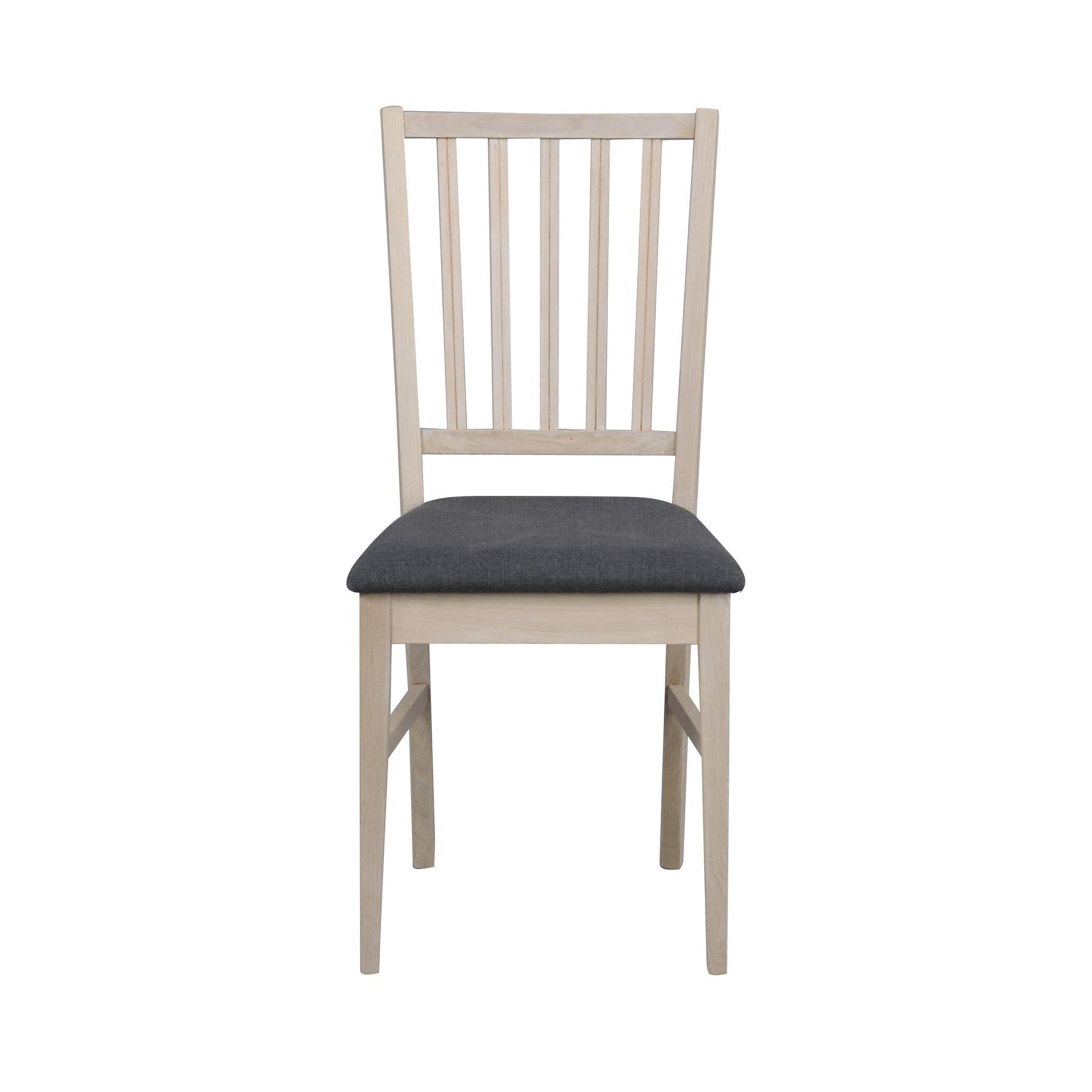 • Matstol i ljust trä med grå stoppad sits och vertikala spjälor i ryggstödet