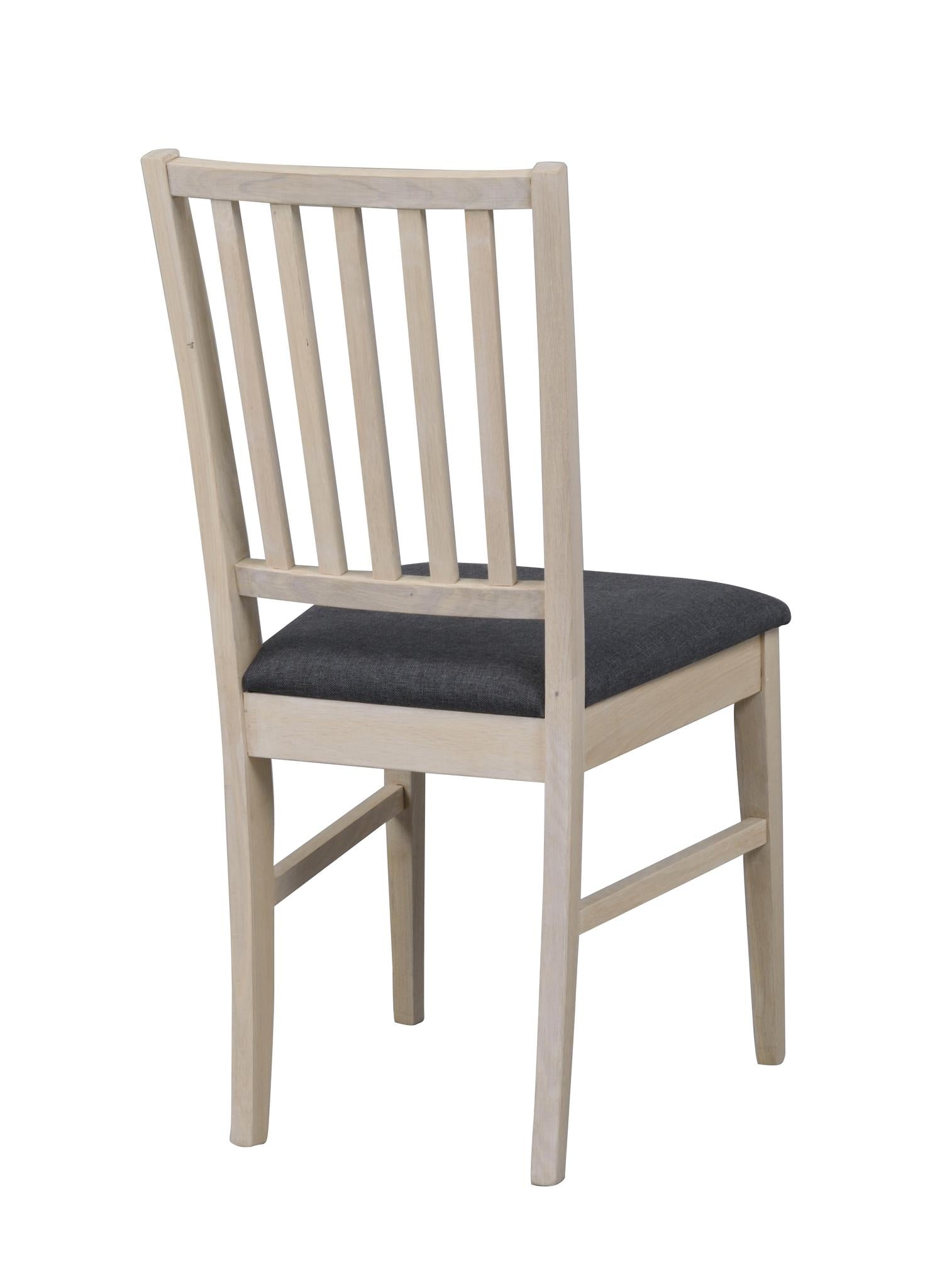 • Matstol i vitlaserad trä med svart stoppad sits och spjälor i ryggen, snett bakifrån