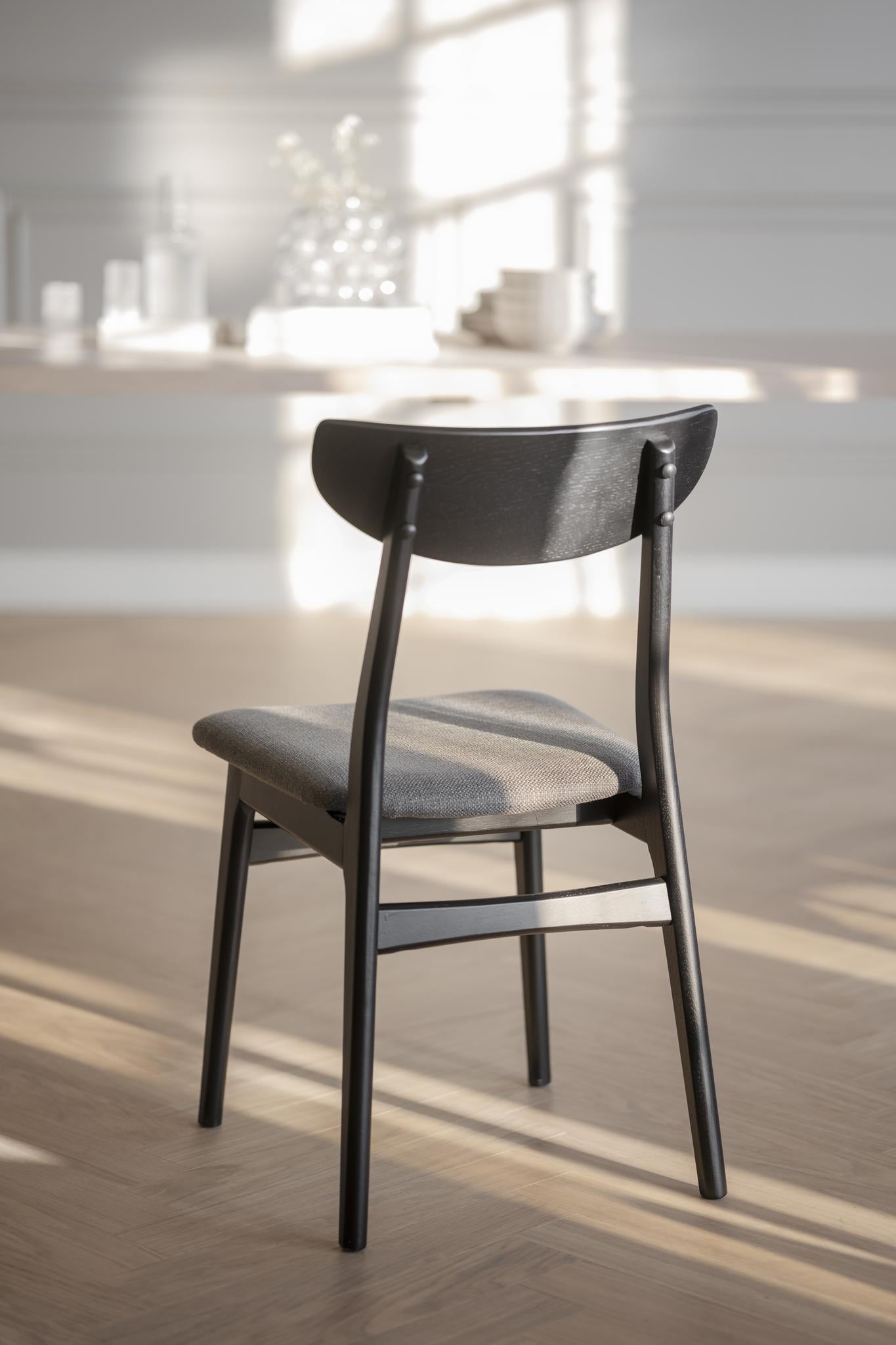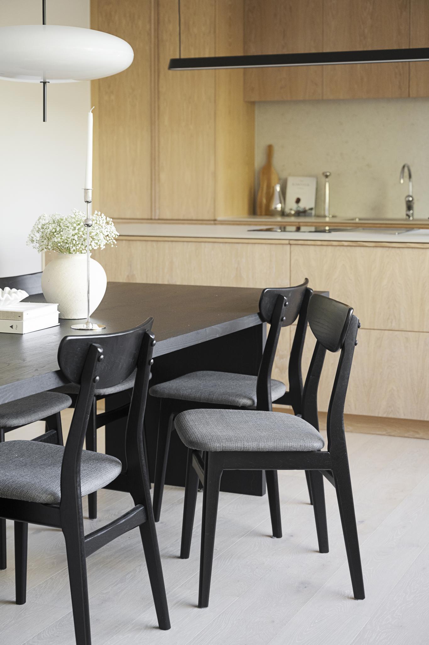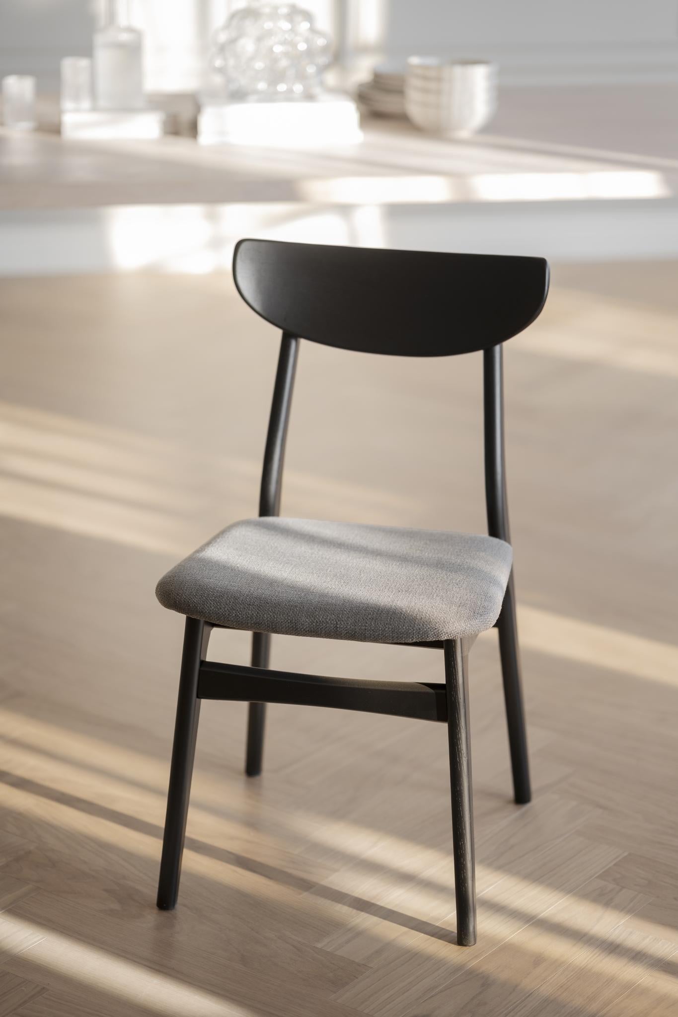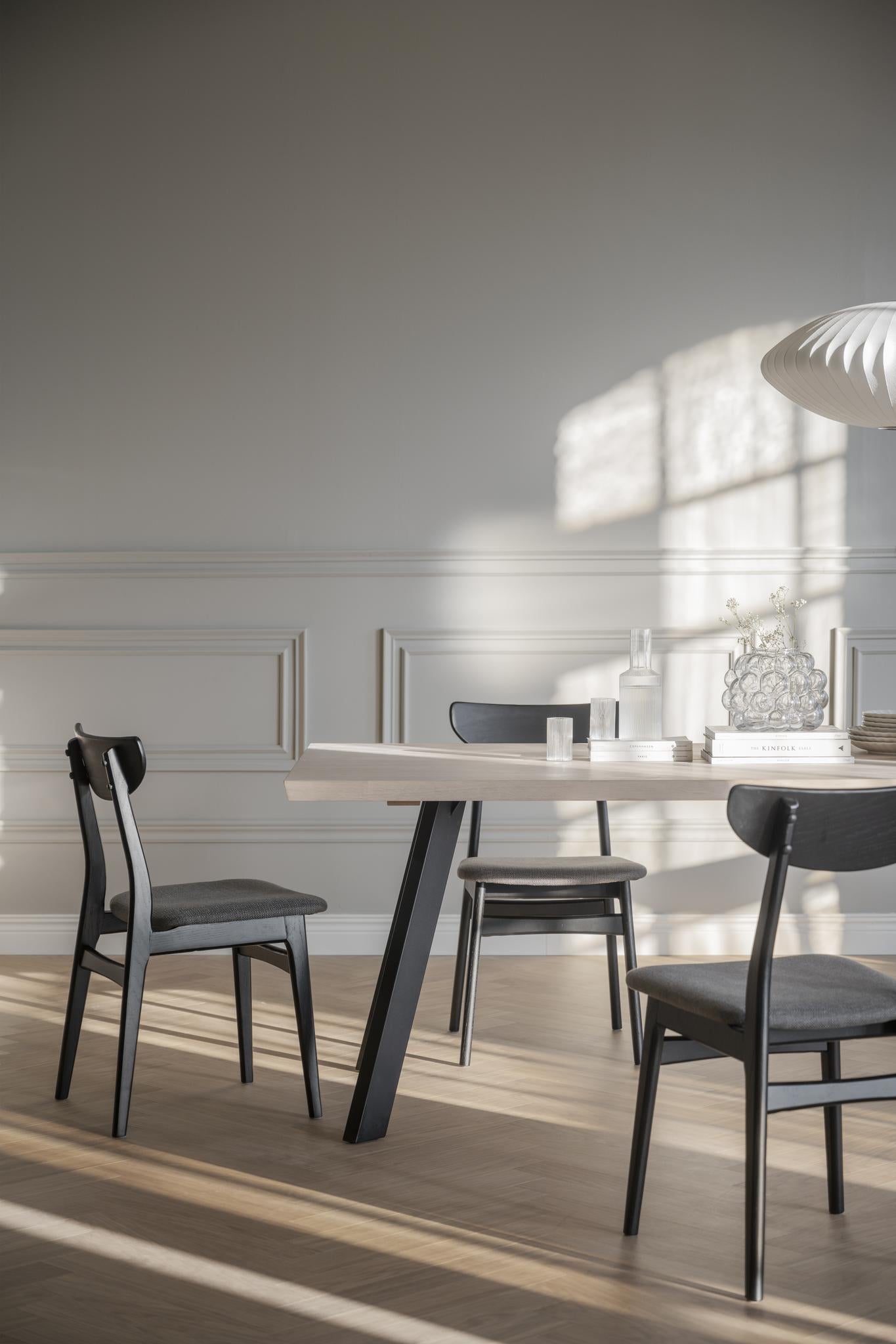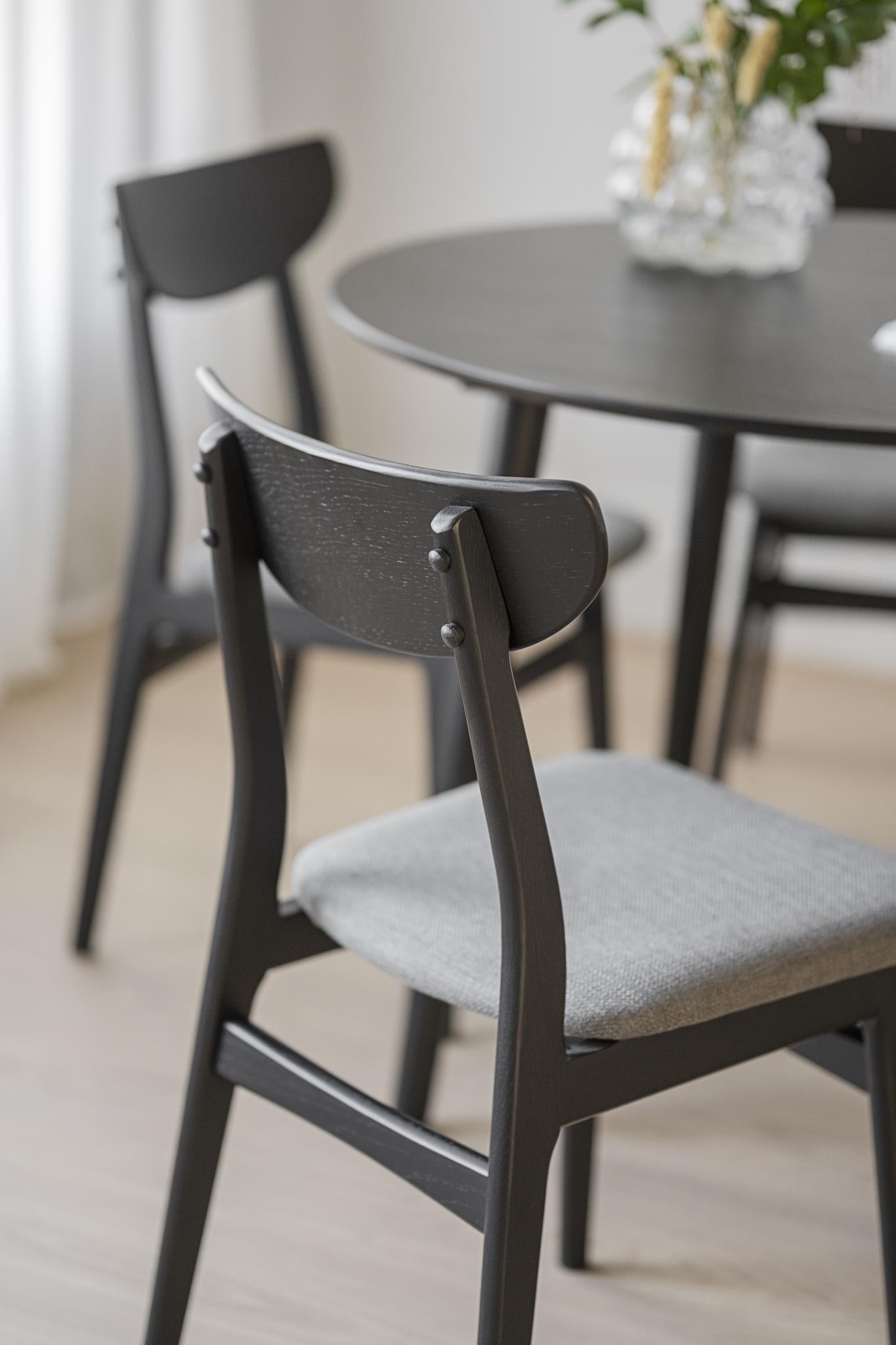 Rodham stol i svartlackad ek med mörkgrå sits är både trendsäker och exklusiv i sitt uttryck. Stolen består av massiv ek i både stomme och ryggbricka. Den klädda sitsen är både bekväm och elegant. Finns också i flera naturnära färger.