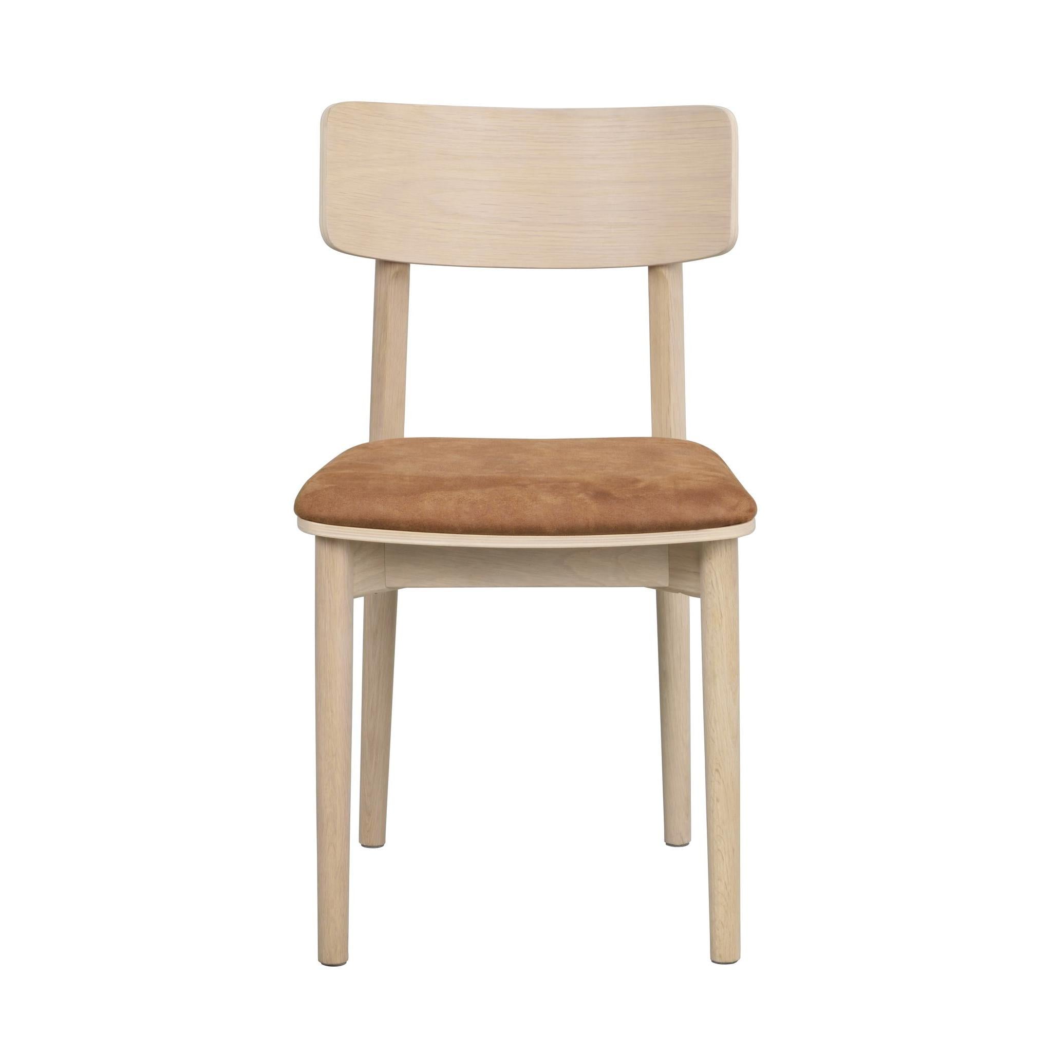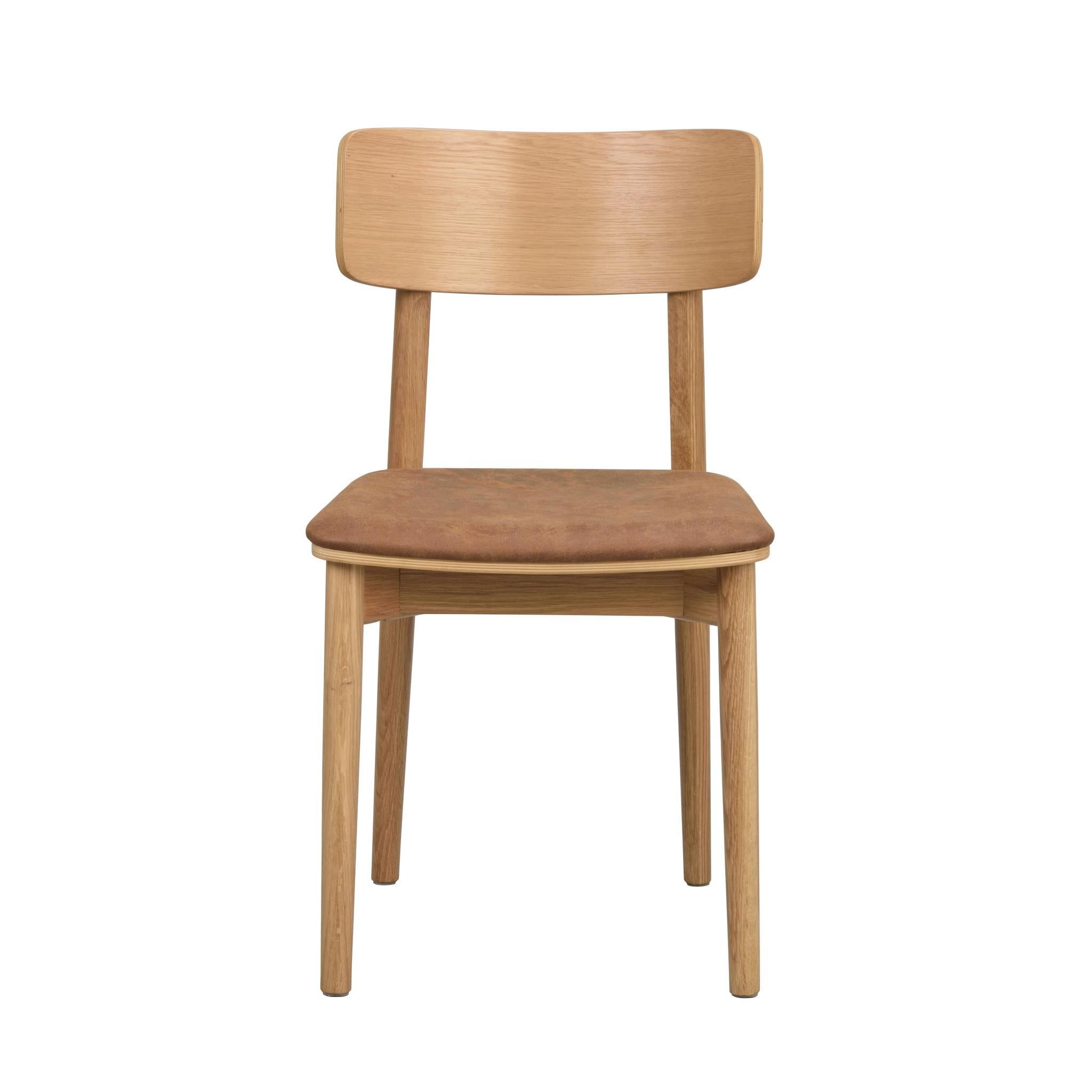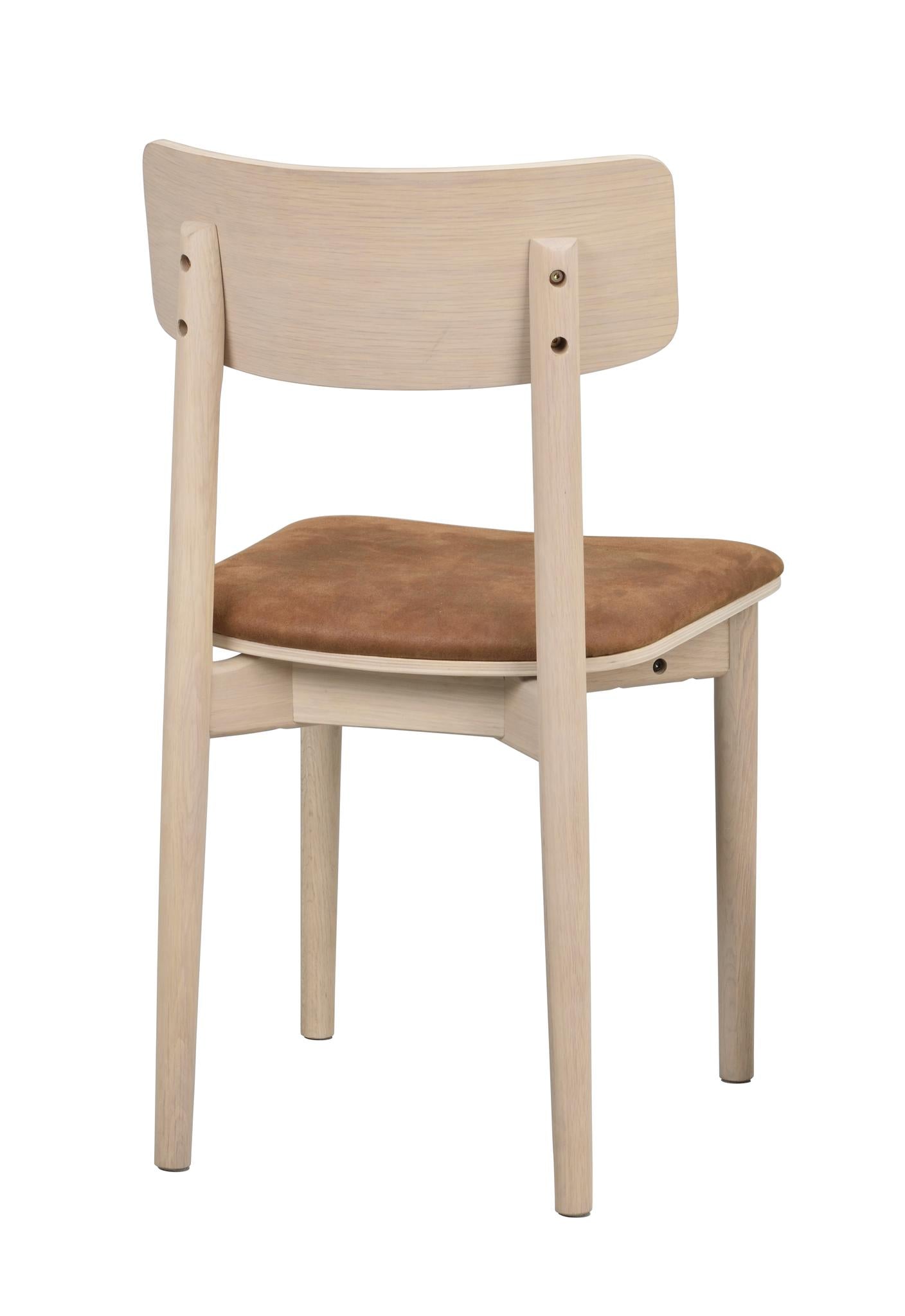 • Matstol i ljus ek med stoppad sits i brunt läder, vy bakifrån