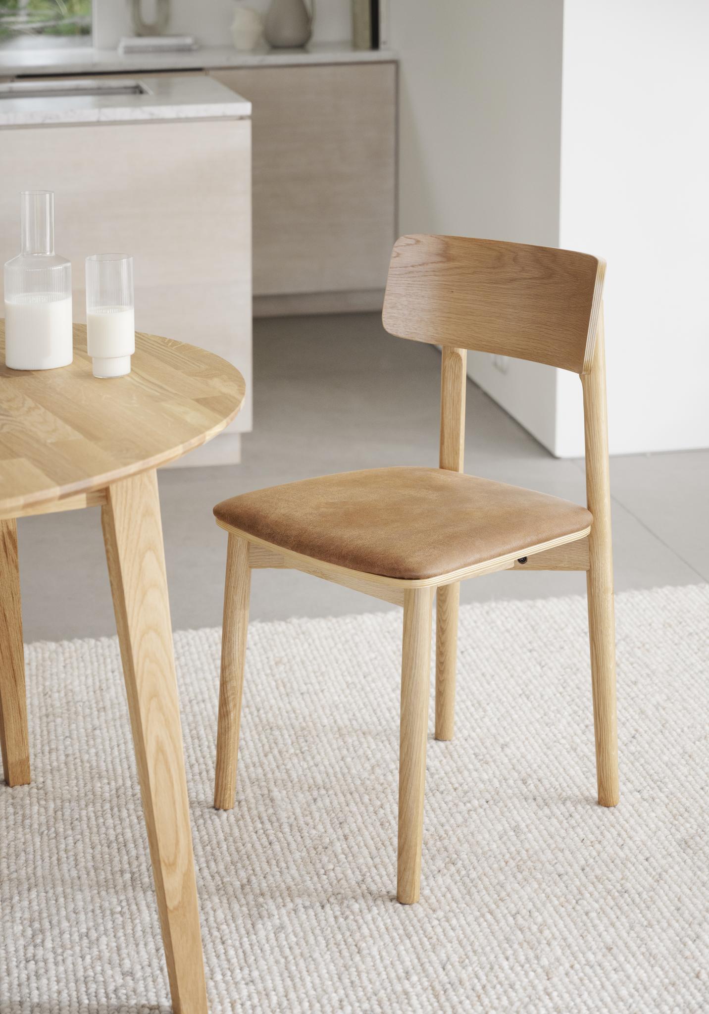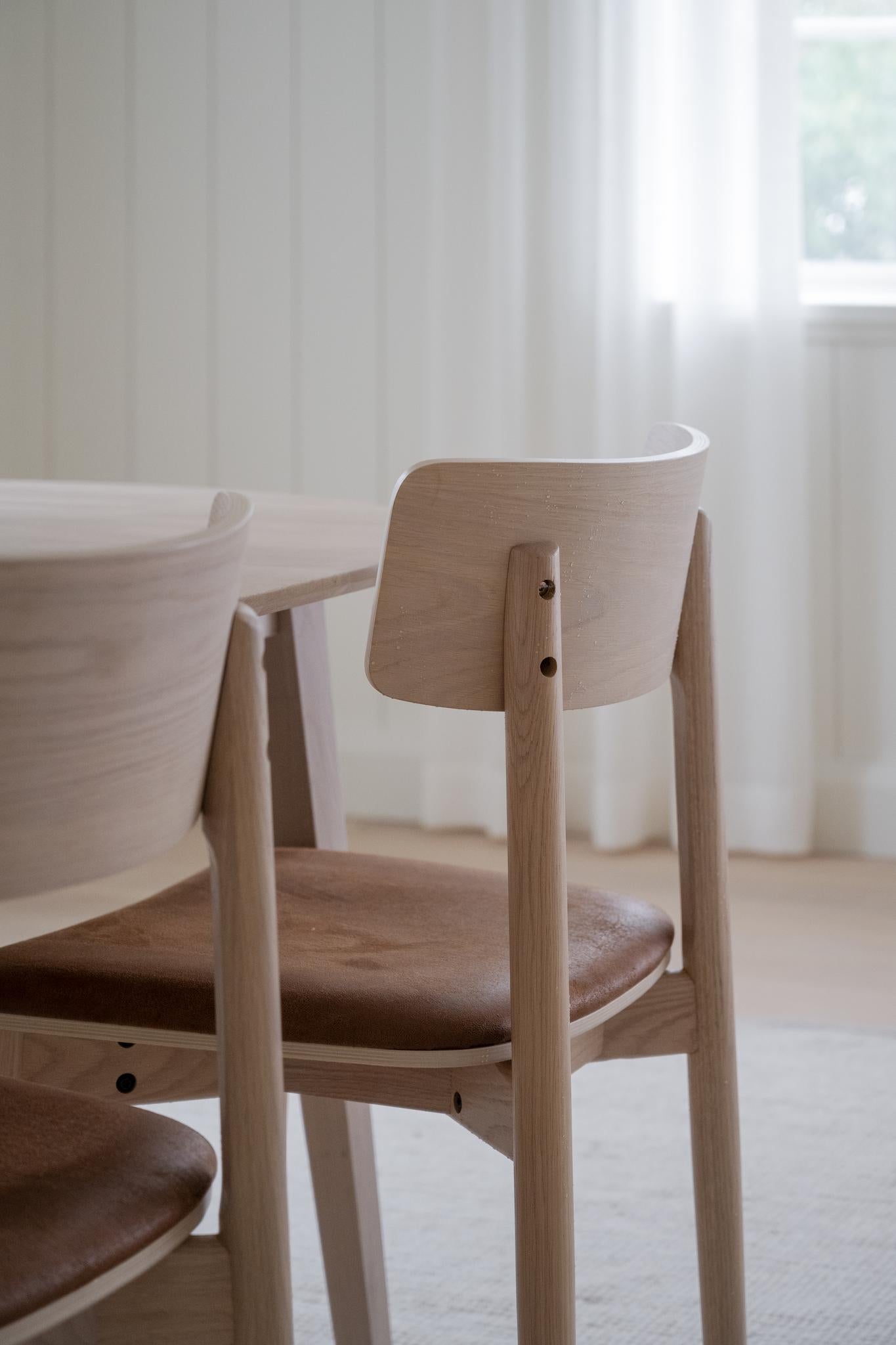 • Ljus ekfanerad stol med stoppad brun sits och böjd rygg vid matbord i skandinavisk stil