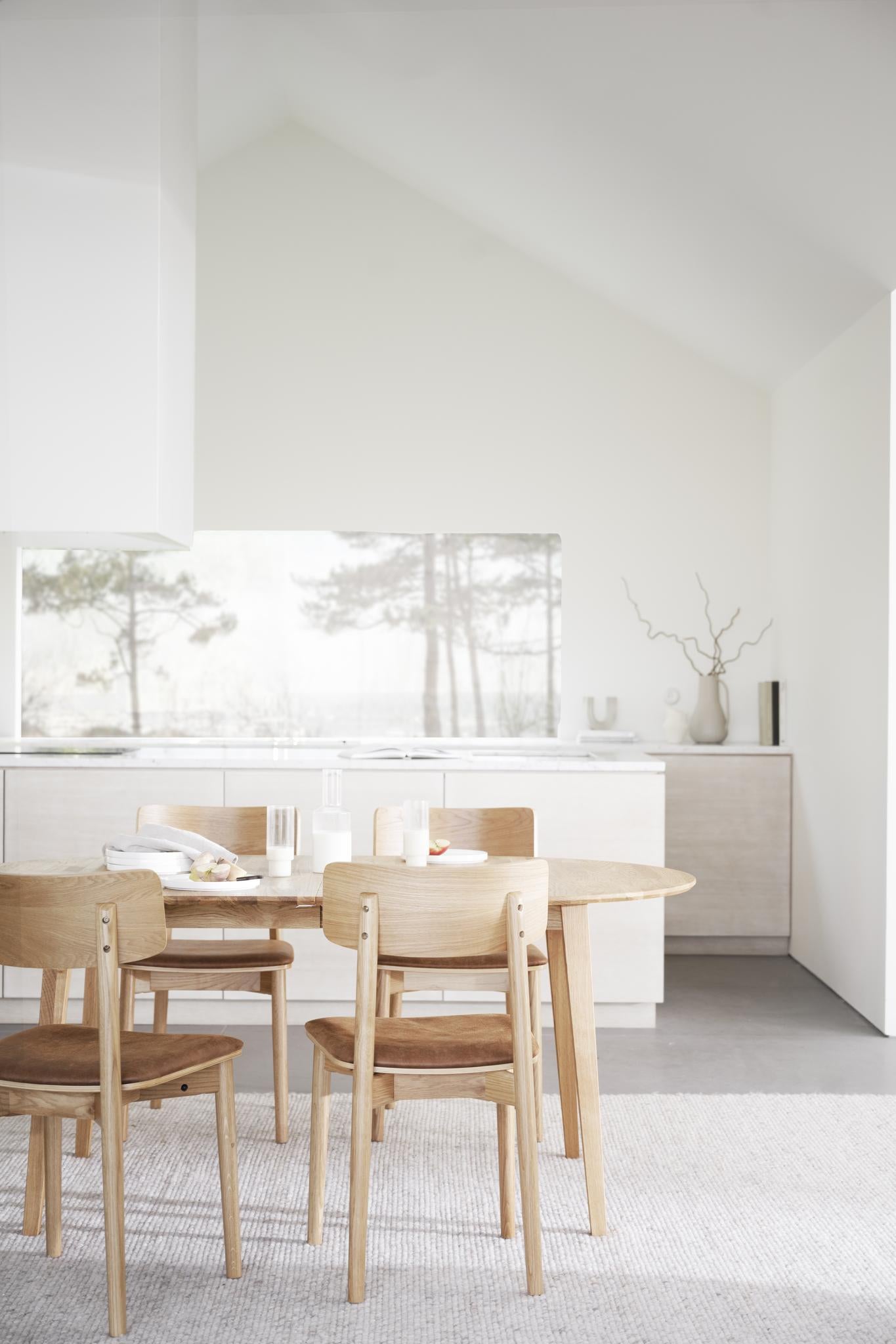 • Ljus matplats med runt matbord i trä och stolar med bruna dynor i minimalistisk skandinavisk stil