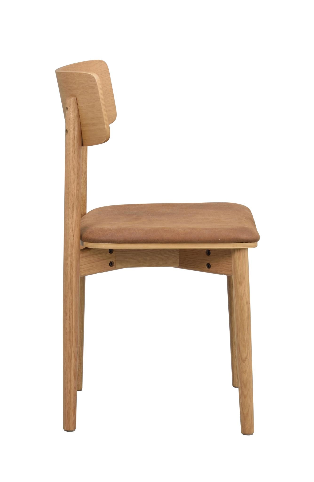 Massiv ek i ben och stomme. Björkplywood med ekfaner i ryggbricka och sits. Sitsen klädd med polyeterskum och Bull läder-textil.