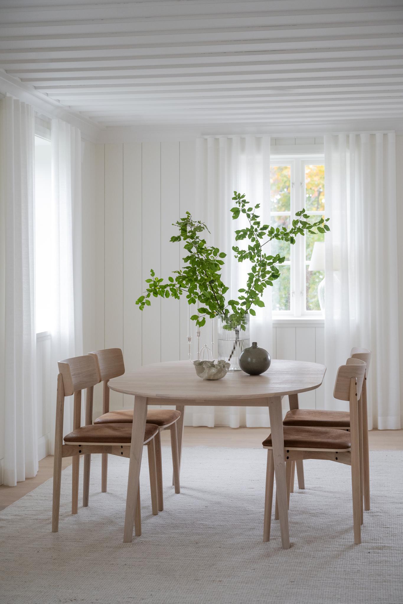 • Rund matbord i ljust trä med fyra stolar i skandinavisk design, dekoration med gröna växter i ljust matrum