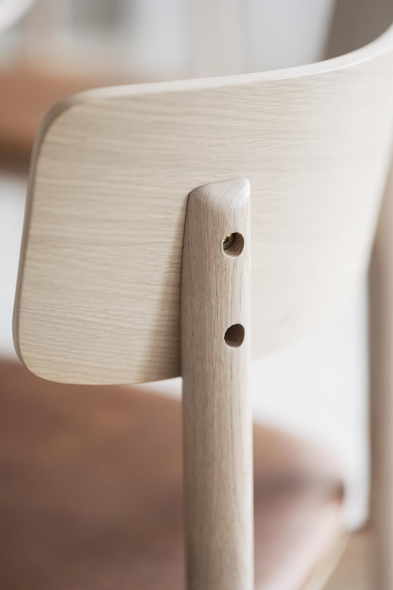 • Närbild på stolsrygg i ljus ek med synliga snickardetaljer och brunt läderklädsel på sits