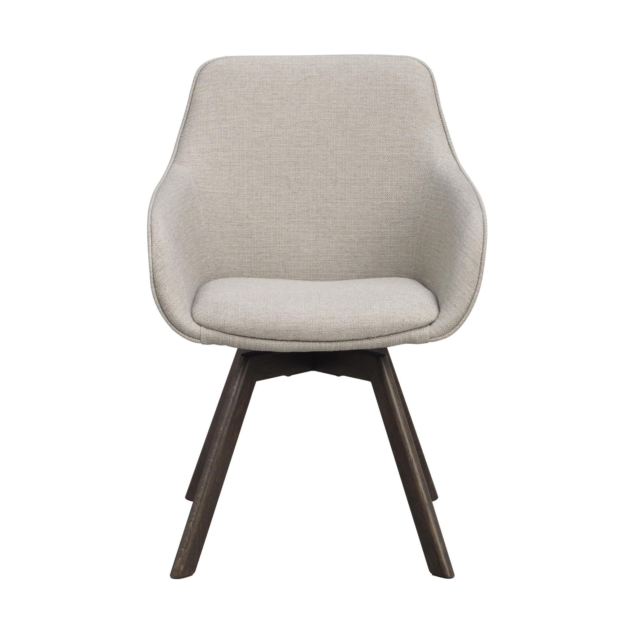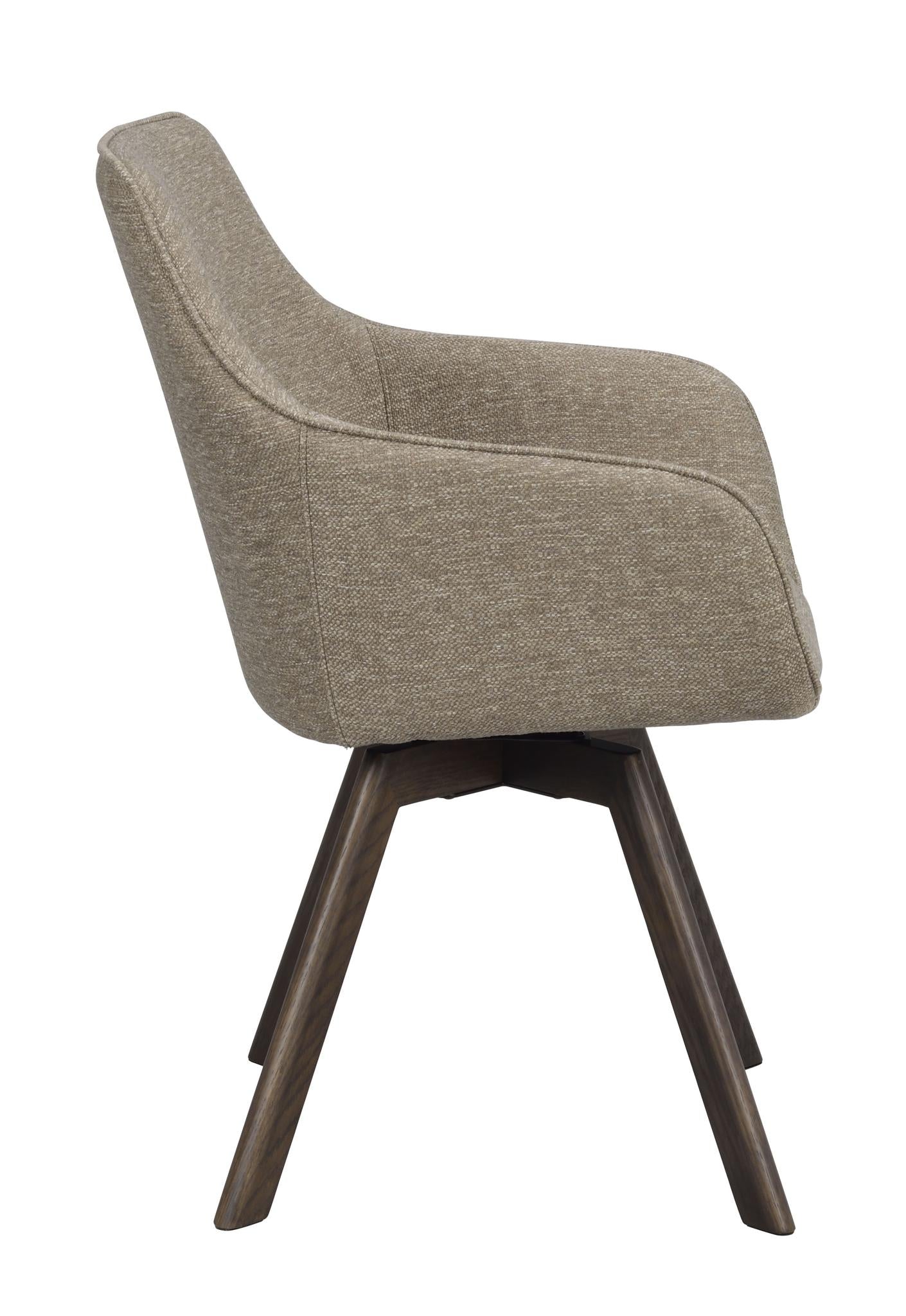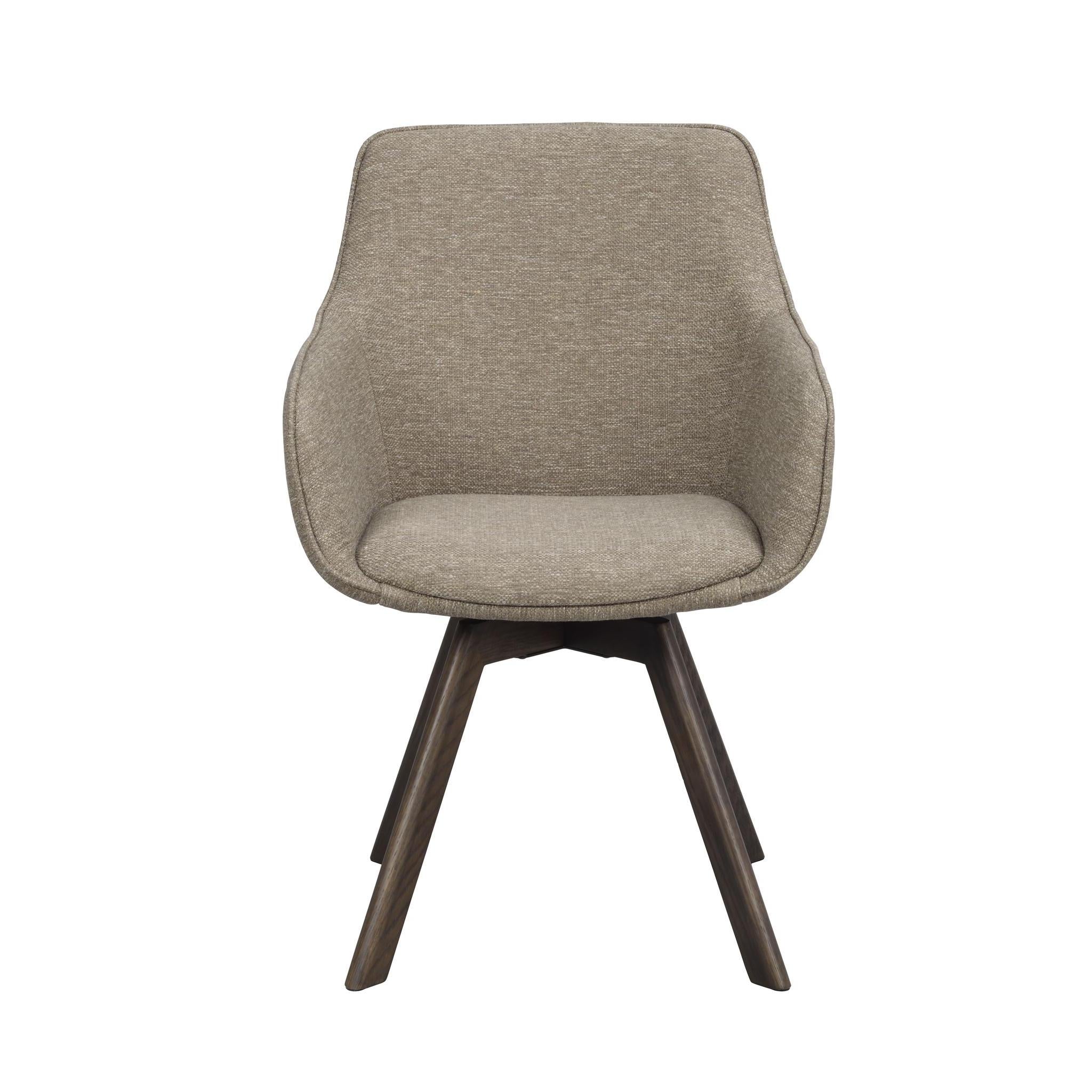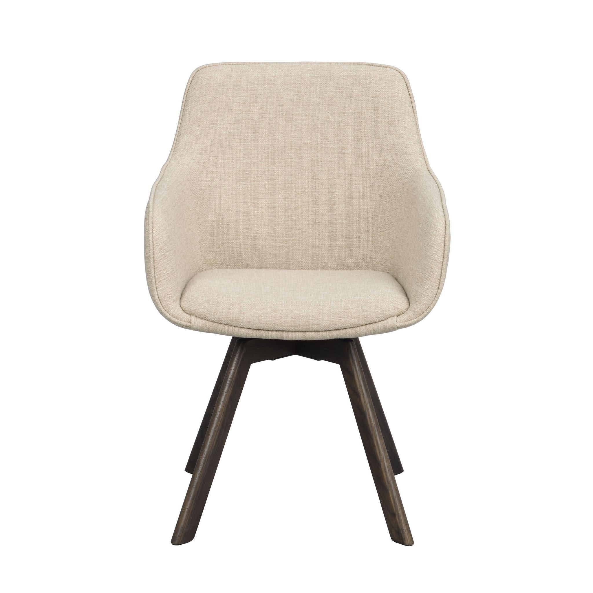 • Beige stol med armstöd och mörka träben, modern design med svängbar sits