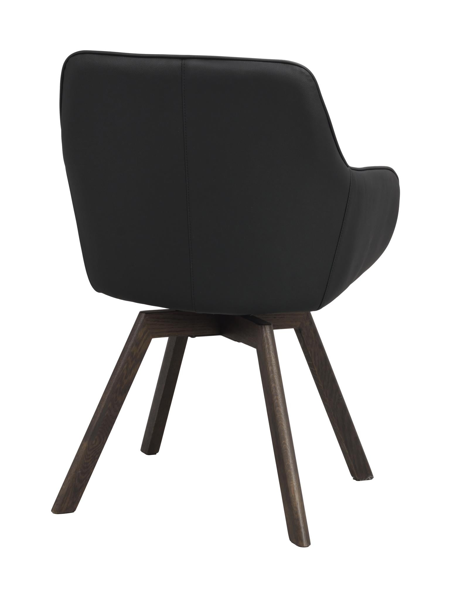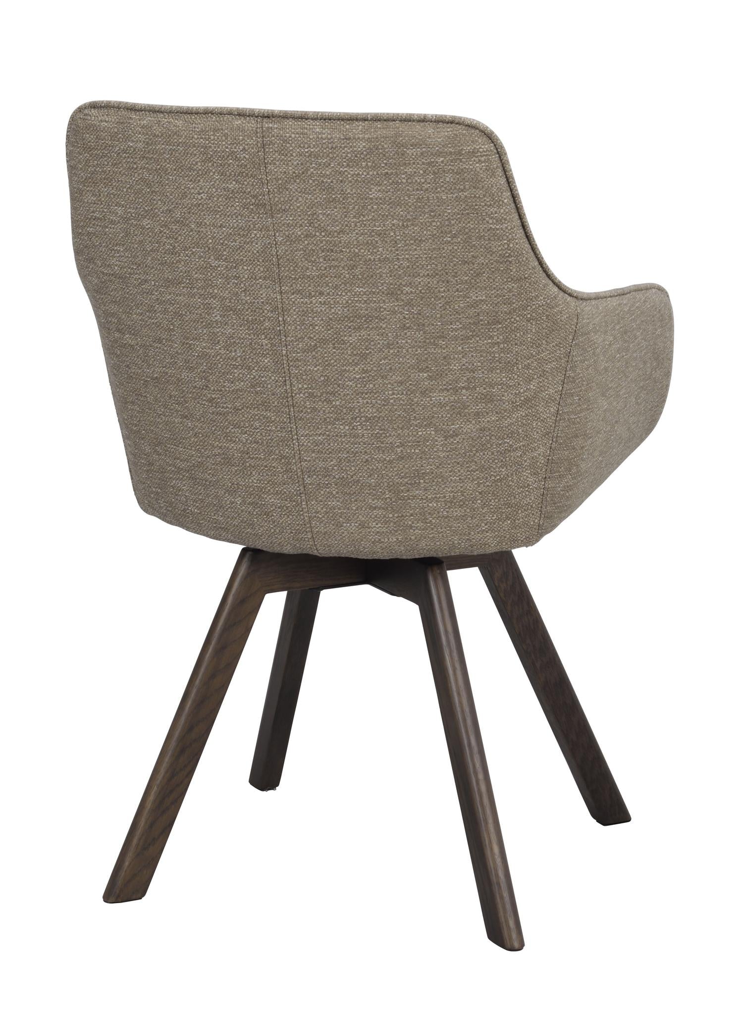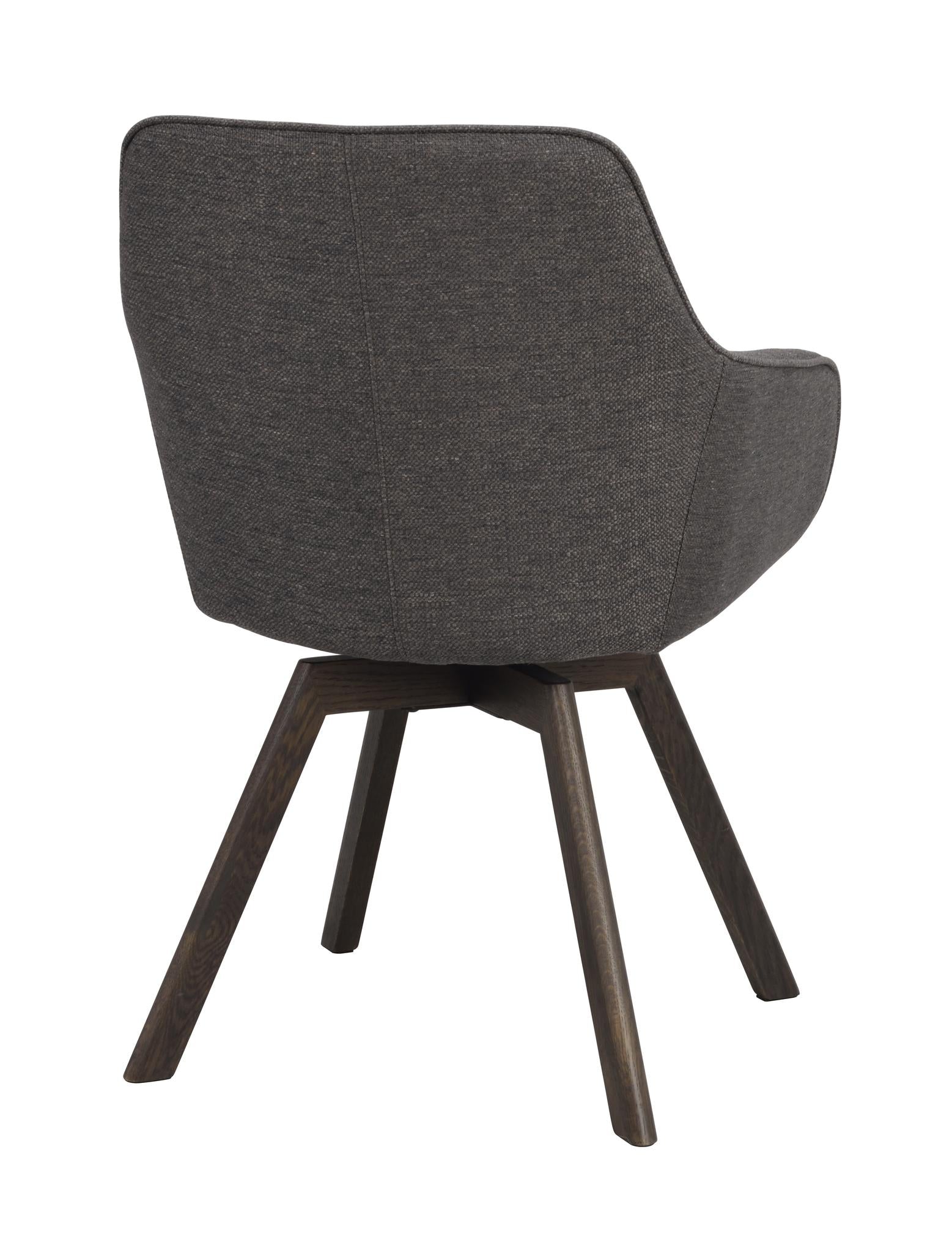 • Grå matstol med armstöd och mörkbruna träben, bakifrån sedd med svängbar funktion