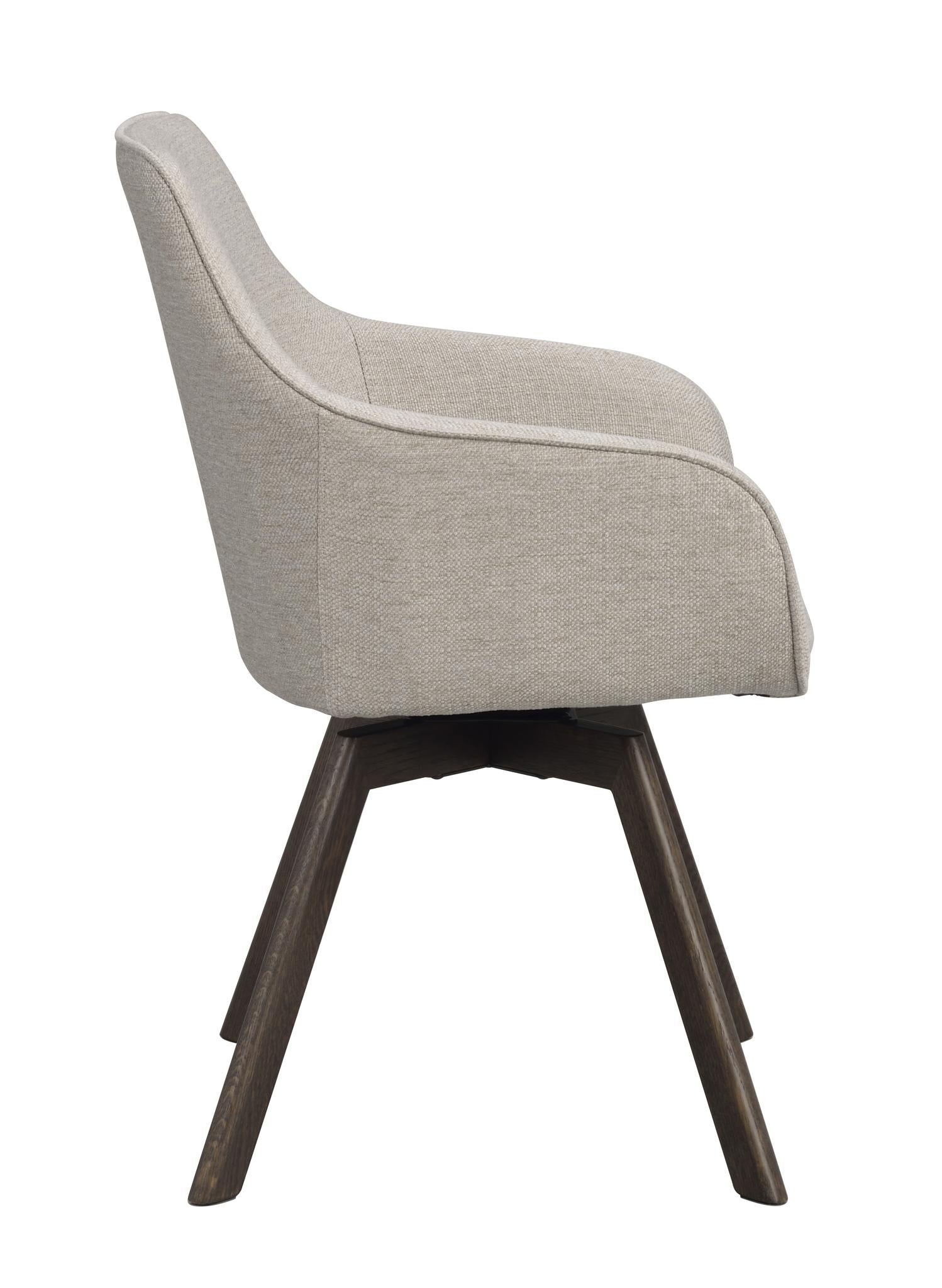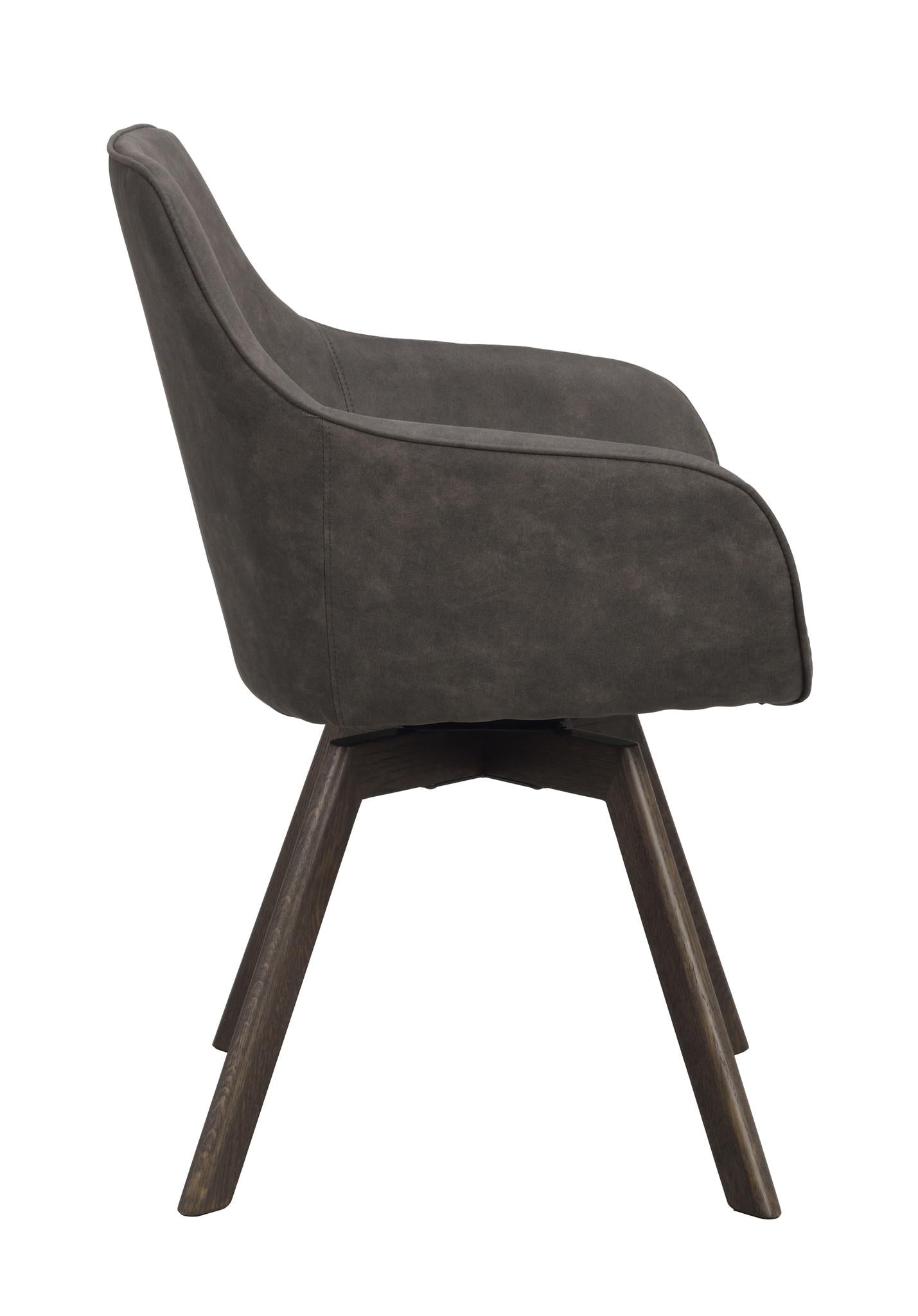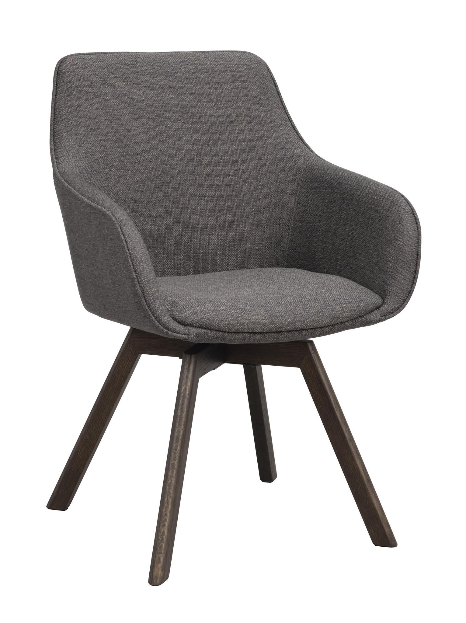 • Grå matstol med armstöd och träben i modern skandinavisk design med svängbar funktion