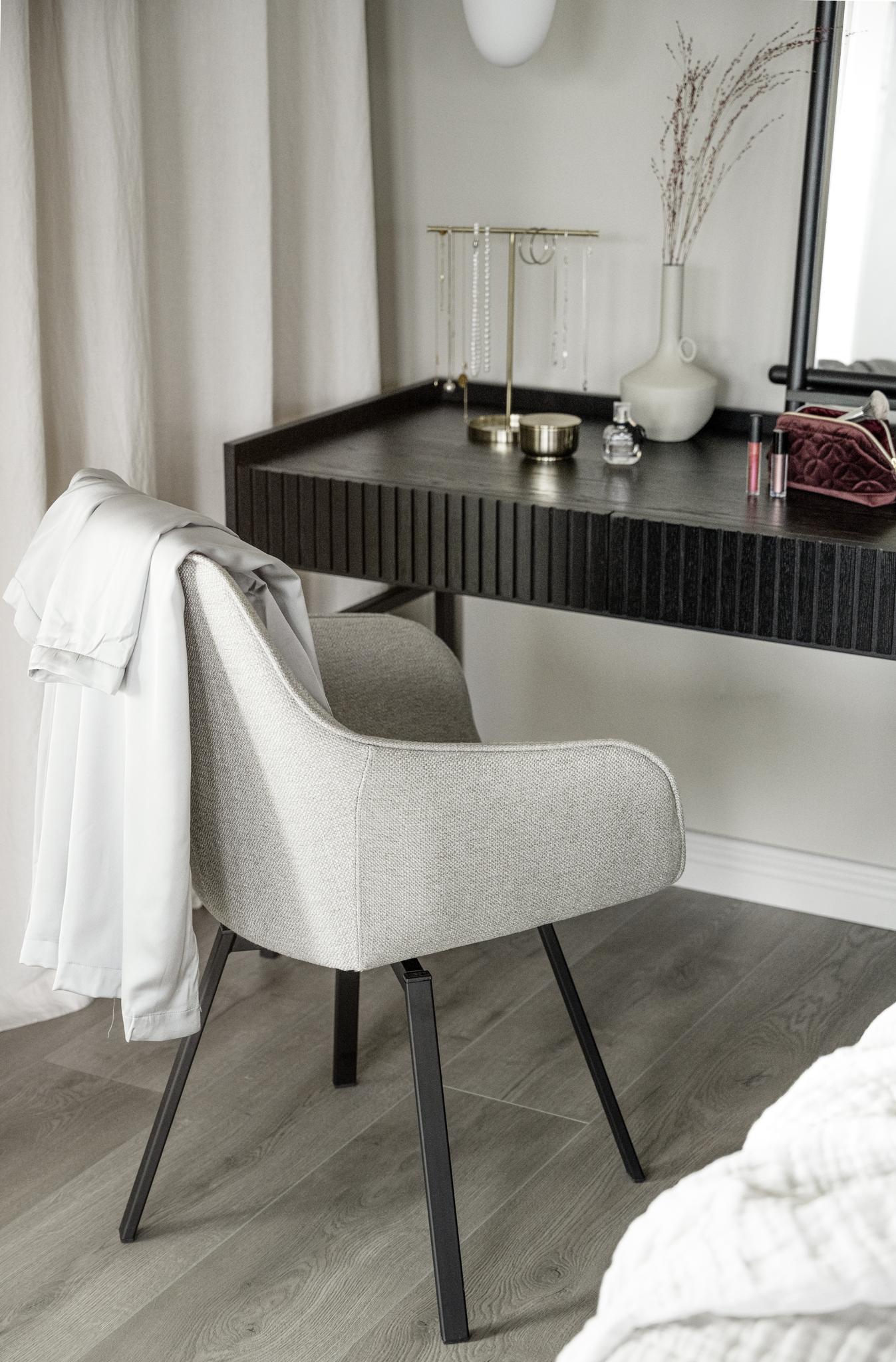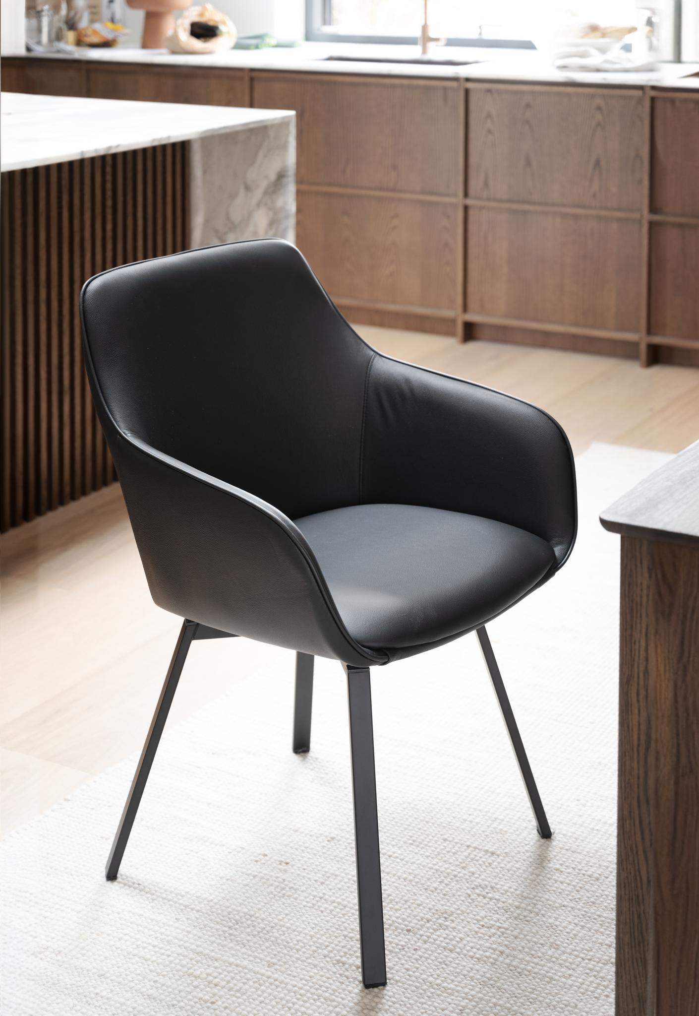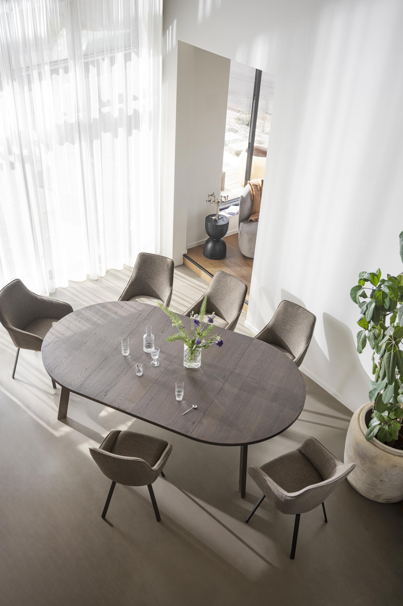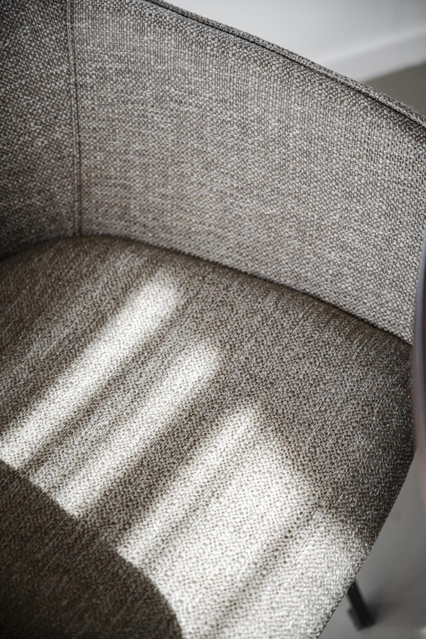 Alison karmstol i ljusbeige tyg har precis som populära Alison stol ett snurrbart underrede i 360 grader. Den kupade stoppade sitsen och de höga armstöden gör stolen bekväm och ombonad att sitta i. Alison har ett tåligt ljusbeige tyg i samma jordnära färg som Alison stol för att kunna matchas tillsammans på ett smakfullt sätt. Träet inuti sitsen består av 100 % FSC®-certifierat trä och benen består av svart pulverlackad metall.