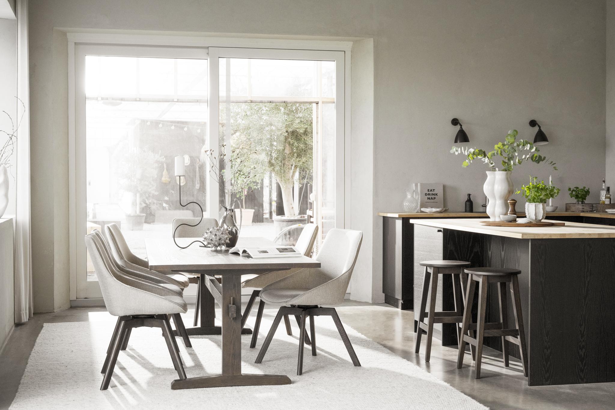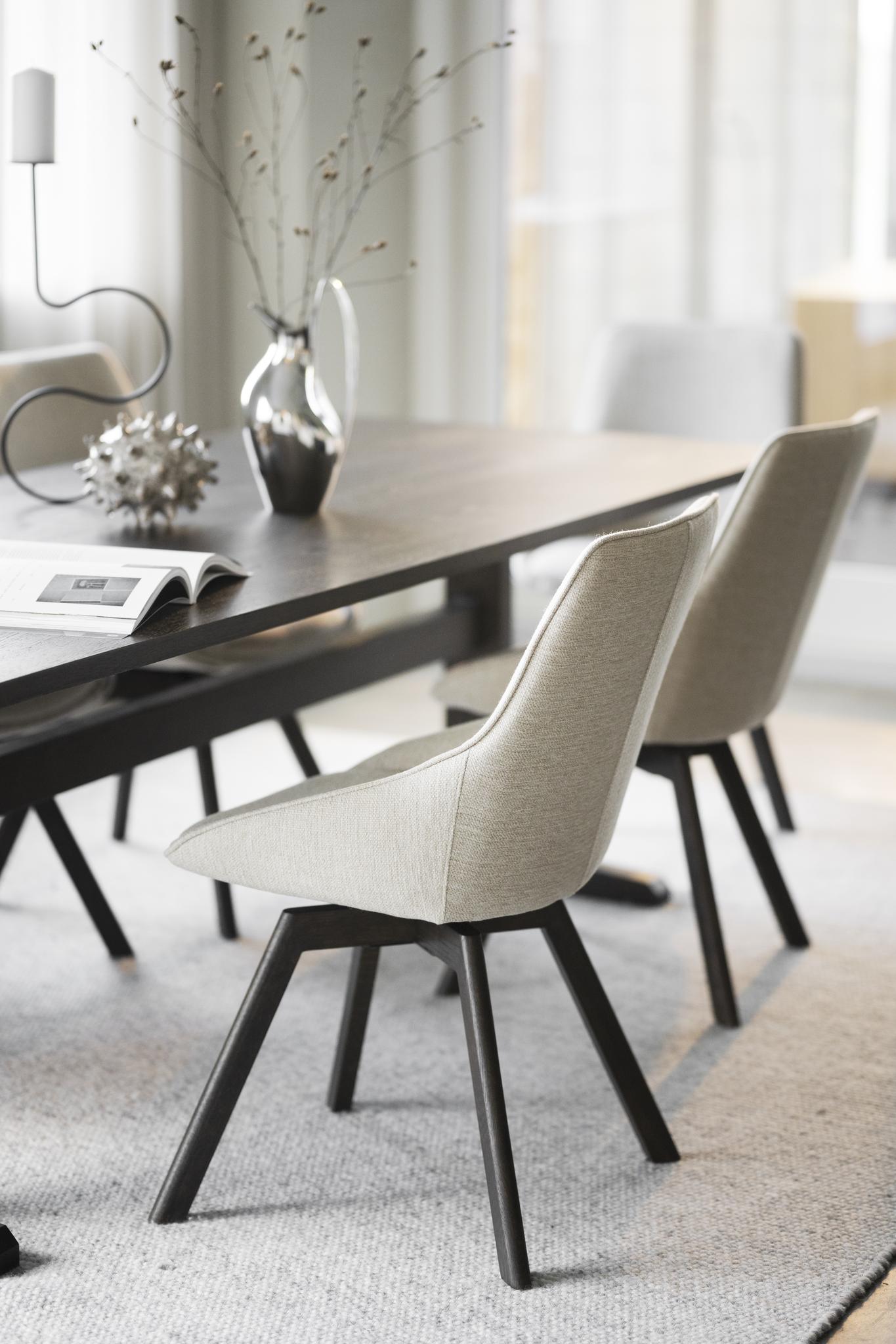 • Moderna matstolar med beige tyg och svarta ben vid matbord i ljust skandinaviskt hem