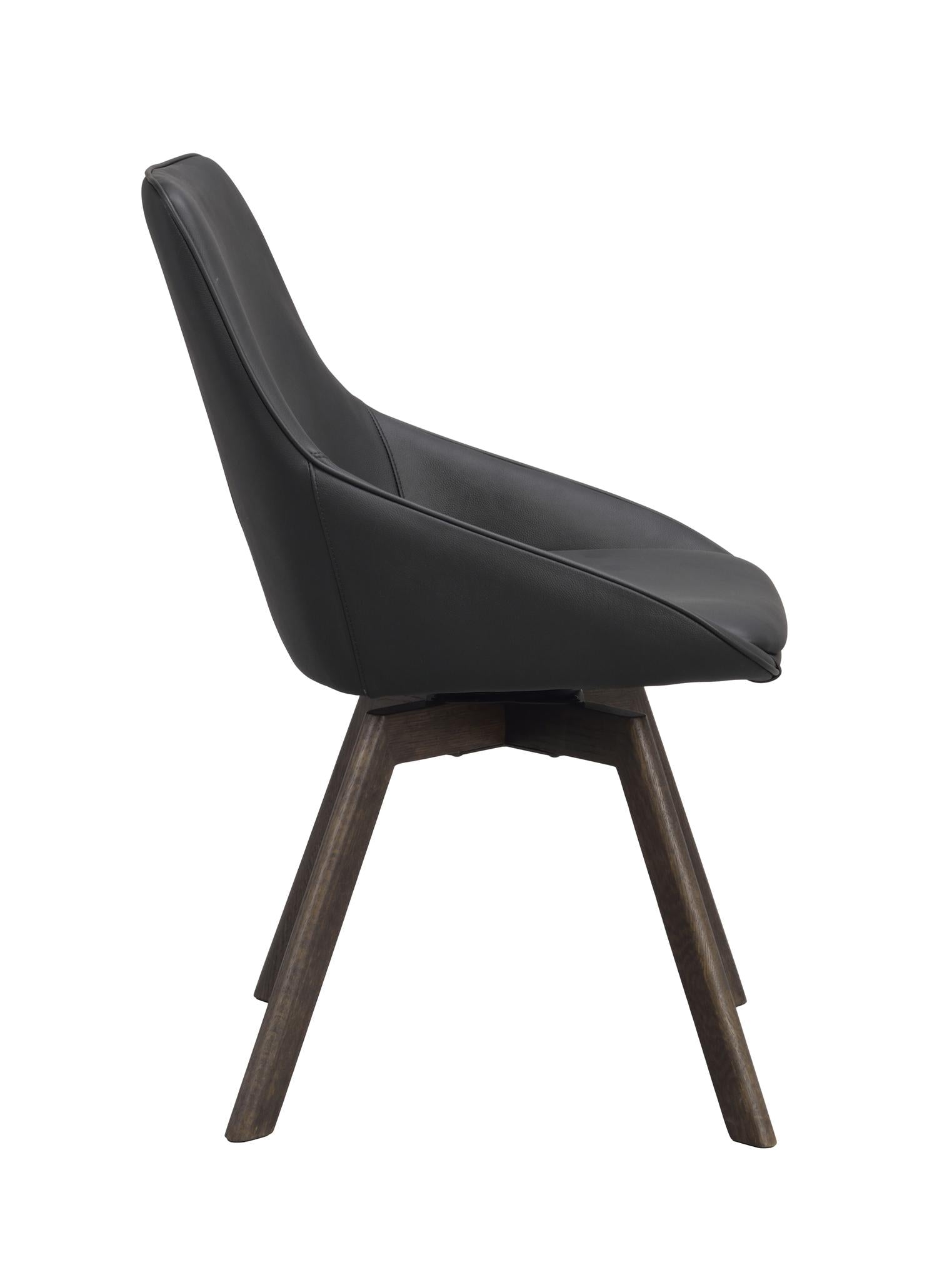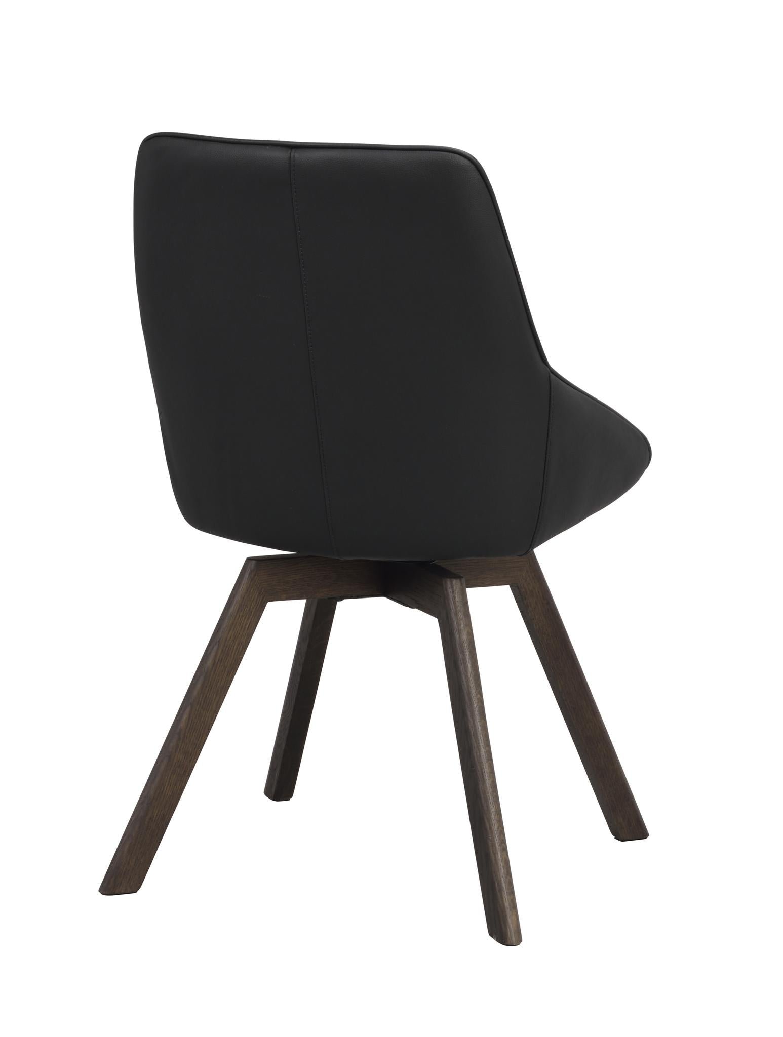 • Svart matstol med stoppad sits och rygg i konstläder på mörkbruna träben, sedd bakifrån