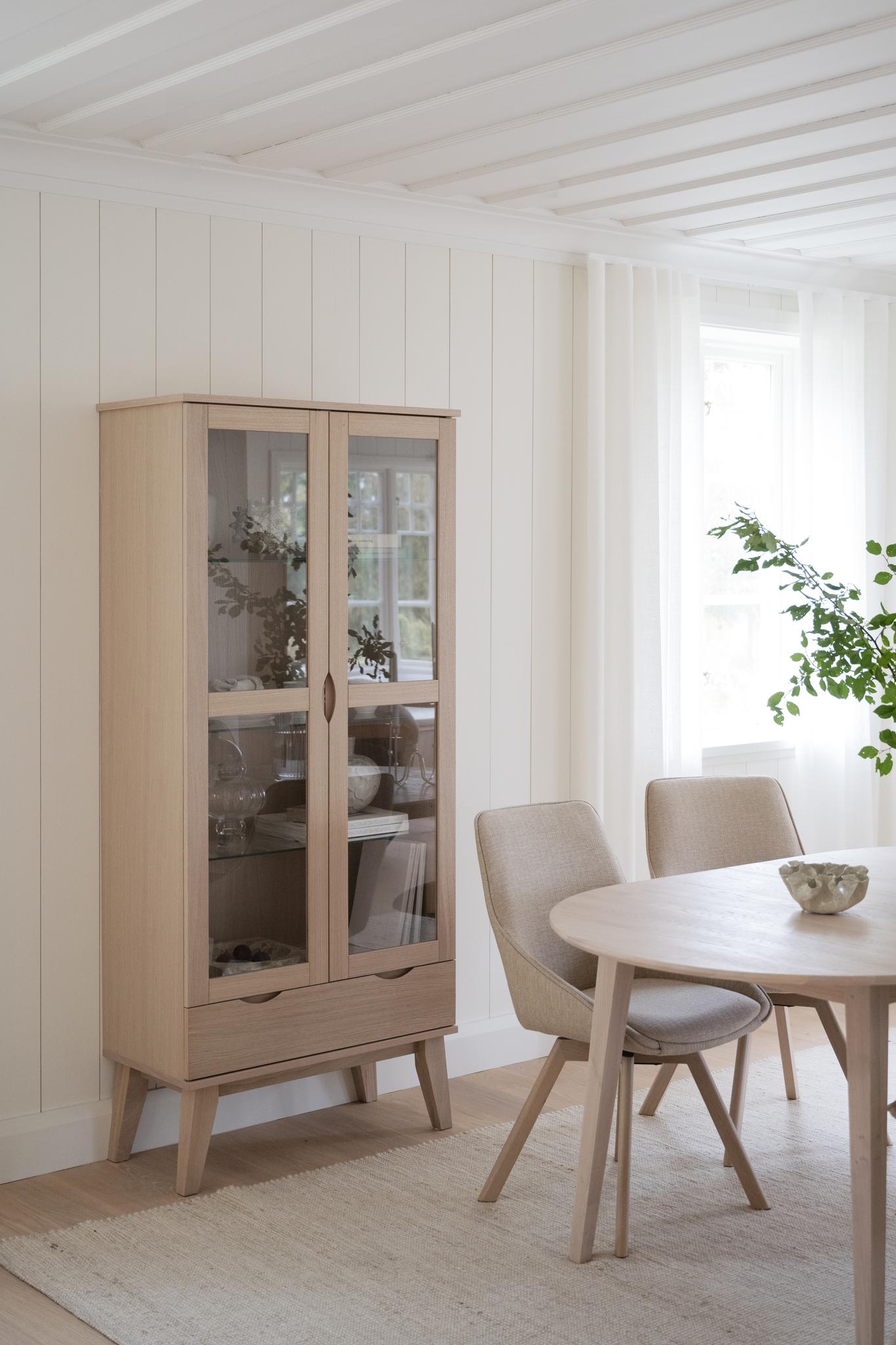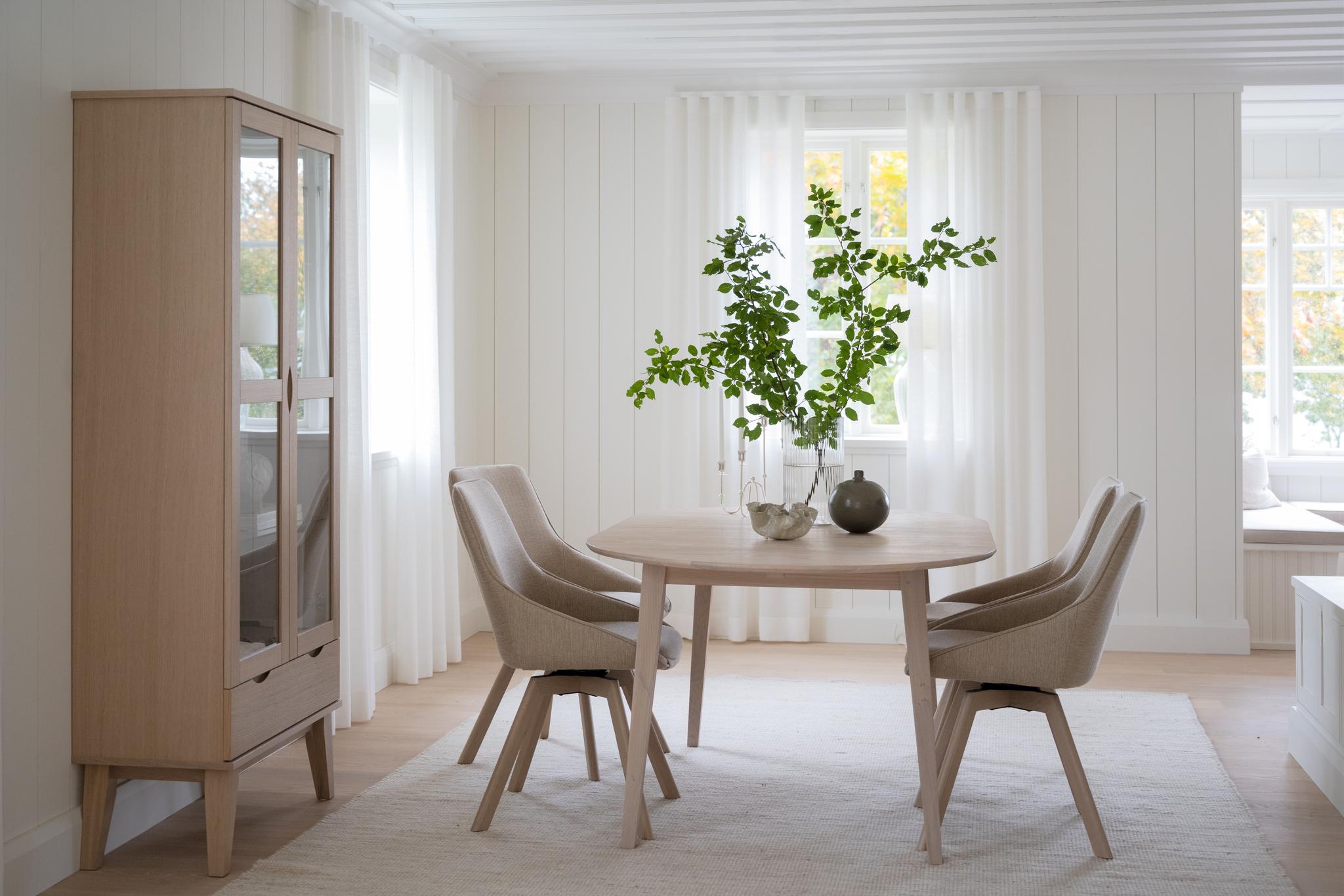 • Ljus matplats med runt matbord, fyra stolar och vitrinskåp i ljust trä med naturlig skandinavisk stil