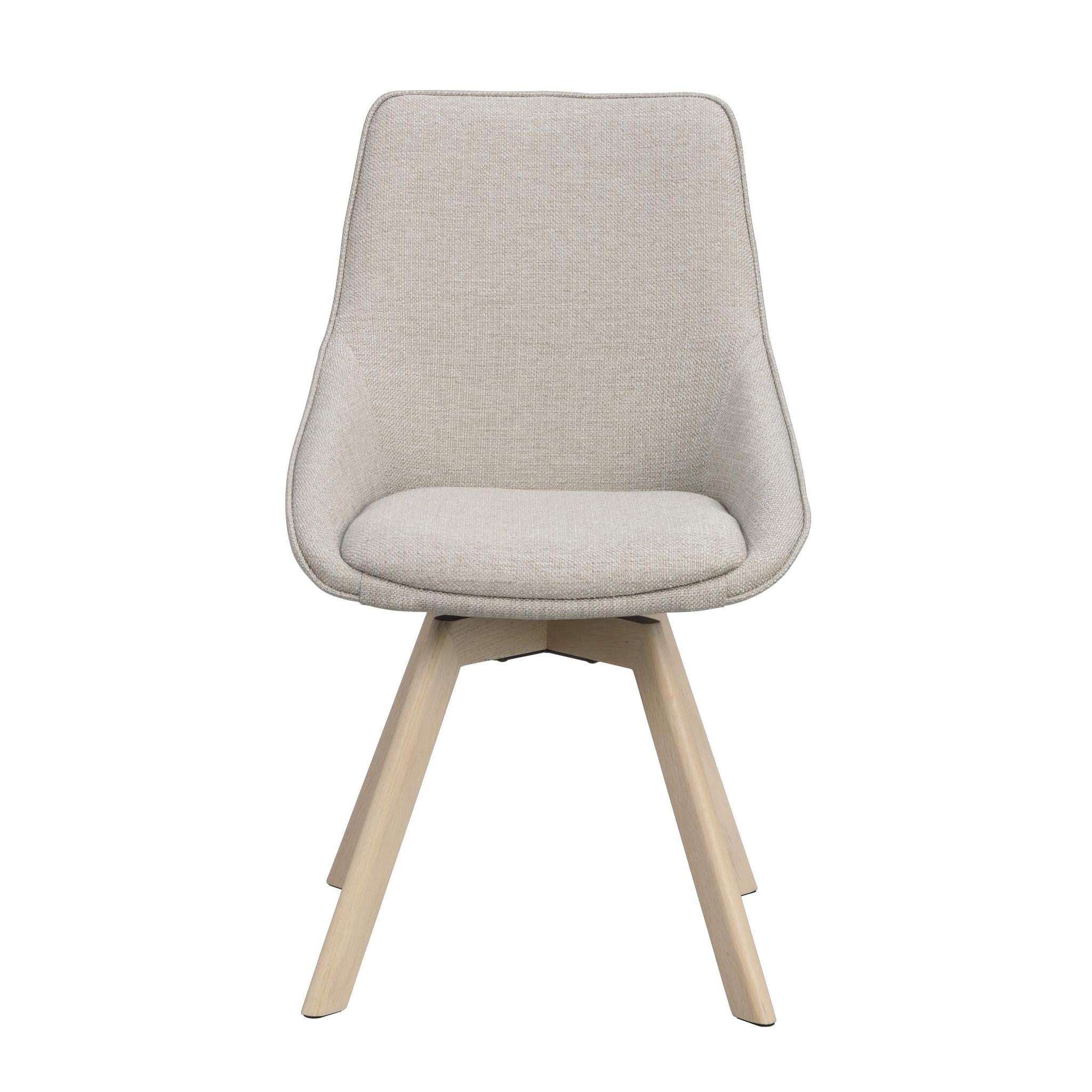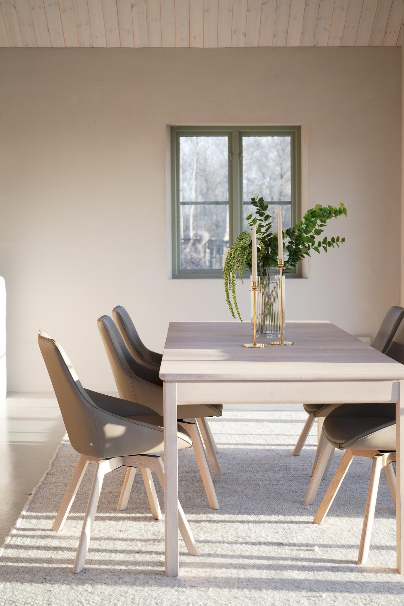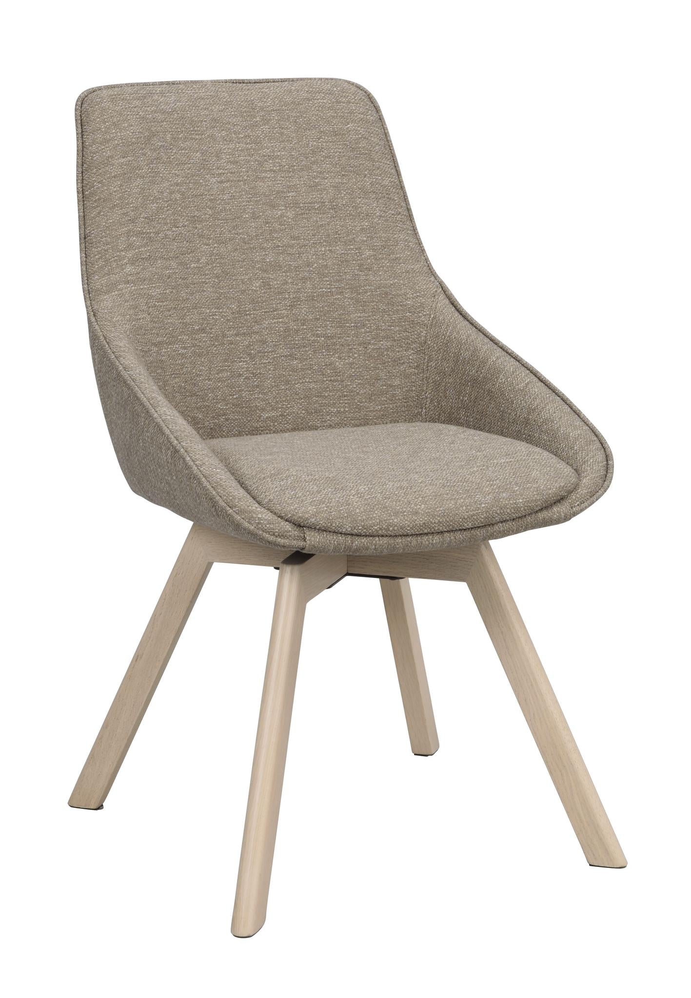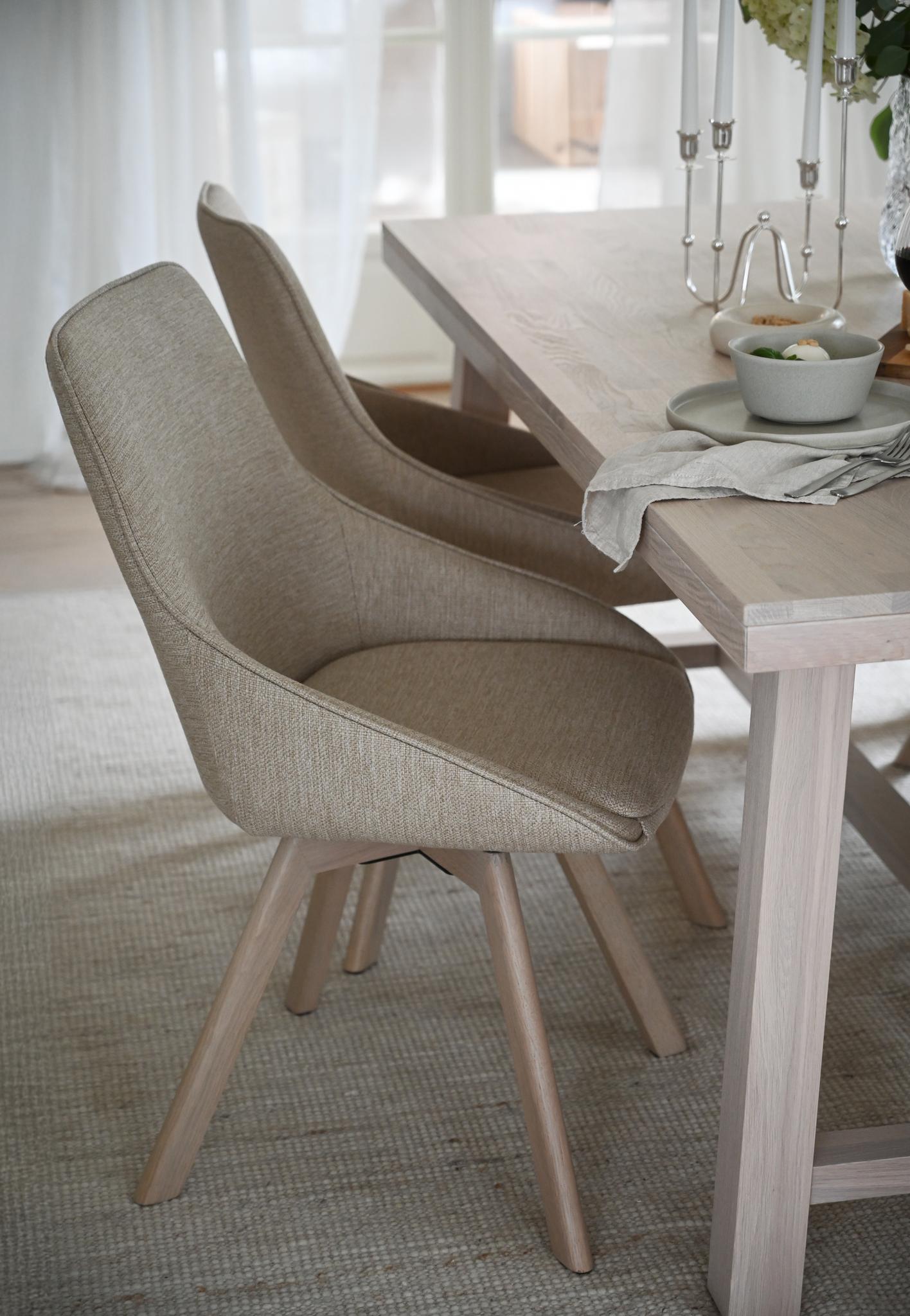 Populära Alison stol med träunderrede och snurrfunktion. Här syns den i ett tåligt ljusbeige tyg och med ben i vitpigmenterad ek. Alison har en stoppad sits med hög sittkomfort i kupad design och ben med snurrfunktion i 360 grader. Stolen passar perfekt runt matbordet men även som udda stol till skrivbordet. Alison är FSC®-certifierad och finns även i andra jordnära färger.