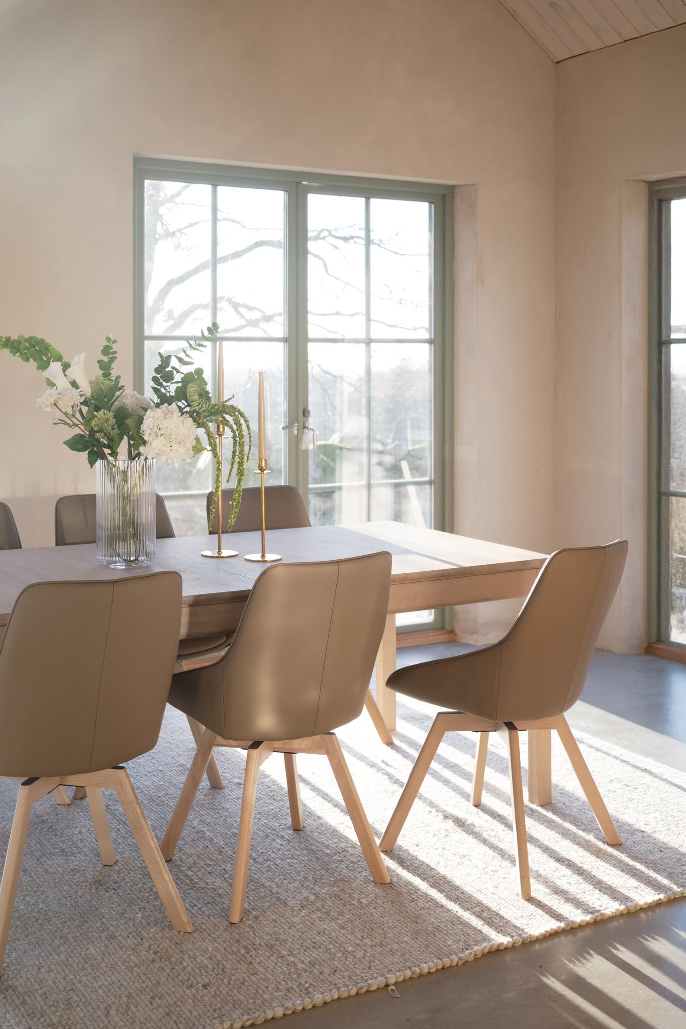 • Matbord i trä med beiga stolar i modern matsal med stora fönster och naturligt ljus