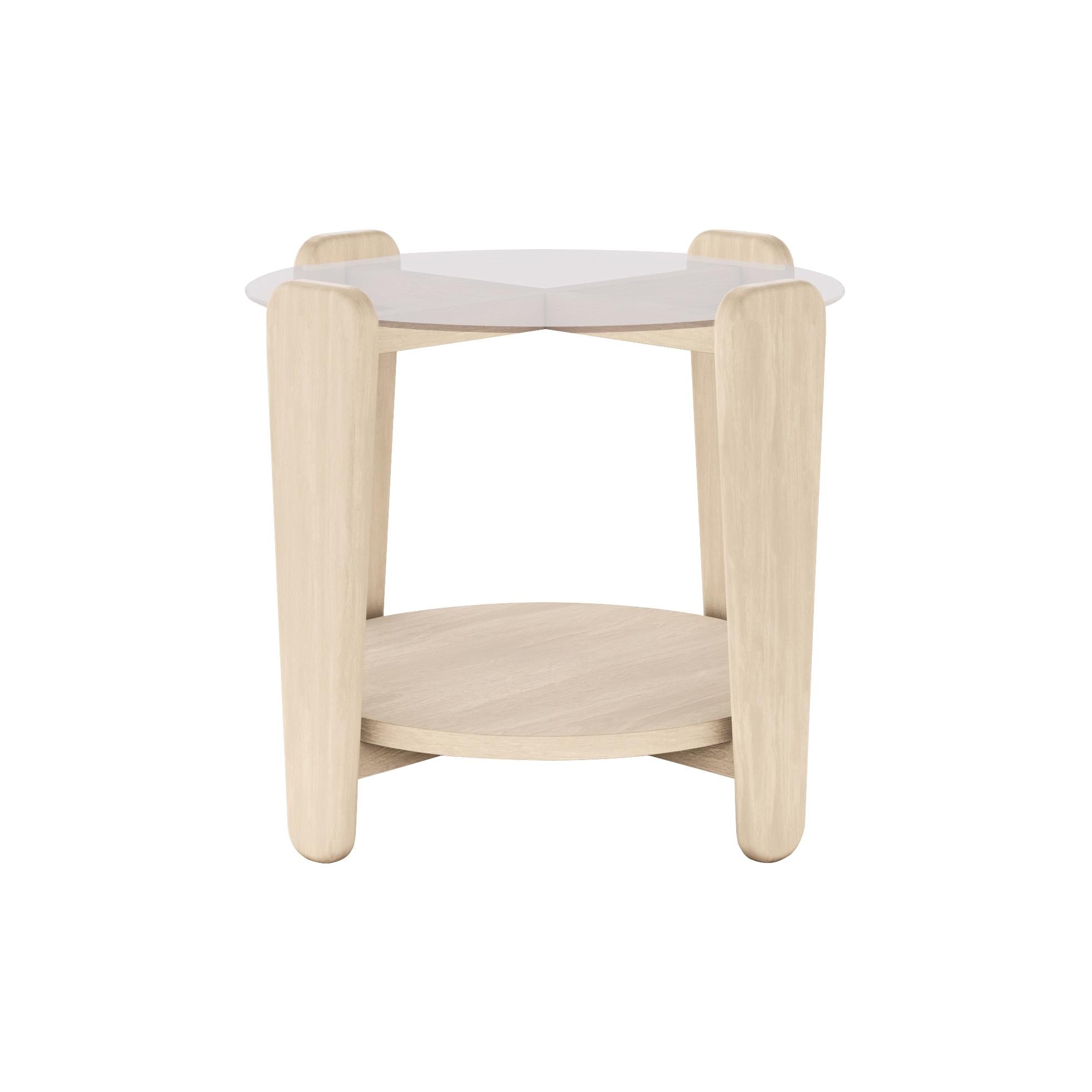 • Soffbord i ljust trä med glasskiva, rund hylla och minimalistisk design i skandinavisk stil