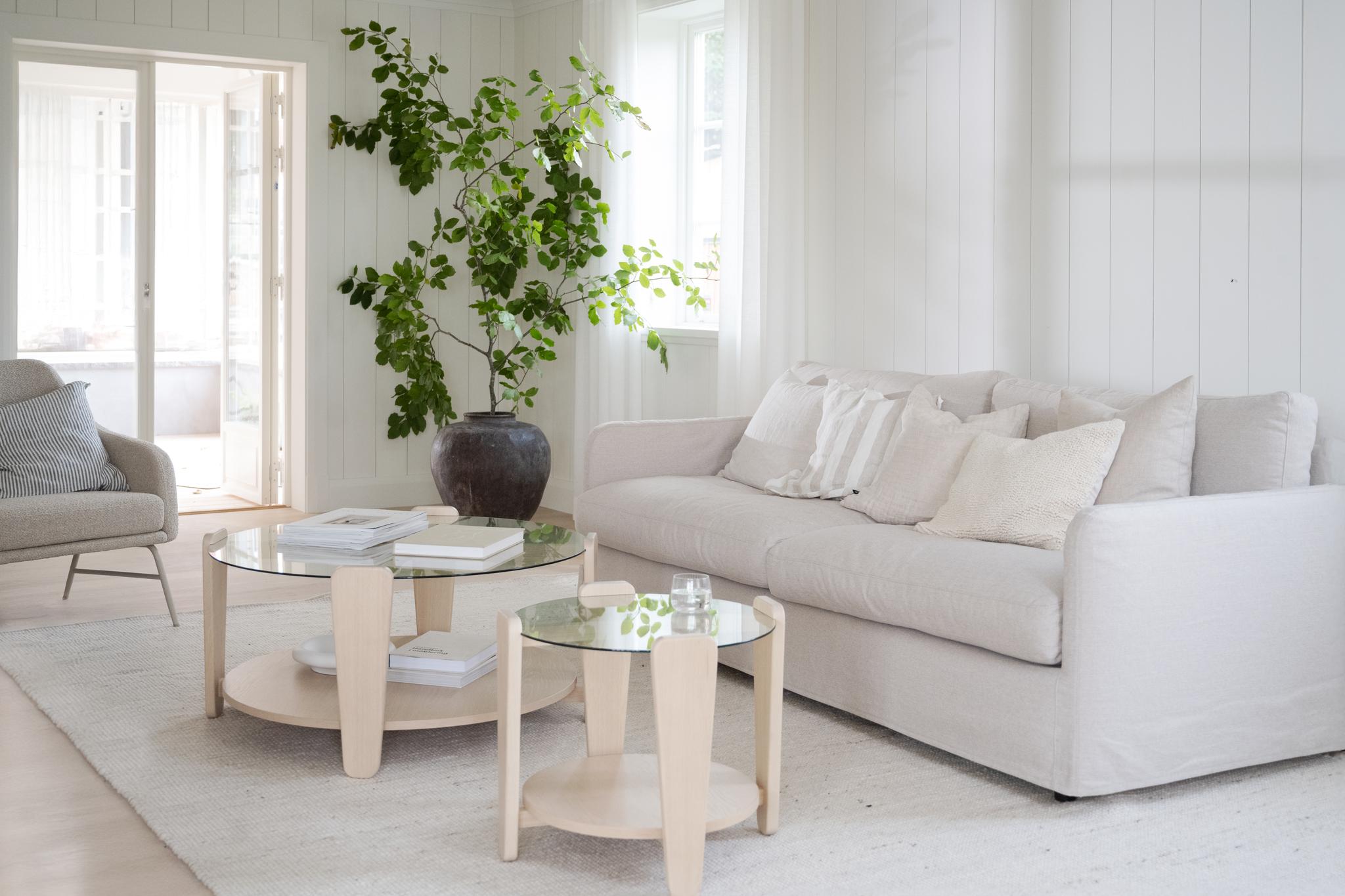 • Ljust vardagsrum med beige soffa, runda soffbord i ljust trä med glasskiva och grön krukväxt