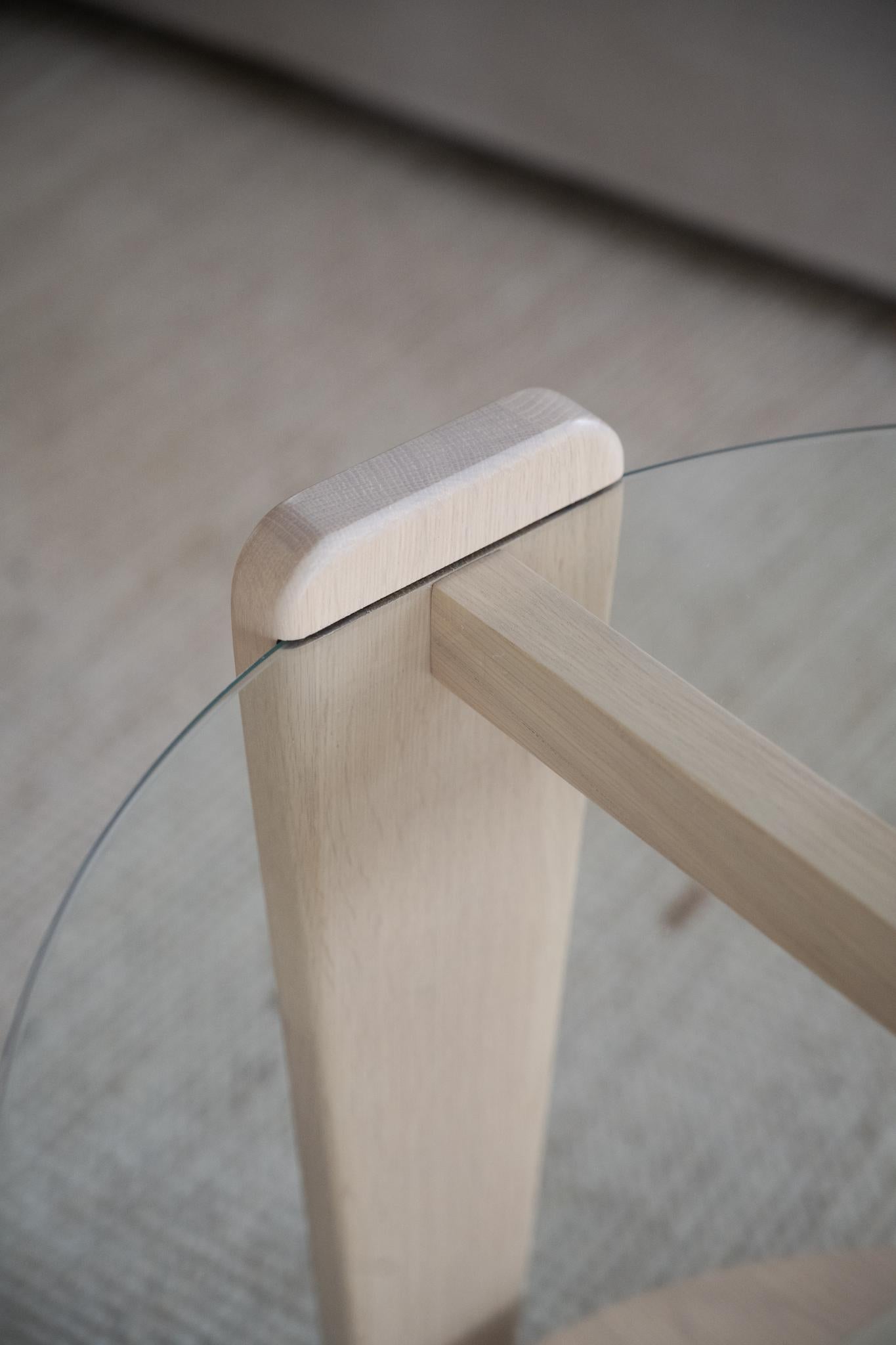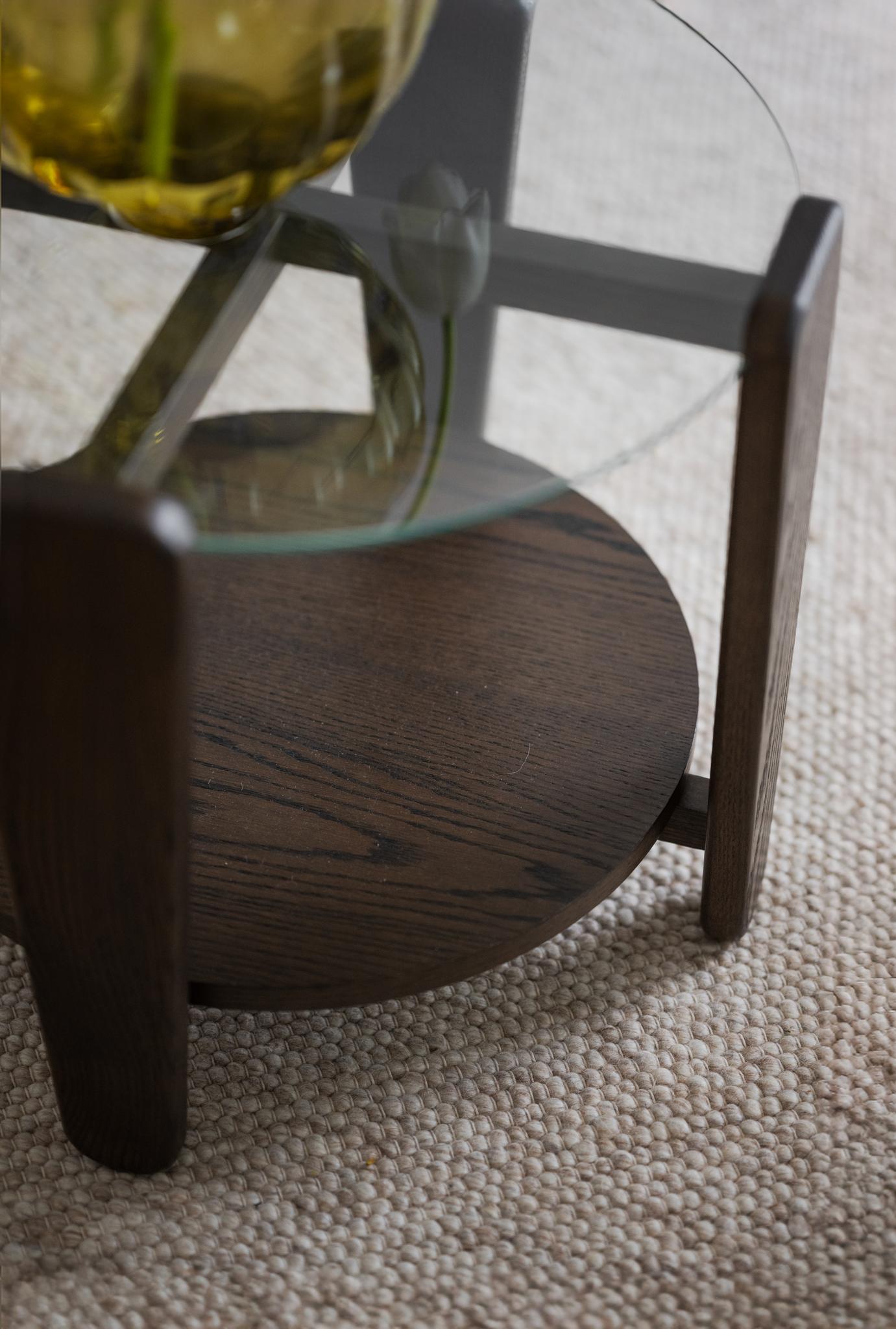 • Soffbord i mörk ek med glasskiva och rundad hylla, detalj av ben och konstruktion på ljus matta