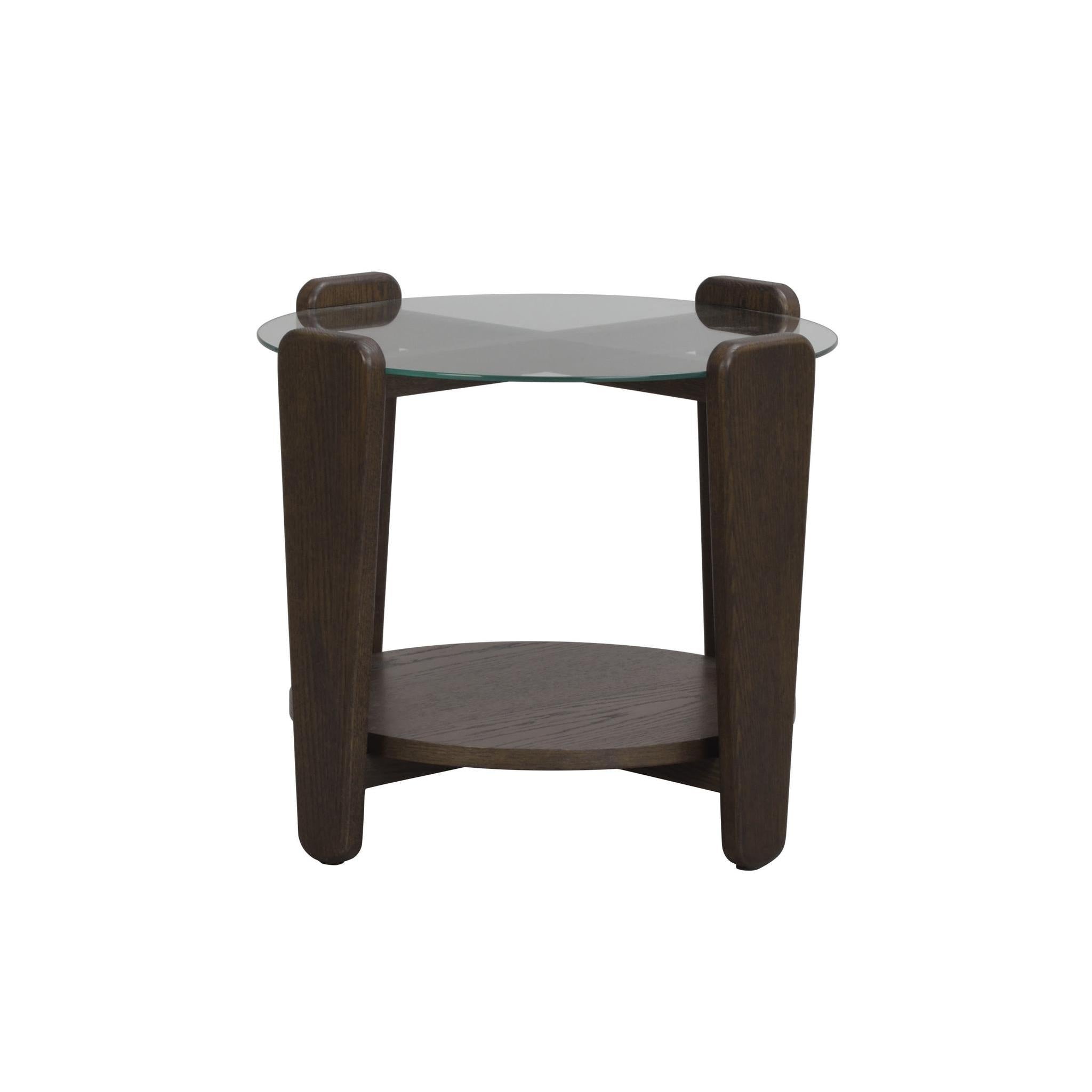 • Runt soffbord i mörkbrun ek med glasskiva och hylla, moderna ben i trä