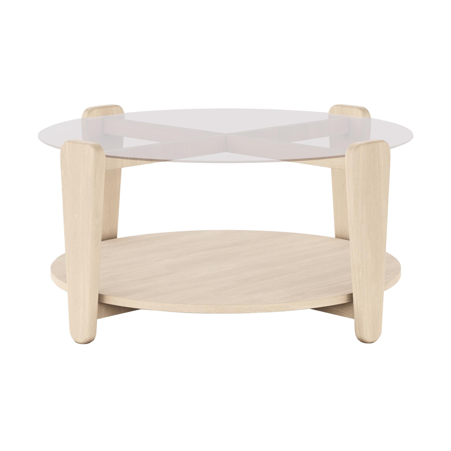 • Runt soffbord med genomskinlig glasskiva och ljust trä, två våningar med öppen förvaring