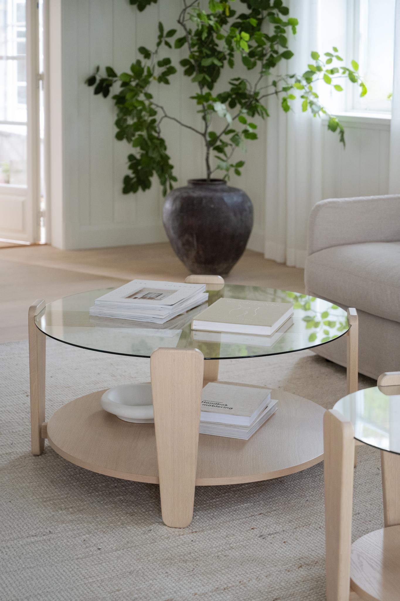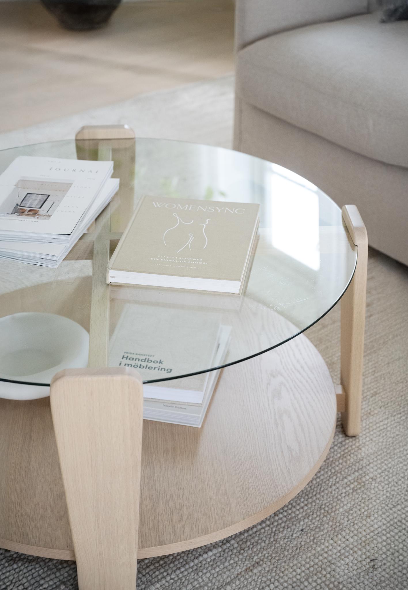 • Runt soffbord i ljust trä med glasskiva och böcker, skandinavisk design för vardagsrum