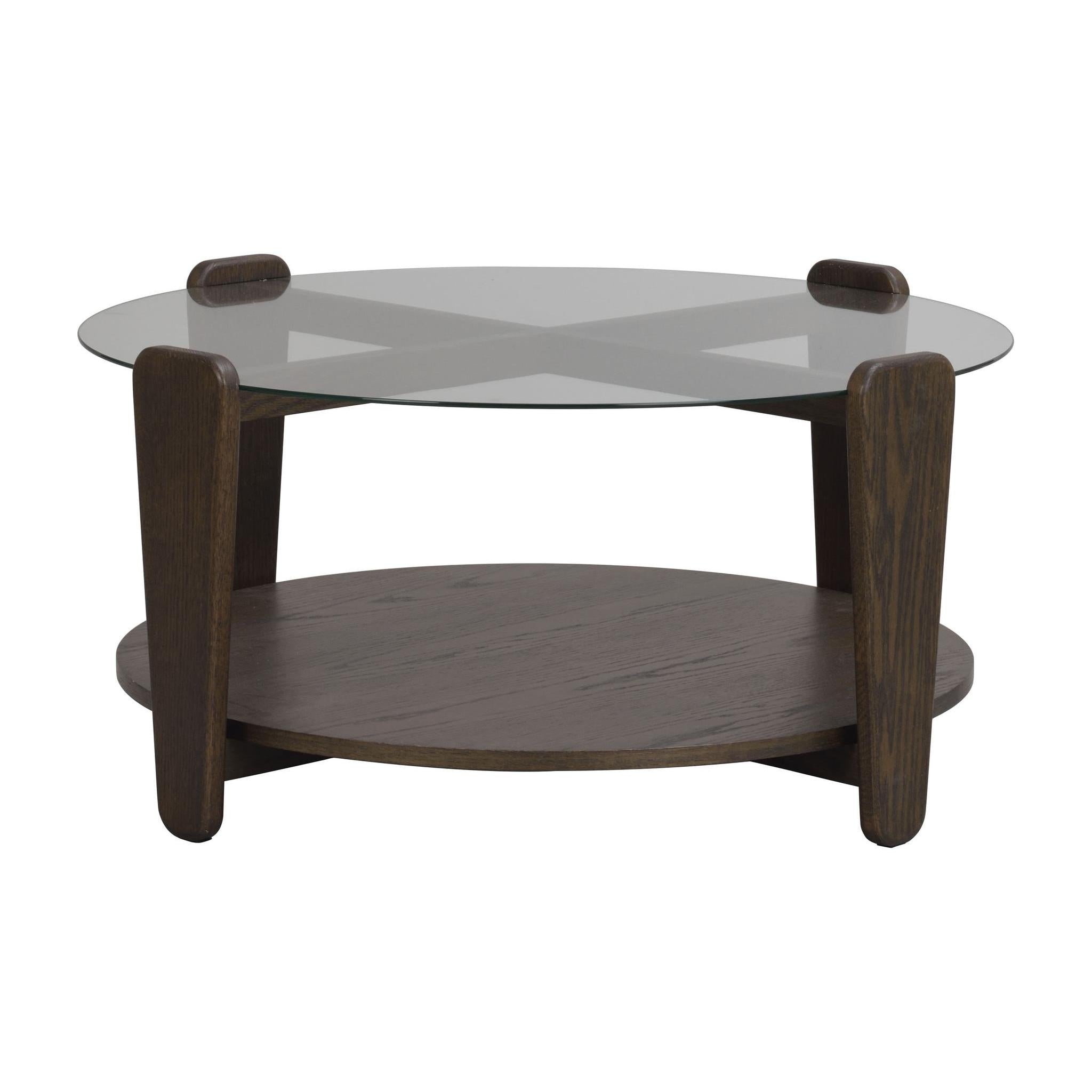 • Runt soffbord med glasskiva och mörkbrun träram, två nivåer för förvaring