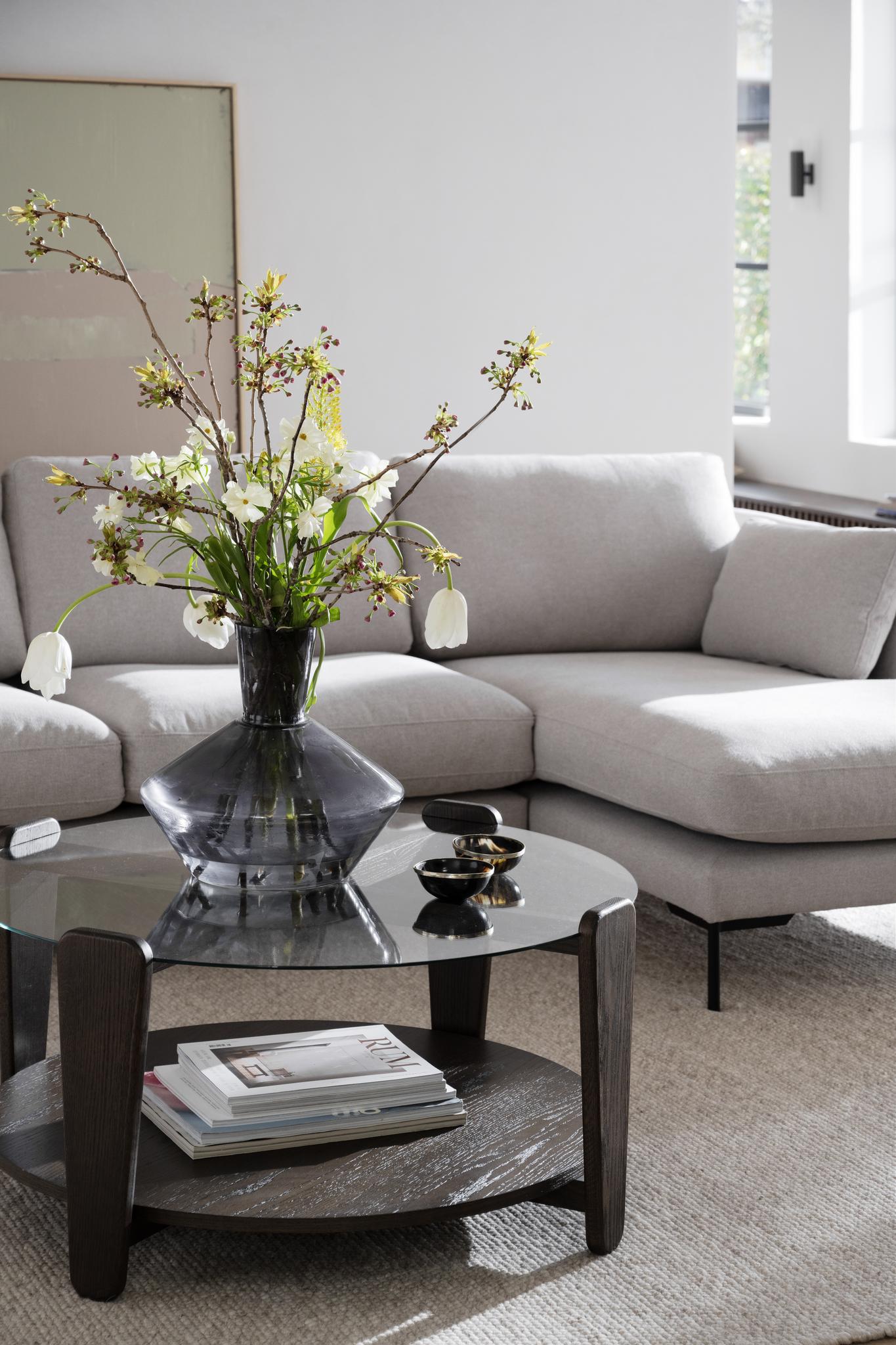 • Ljust vardagsrum med beige soffa, runda soffbord i trä med glas och grön växt i vas