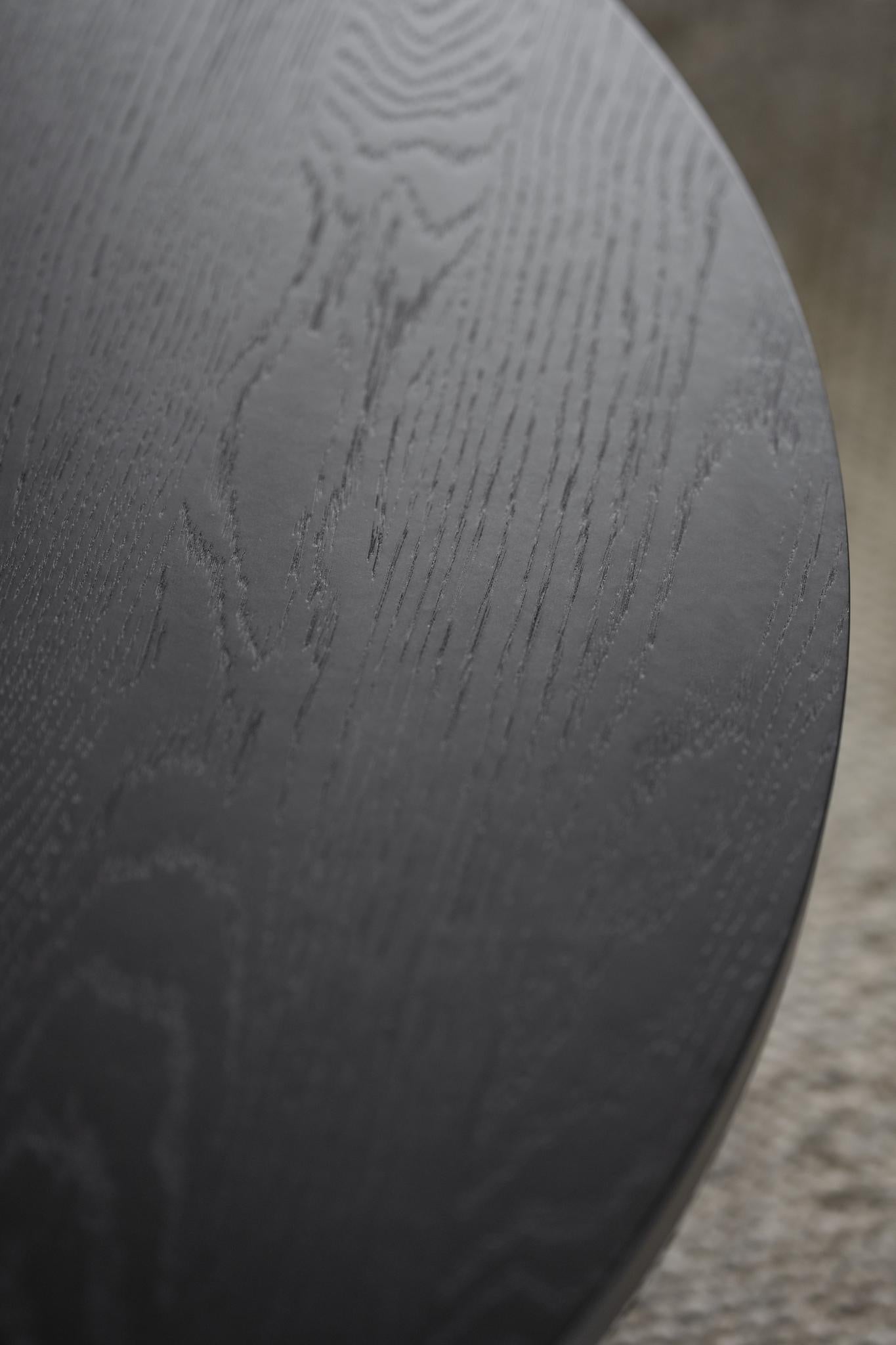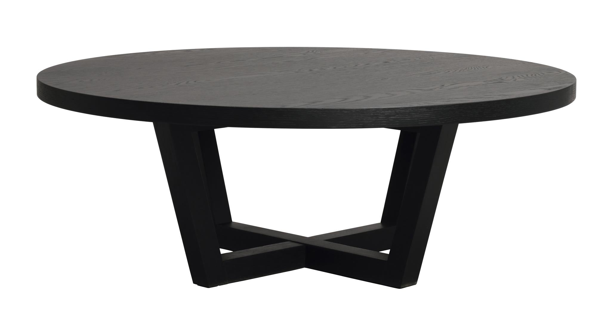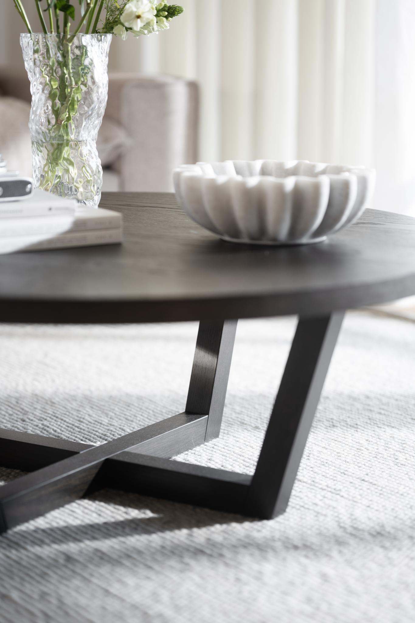 • Runt soffbord i svart trä med korslagda ben och modern design