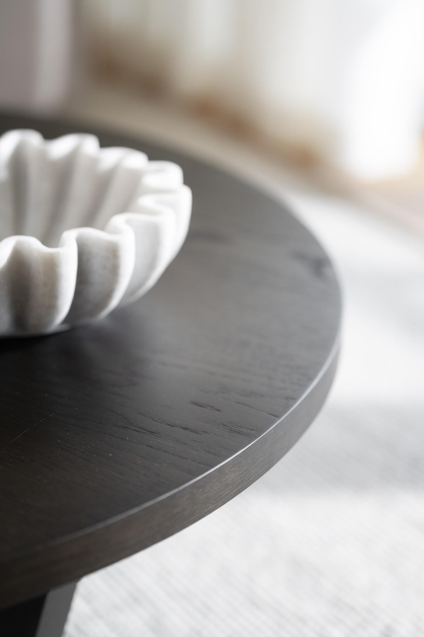 • Runt soffbord i mörkt trä med korsade ben, dekorerat med vas med blommor och vit skål
