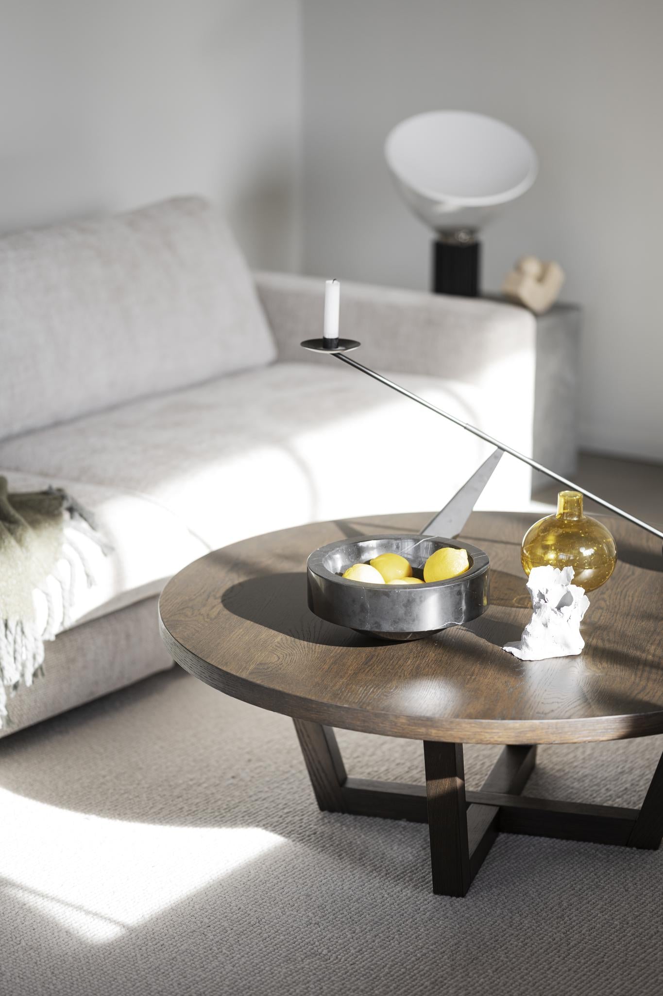 • Runt soffbord i mörk ek med dekorativa föremål, grå soffa och modern lampa i minimalistisk vardagsrumsinredning