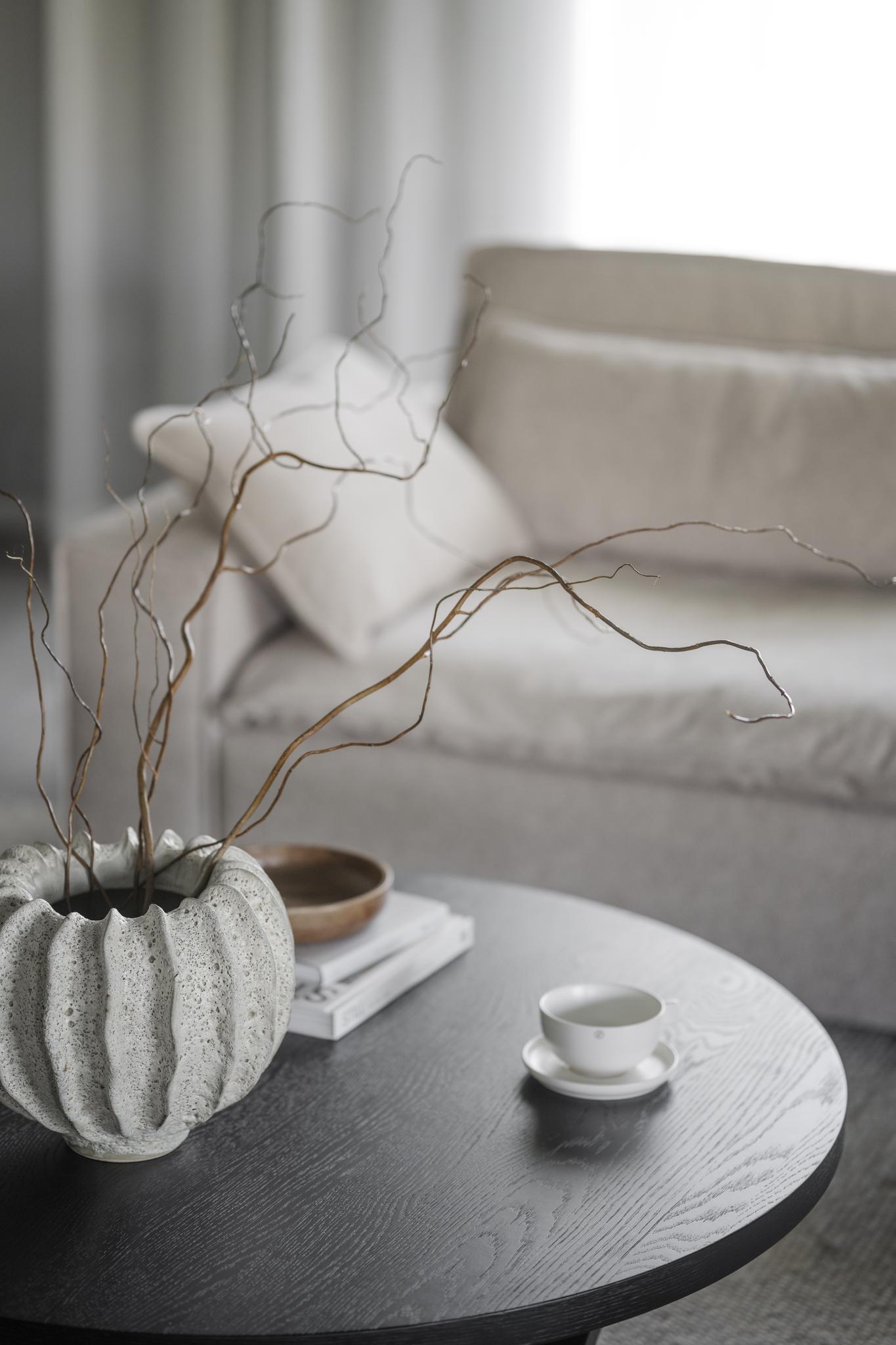 • Grå spräcklig keramikvas med dekorativa kvistar på runt soffbord i vardagsrum med vit kaffekopp