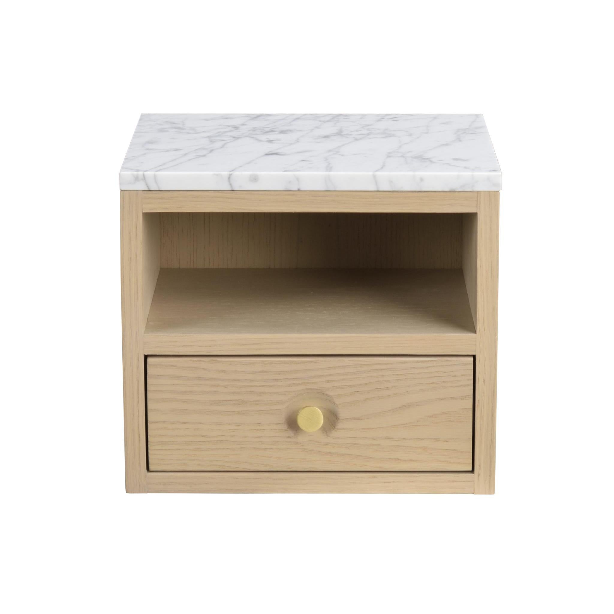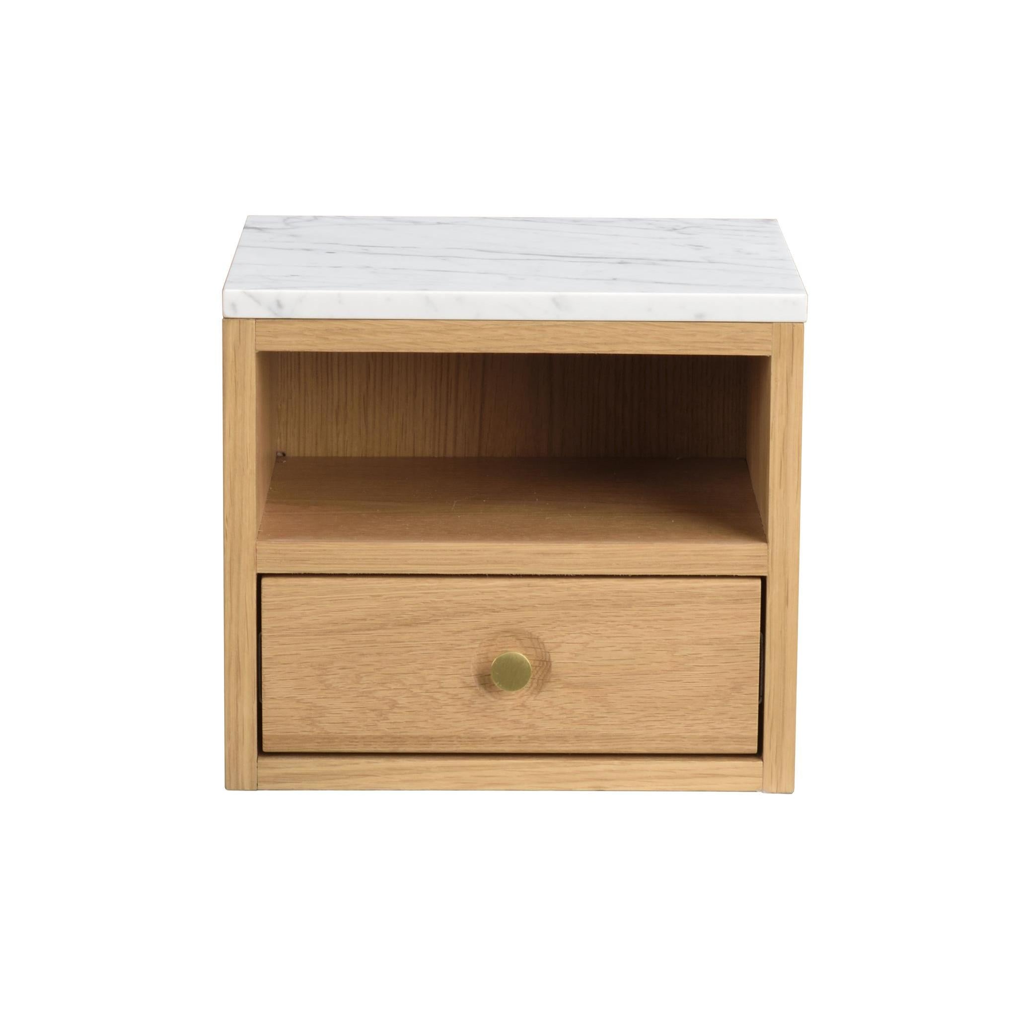• Sängbord i ek med marmorskiva, öppen hylla och en låda med rund mässingsknapp