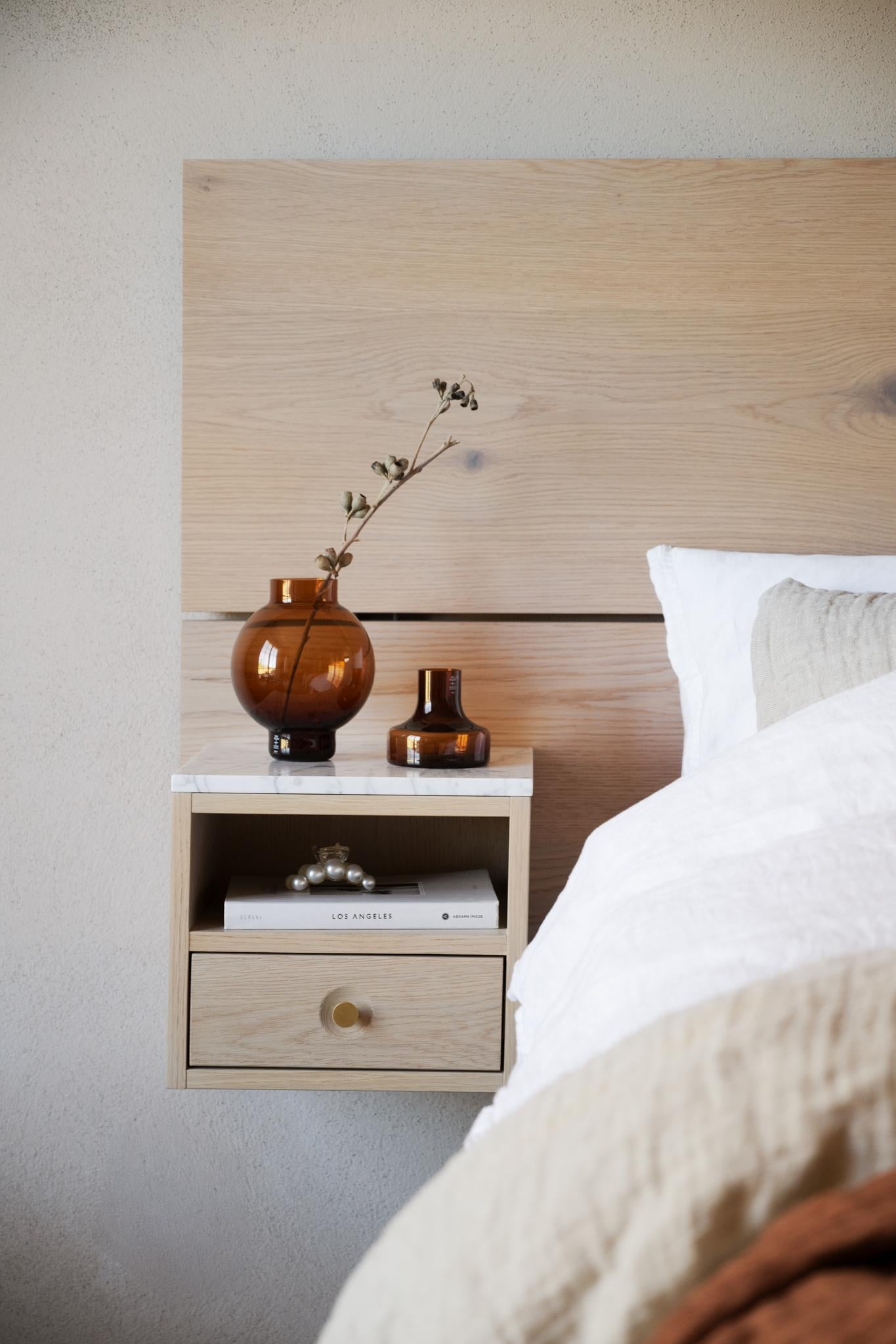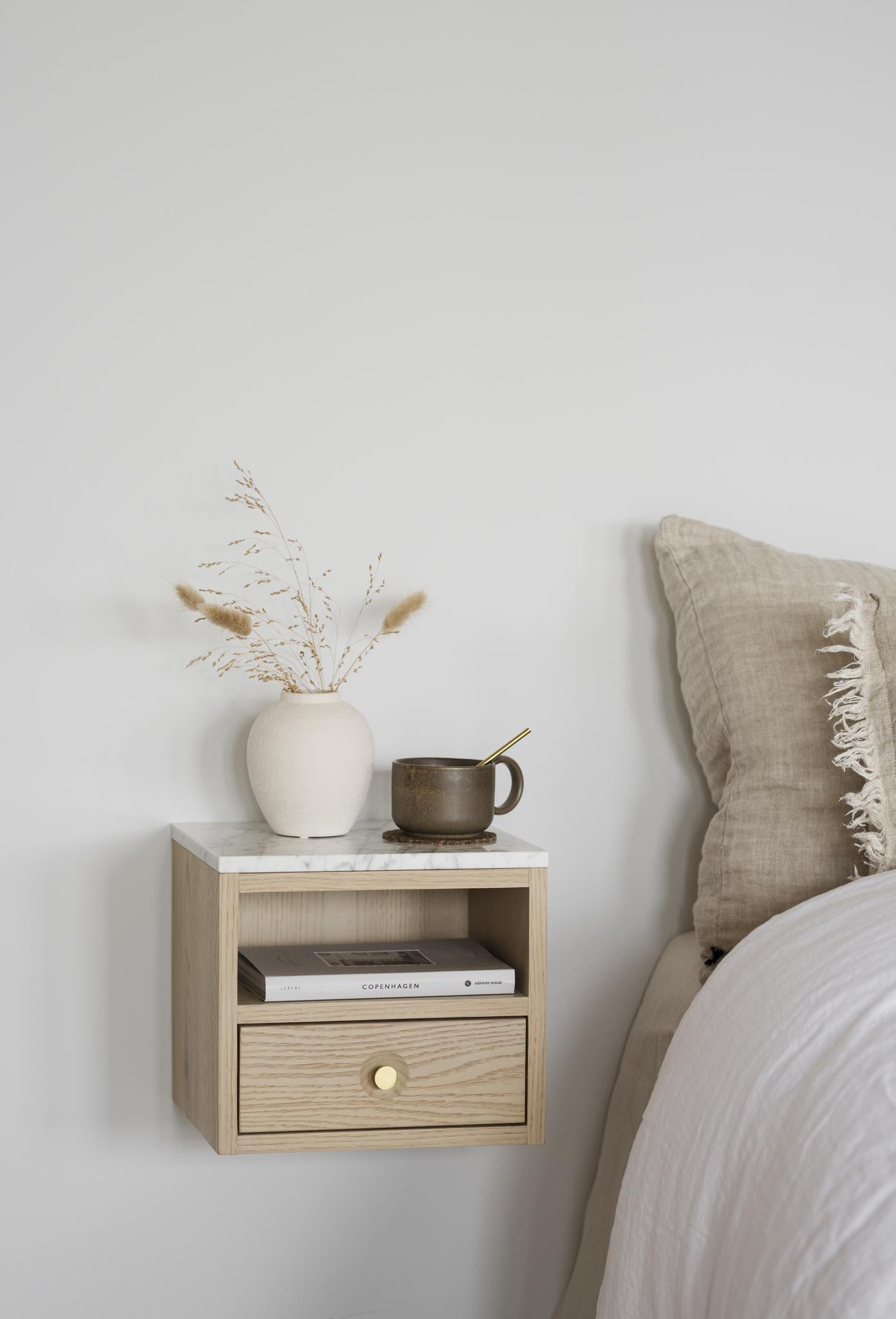 • Vägghängd sängbord i ljust trä med låda och öppen hylla bredvid säng med linnekudde