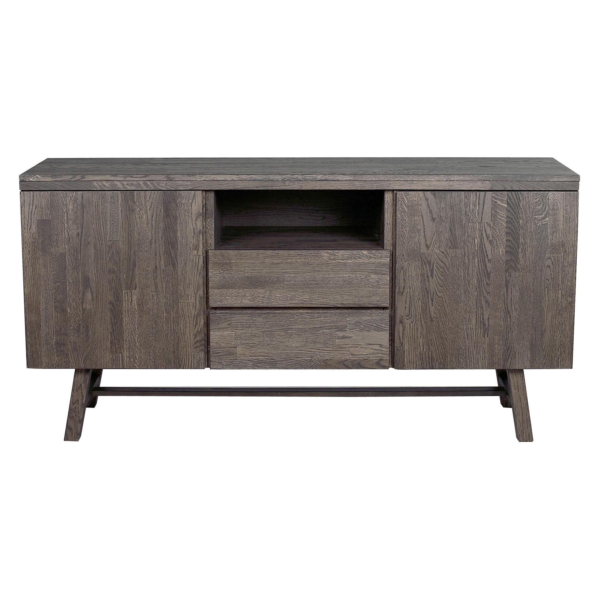 • Grå sideboard i trä med två skåpsdörrar, två lådor och öppen hylla på korsformade ben